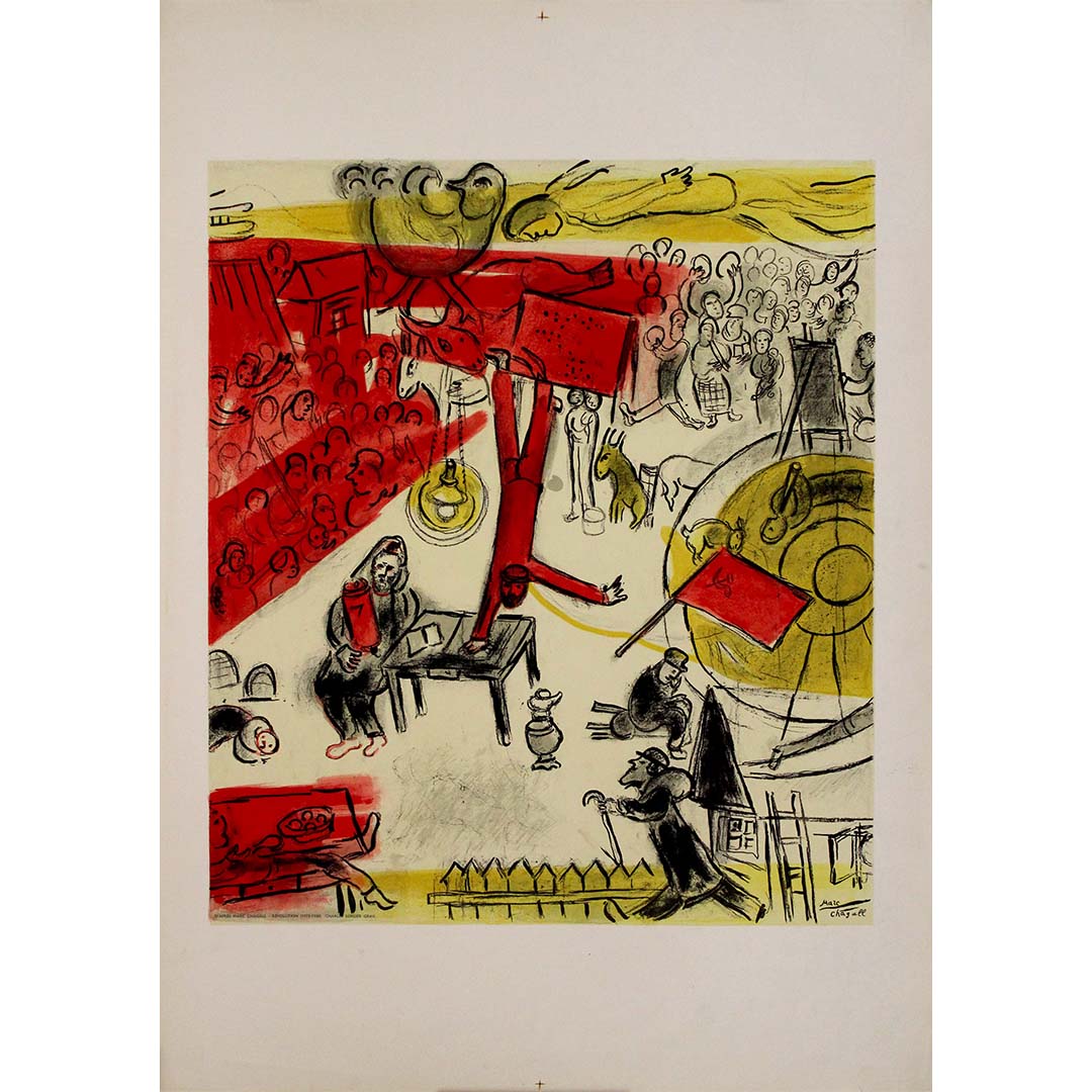 En 1963, le musée Galliera à Paris a accueilli l'exposition Les Peintres Témoins de Leur Temps (Les peintres témoins de leur temps), un événement majeur qui a réuni certains des artistes les plus influents du XXe siècle. Parmi les œuvres présentées figurait une affiche originale de Marc Chagall, créée à l'occasion de l'exposition. Affiche avant la lettre — une affiche avant l'ajout du texte. Cette affiche, véritable œuvre d'art, est depuis devenue une pièce précieuse, incarnant l'esprit de l'exposition et la vision artistique unique de Chagall.