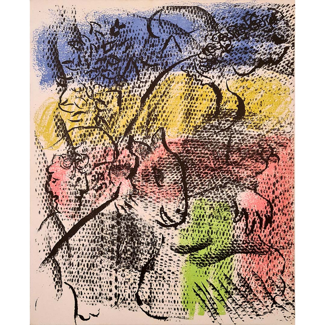Bien plus qu'une simple estampe, cette œuvre capture l'essence poétique de l'univers de Chagall, où l'affection, le souvenir et l'innocence rurale semblent suspendus dans le temps. Une lithographie exquise et de collection, témoin d'une période charnière de l'histoire de la gravure au XXe siècle.