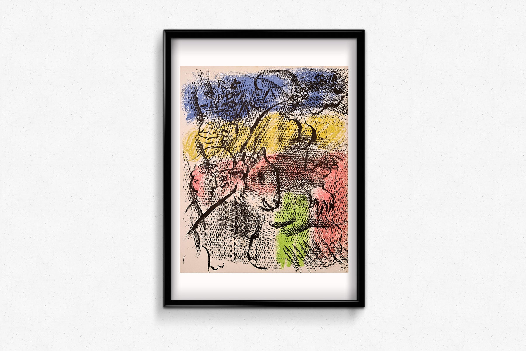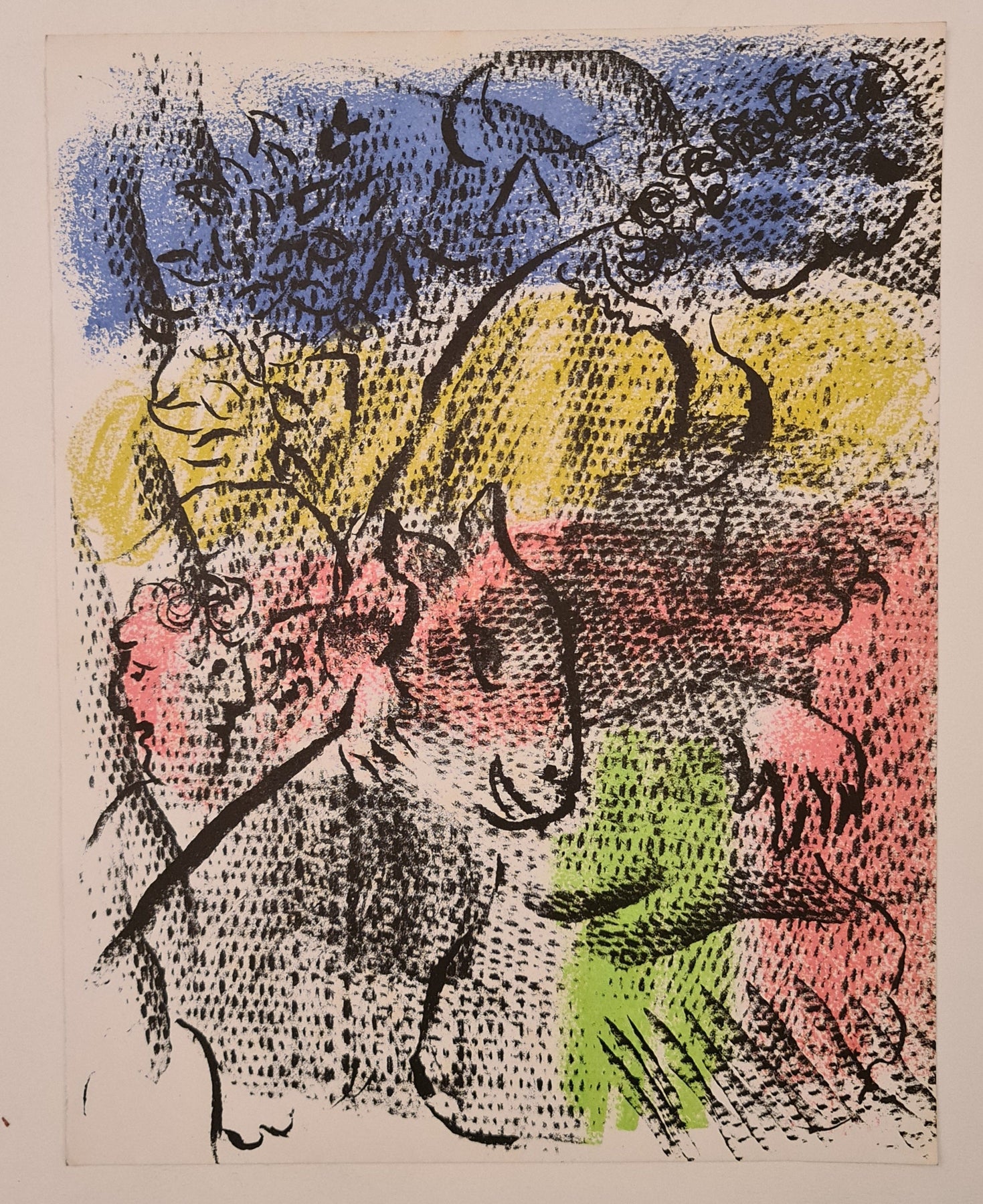 Réalisée à l'encre lithographique riche et imprimée par le célèbre atelier Mourlot à Paris, cette composition resplendit de couleurs – rose, citron, lapis-lazuli et vert tendre – tout en conservant la spontanéité libre et fluide du trait de l'artiste. La chèvre, motif récurrent dans l'œuvre de Chagall, y apparaît presque folklorique : douce, surréaliste et empreinte de spiritualité.