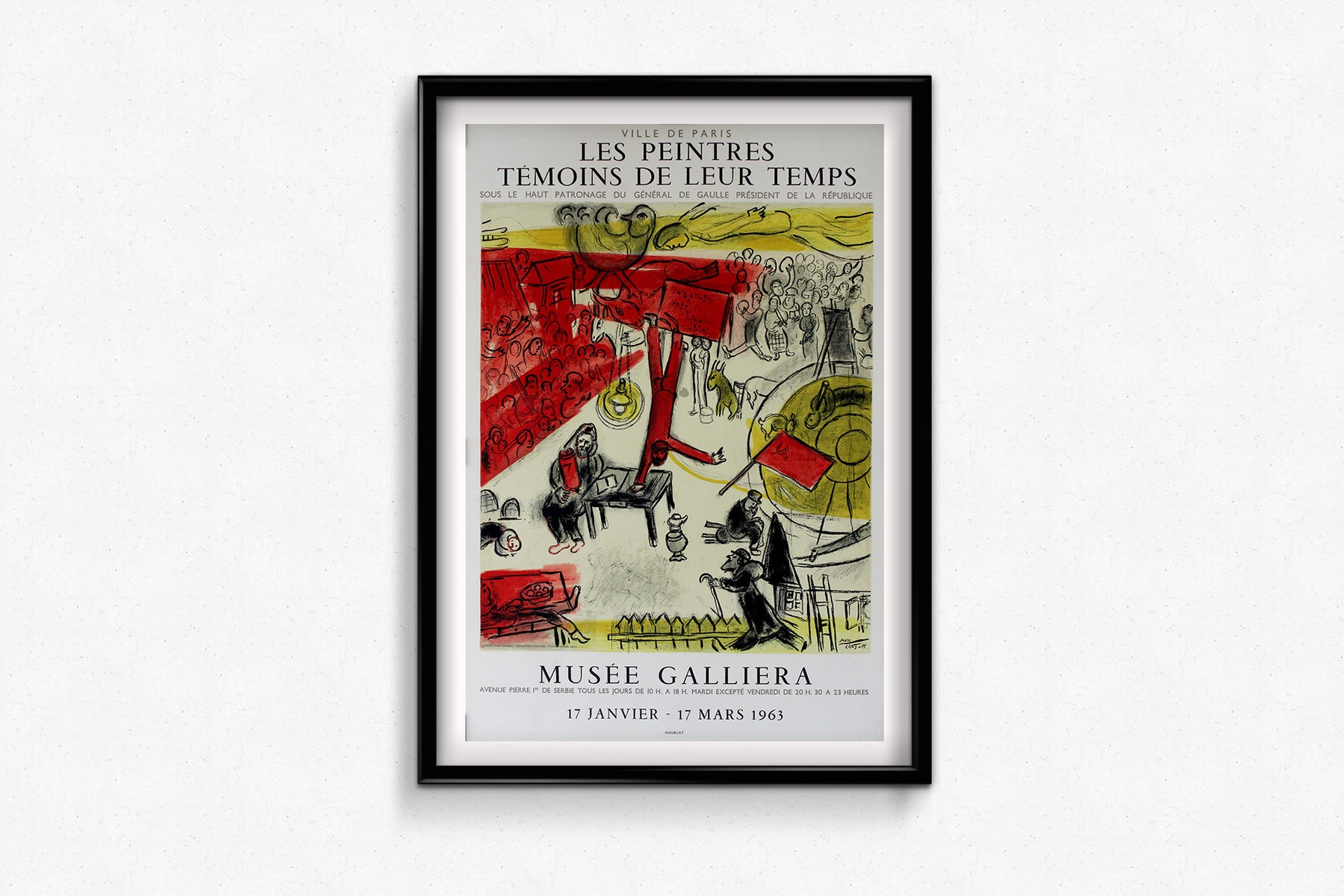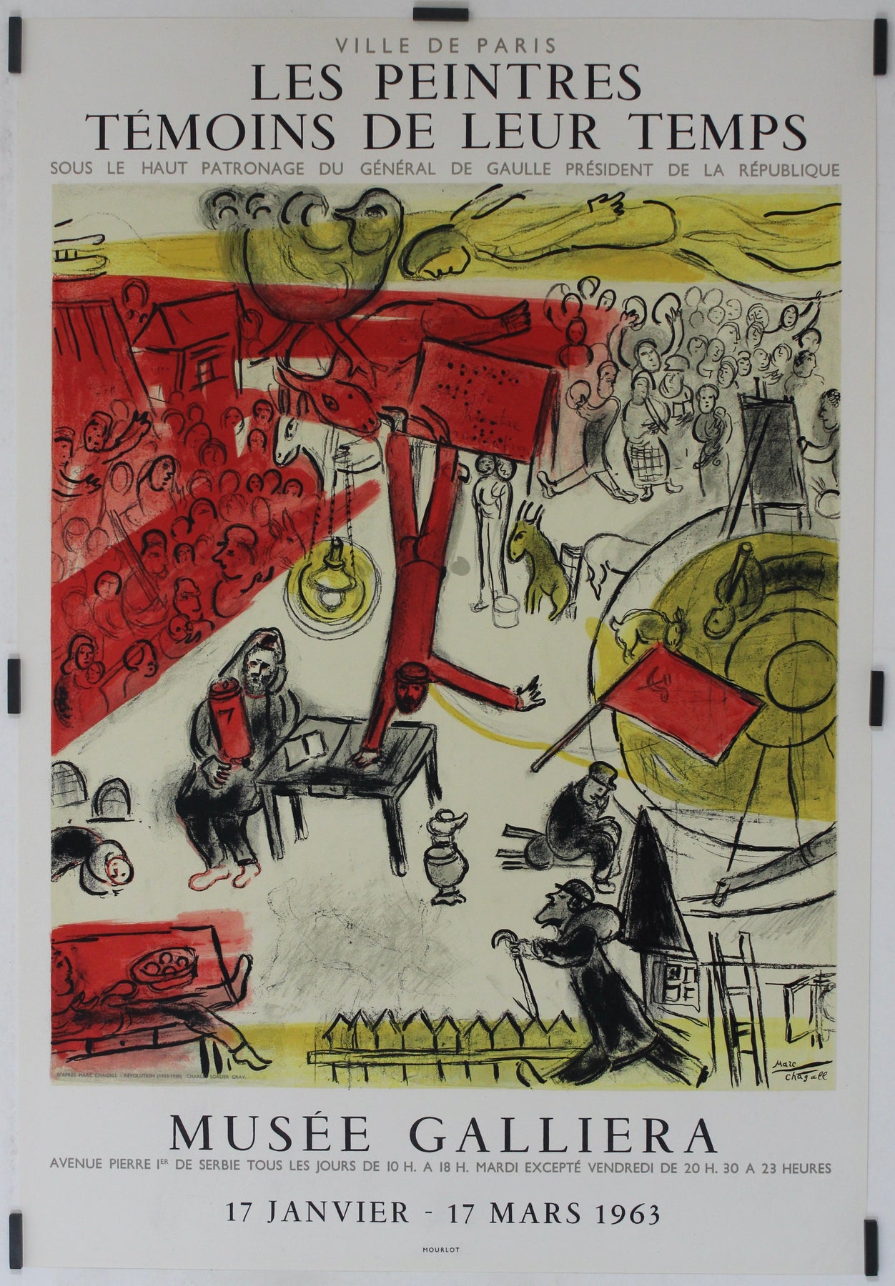 Cette affiche originale de 1963, créée par Marc Chagall pour l'exposition « Les Peintres Témoins de Leur Temps » au musée Galliera à Paris, est une œuvre magistrale qui mêle énergie politique et vision poétique. Sous-titrée « Révolution », elle incarne l'esprit explosif du changement, tel que perçu par l'un des artistes les plus imaginatifs du XXe siècle.