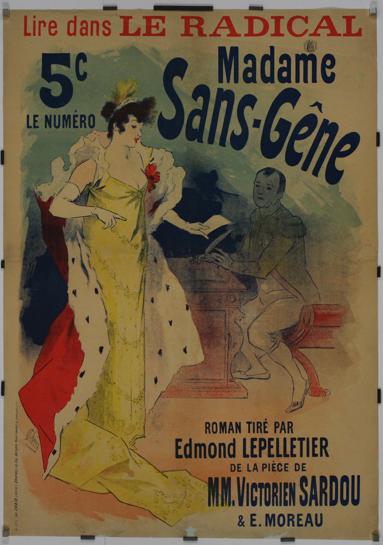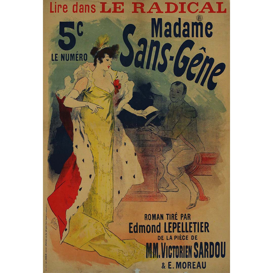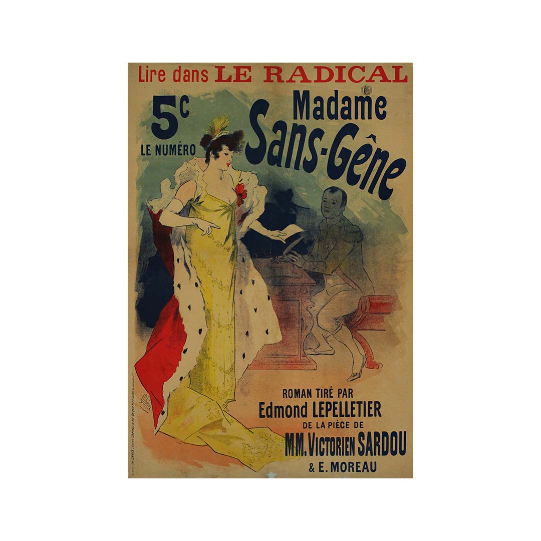 Au cœur de cette affiche se trouve le roman-feuilleton « Madame Sans Gêne », œuvre collaborative de Victorien Sardou et E. Moreau. Publié dans les pages du Radical, ce roman plongeait les lecteurs dans un univers de drame, d'intrigue et de fiction historique. La mission de Chéret était de saisir l'essence de ce joyau littéraire de manière visuellement captivante et accessible.