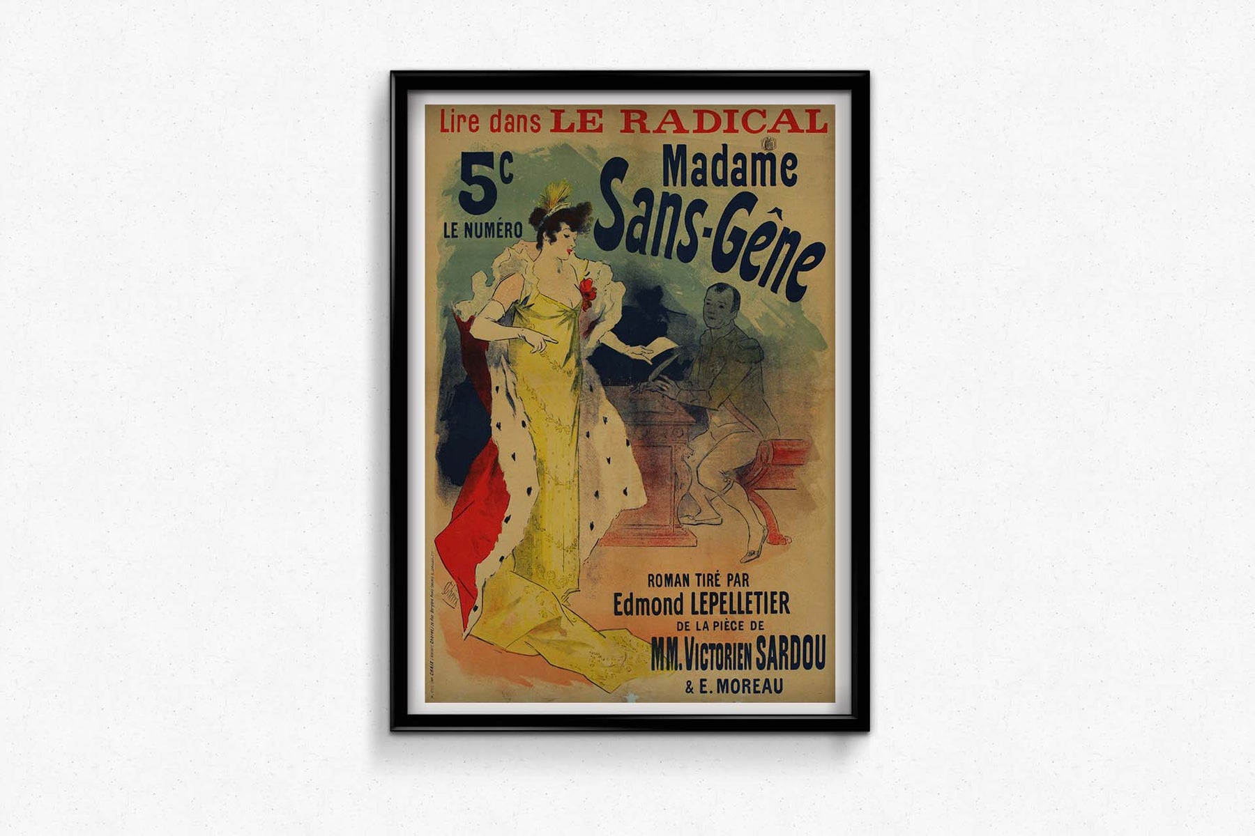 À la fin du XIXe siècle, les rues animées du Paris de la Belle Époque se paraient d'affiches éclatantes, et à l'avant-garde de cette révolution visuelle se trouvait l'artiste visionnaire Jules Chéret. Son chef-d'œuvre de 1894, une affiche pour Le Radical présentant le roman-feuilleton « Madame Sans Gêne » d'Edmond Lepelletier, servait non seulement d'outil promotionnel, mais illustrait aussi la convergence dynamique entre littérature et arts visuels à cette époque.