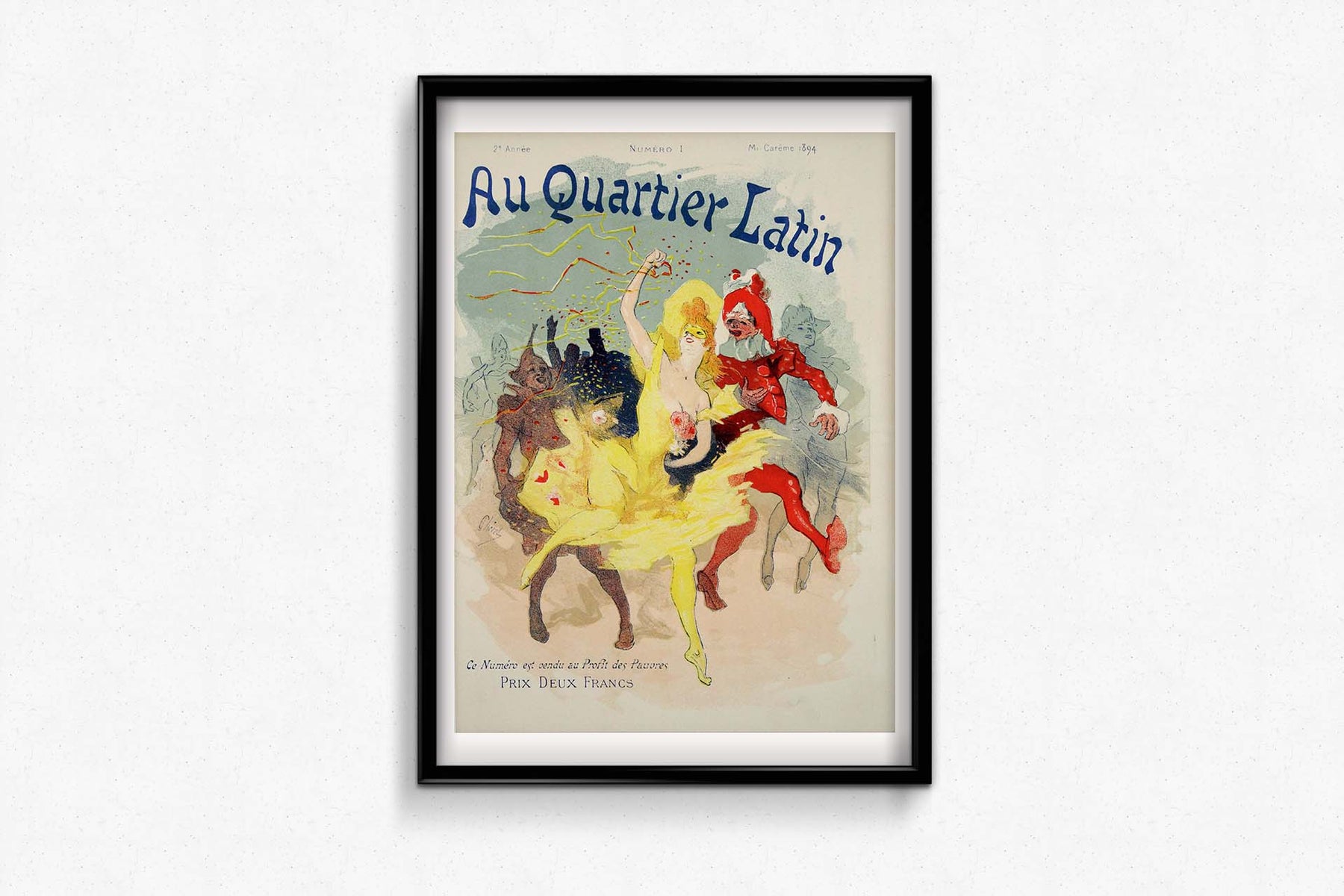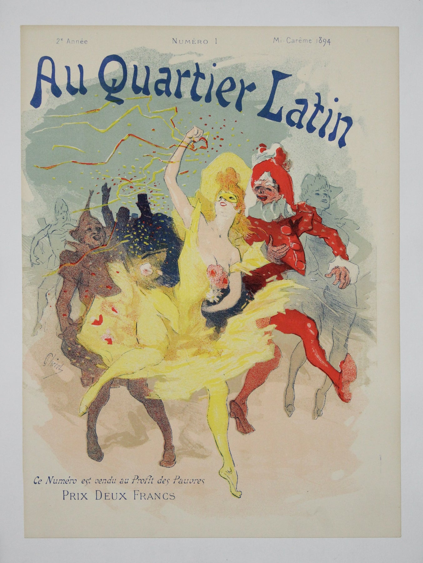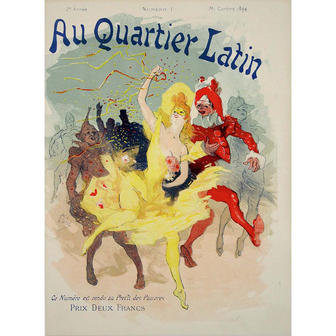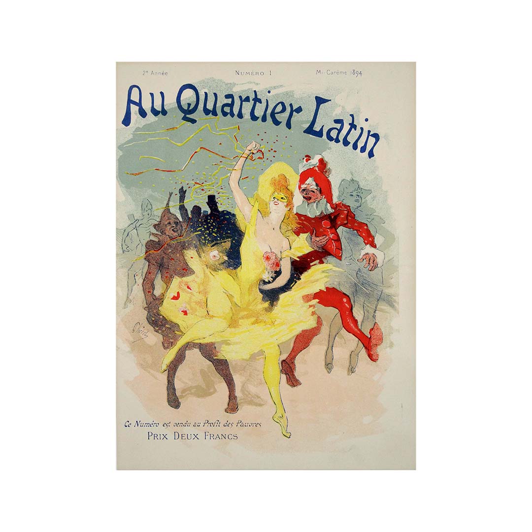 L'affiche originale de 1894 de Jules Chéret, intitulée « Au quartier latin Mi-Carême », dévoile un instantané captivant de l'atmosphère festive lors de la célébration de Mi-Carême dans le Quartier latin de Paris.
