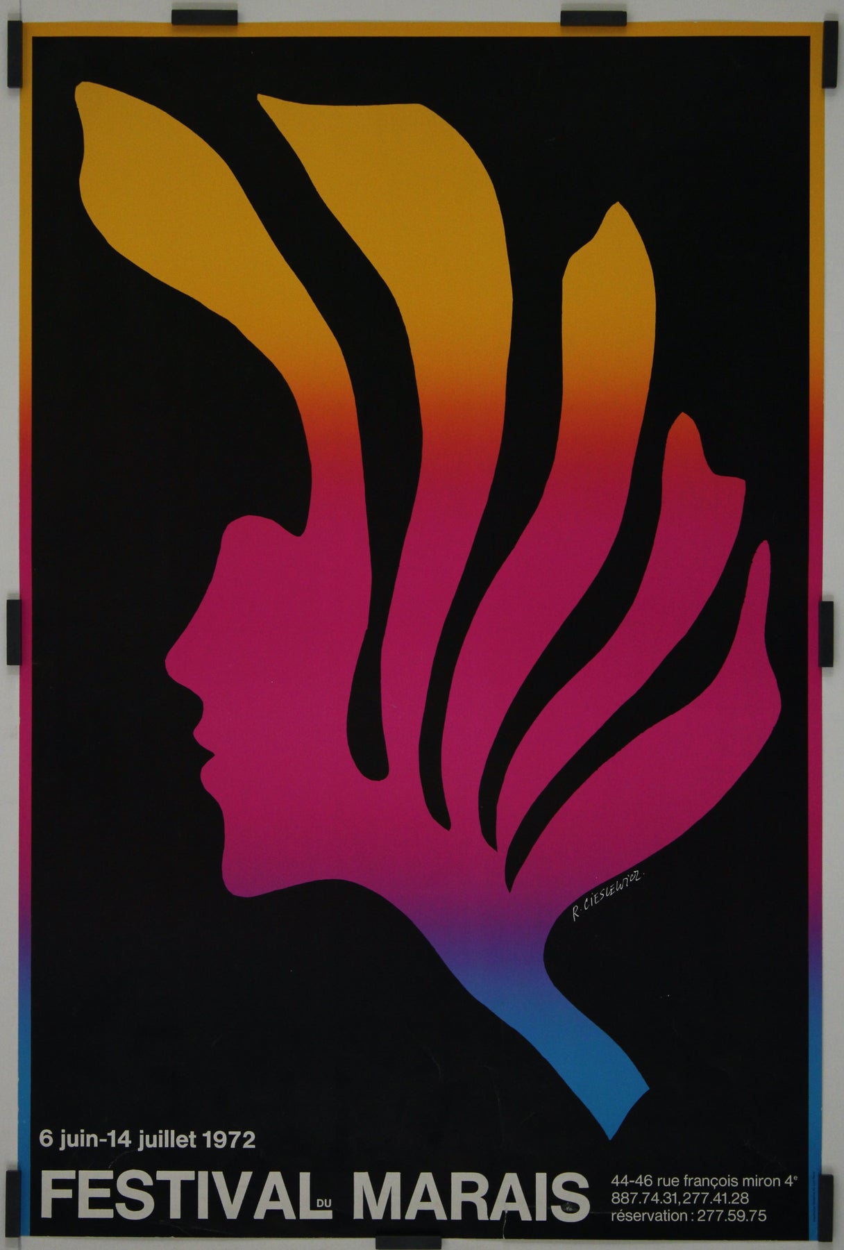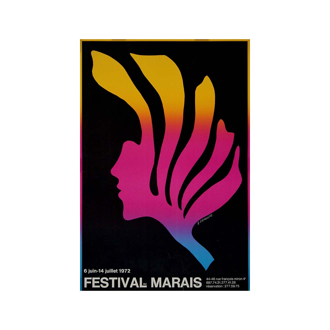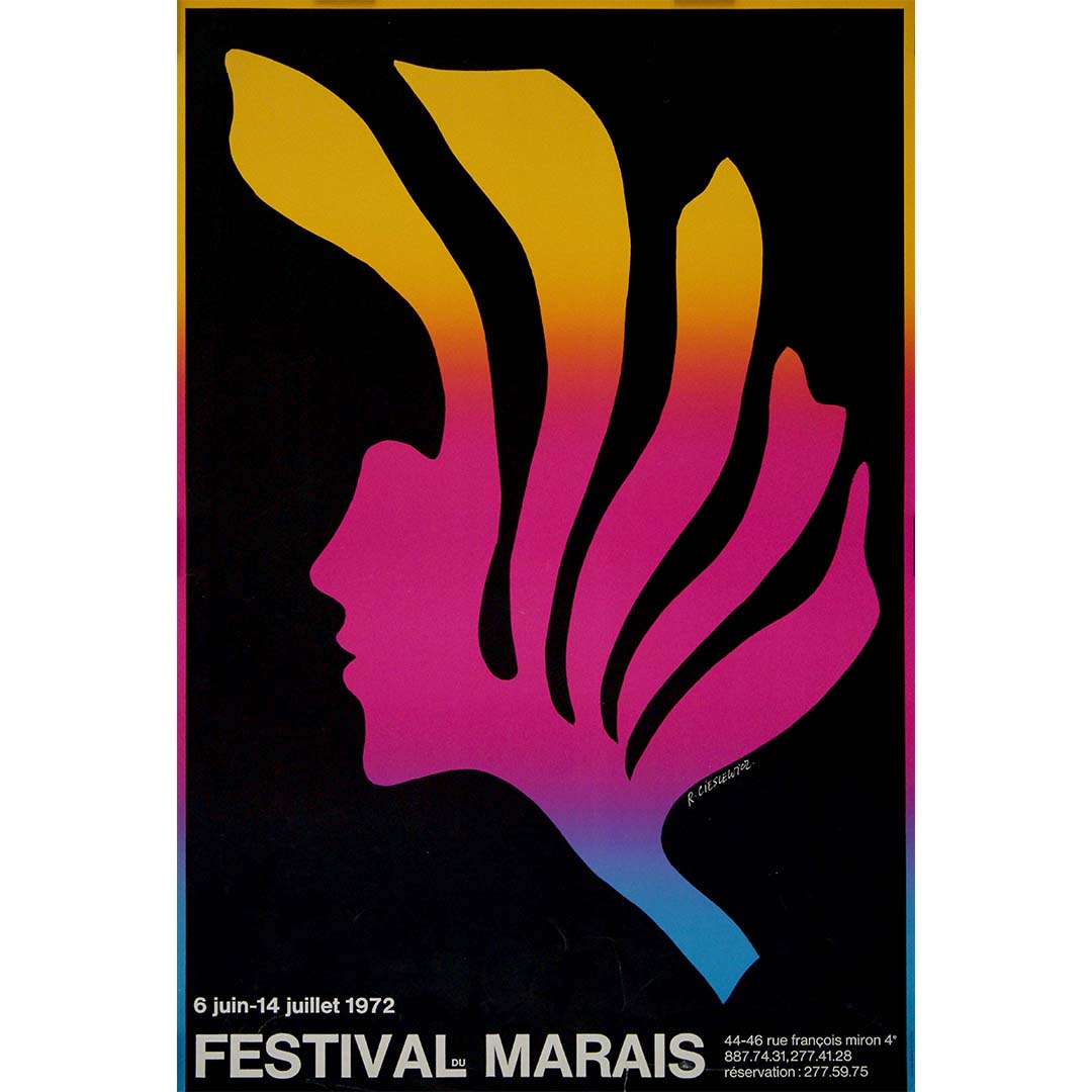 Le Festival du Marais était un événement culturel majeur, célébrant la musique, le théâtre et les arts dans le quartier historique du Marais à Paris. Depuis sa création en 1961, le festival n'a cessé de gagner en prestige, proposant des spectacles dans de magnifiques lieux, souvent centenaires, tels que des églises et des hôtels particuliers, qui parsèment le Marais. Lorsque Cieslewicz a conçu cette affiche pour l'édition de 1972, le festival était devenu un rendez-vous incontournable du calendrier culturel parisien, attirant un public varié venu de toute la ville et d'ailleurs.