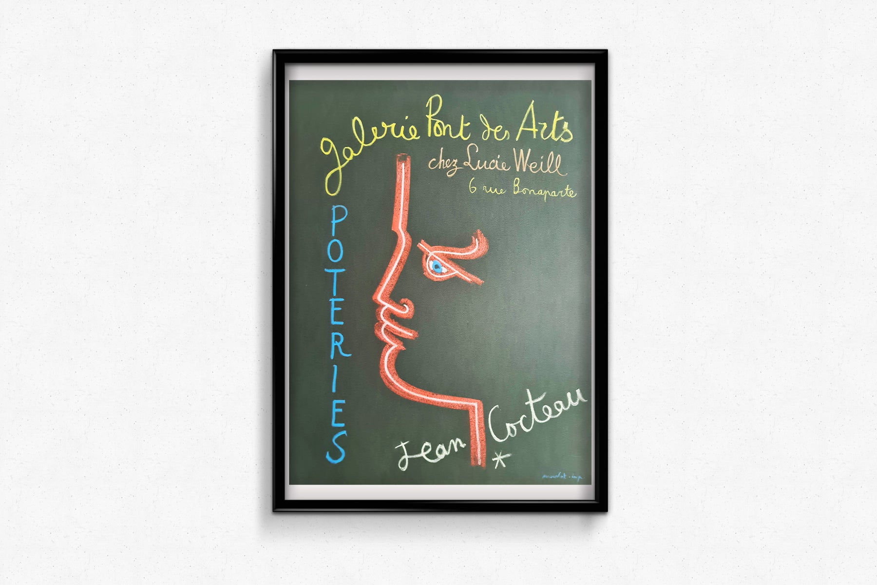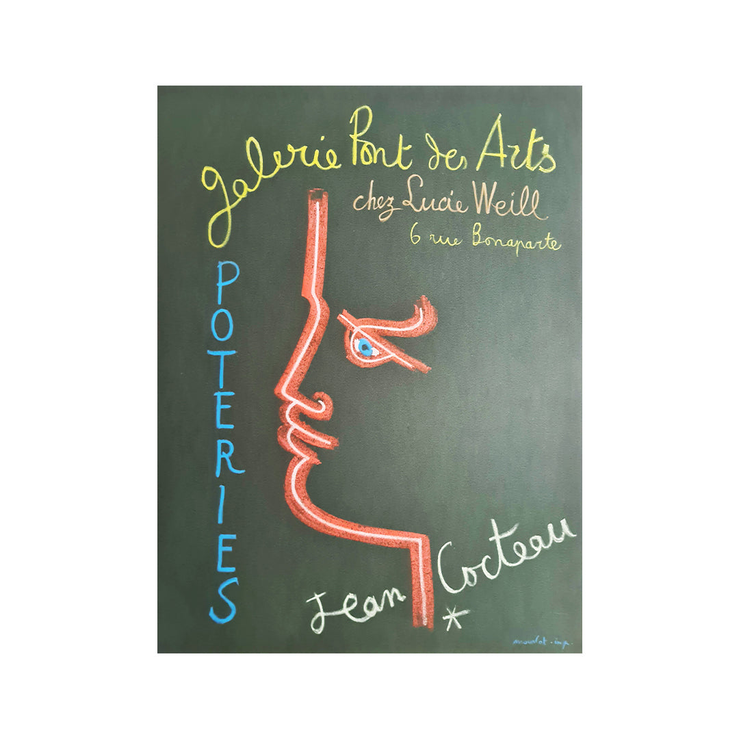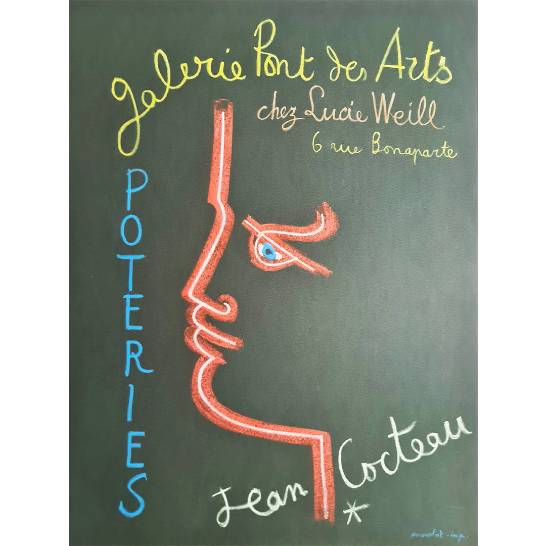 Affiche réalisée par Jean Cocteau 🇫🇷 (1889-1963), poète, peintre, dessinateur, dramaturge et cinéaste français. Dans l'atelier de Madeleine Jolly et Philippe Madeline à Villefranche-sur-Mer, il créa plus de 300 céramiques et bijoux. Durant la même période, il conçut également des objets-poèmes.