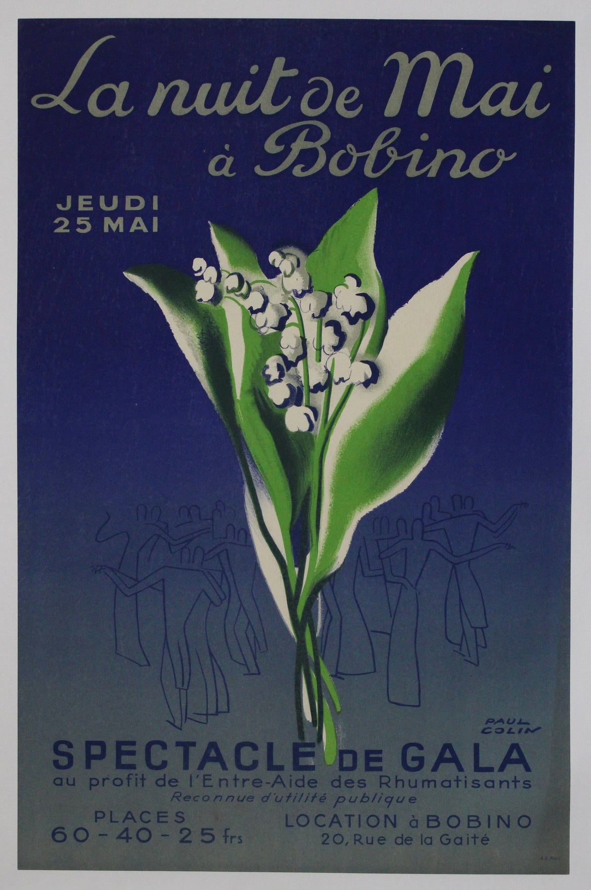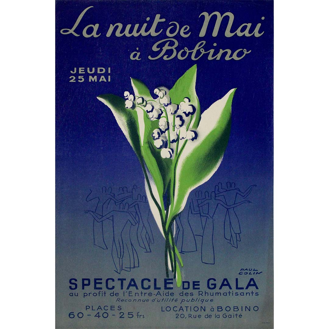 Cette affiche originale des années 1950, signée par le légendaire graphiste français Paul Colin, annonce « La Nuit de Mai à Bobino » , une soirée de gala festive qui se tiendra le jeudi 25 mai dans le lieu parisien emblématique du Bobino. L'événement était organisé au profit de l'Entre-Aide des Rhumatisants , association caritative reconnue pour son utilité publique, illustrant ainsi les liens étroits qui unissaient l'art, la culture et l'action sociale à cette époque.