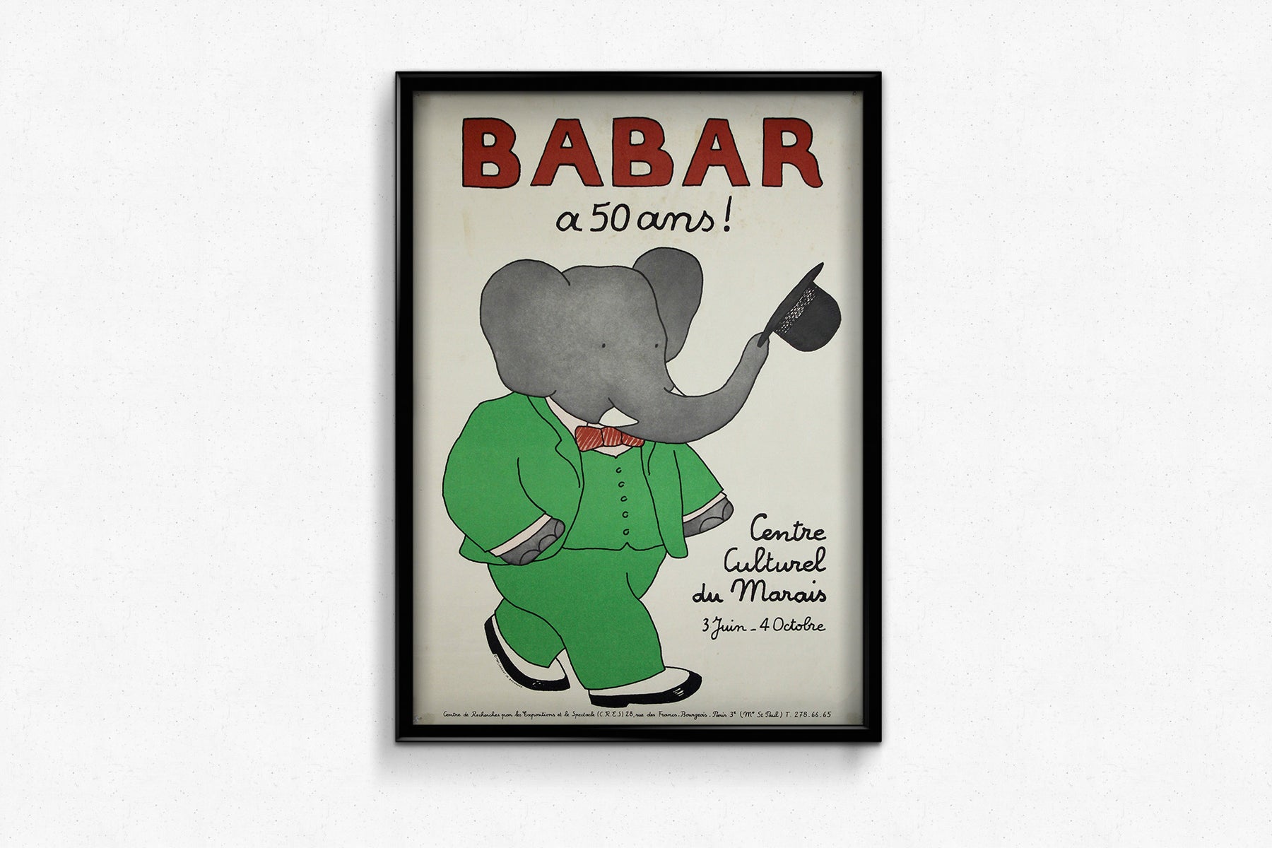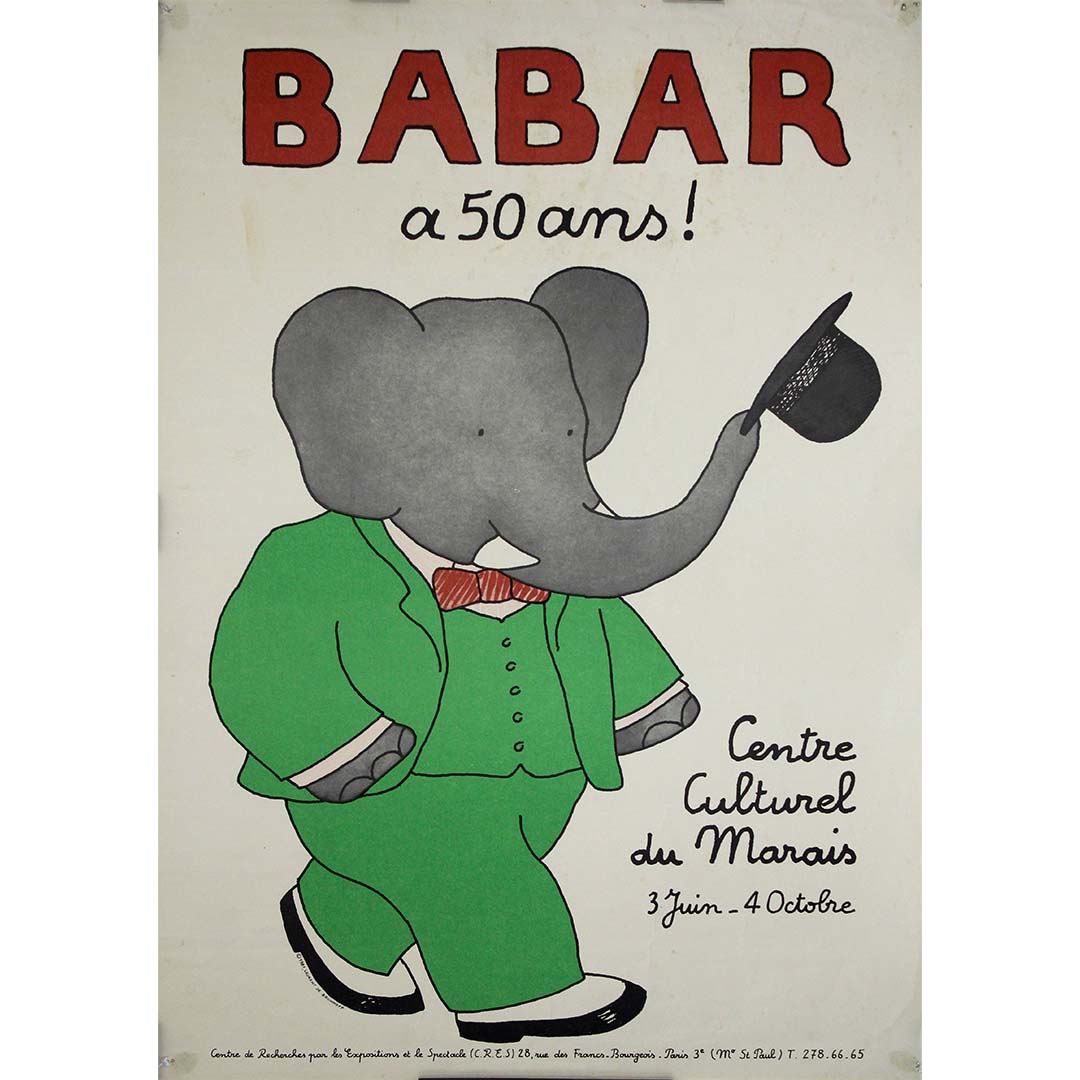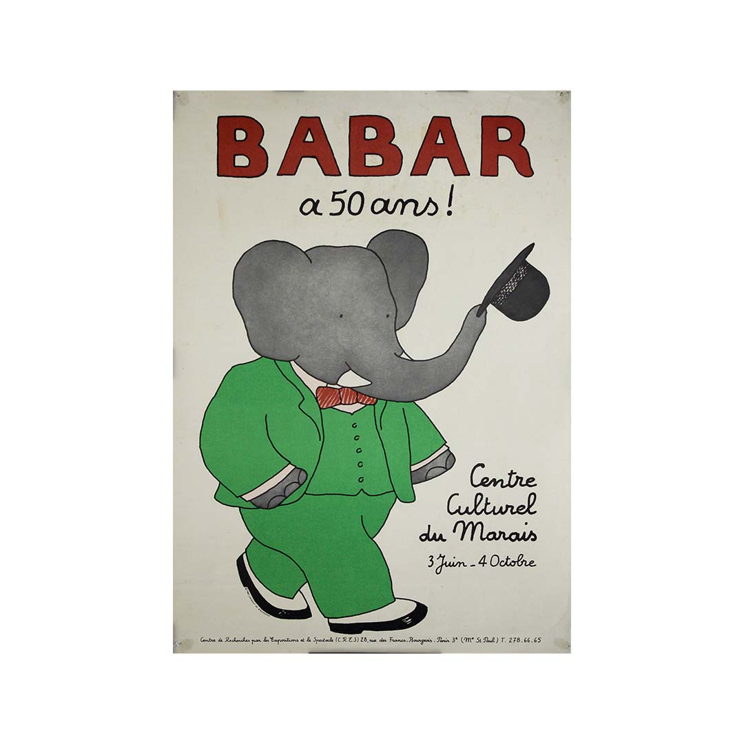 En conclusion, l’affiche originale de 1981, conçue par Jean De Brunhoff pour l’exposition « Babar a 50 ans ! » au Centre Culturel du Marais, est bien plus qu’un simple support promotionnel : c’est un hommage à un héritage littéraire et artistique qui a enchanté des générations. L’affiche capture le charme et l’attrait intemporel de Babar, invitant le public à redécouvrir l’univers enchanteur du roi des éléphants et à célébrer un jalon de l’histoire littéraire.
