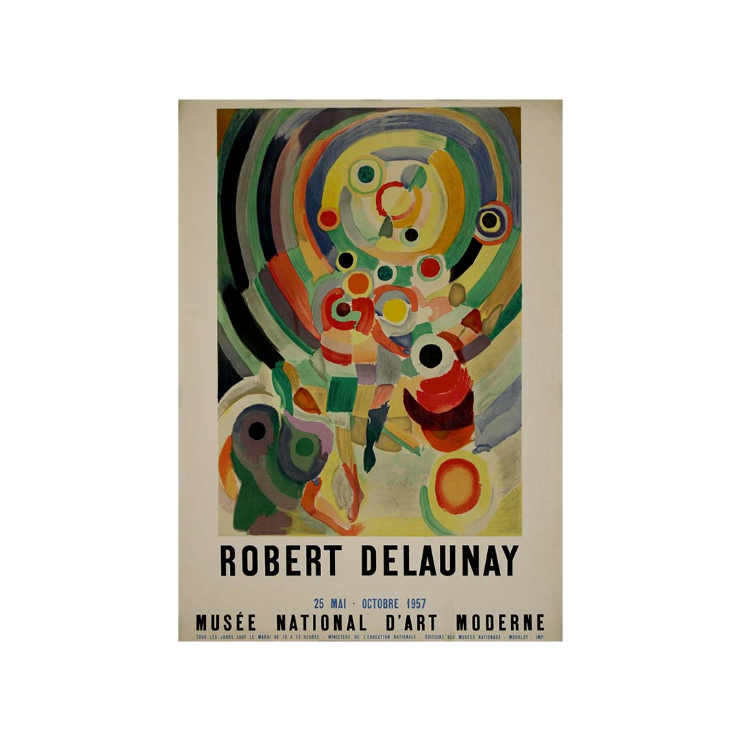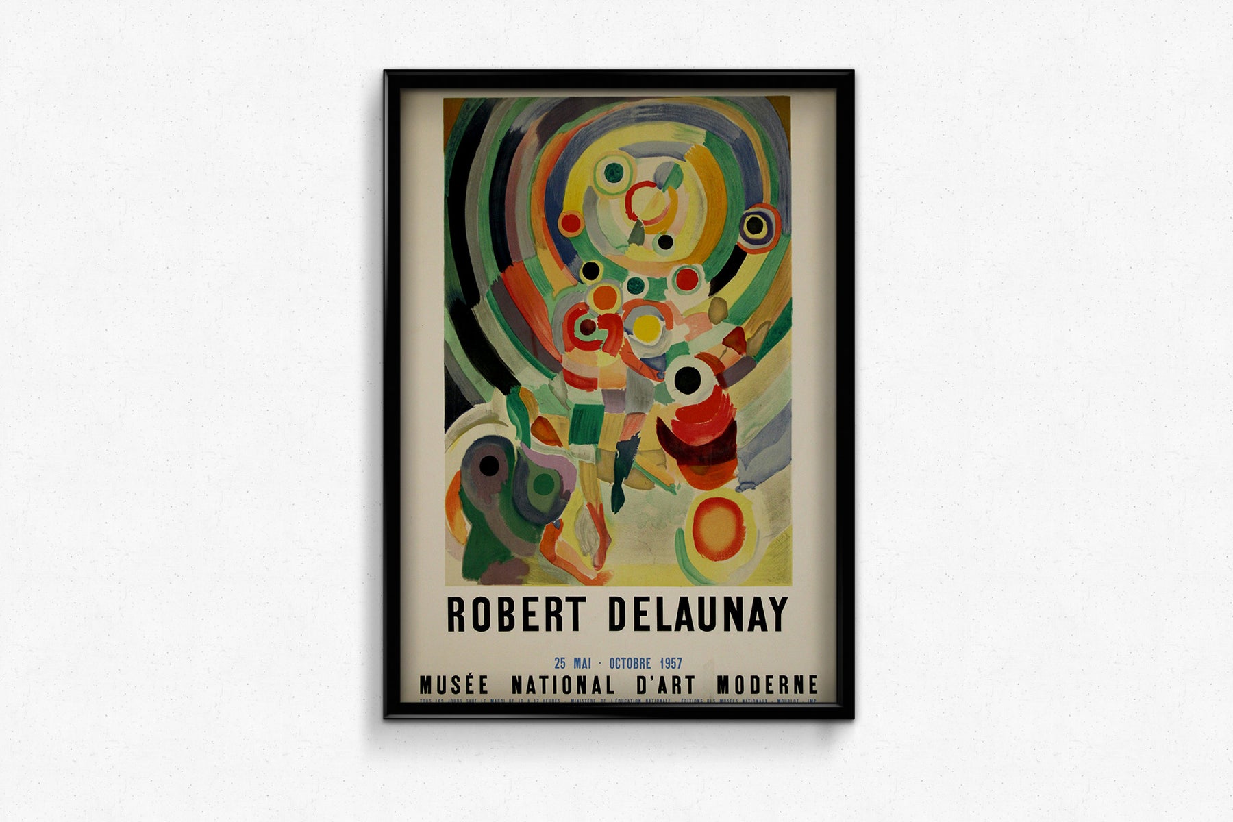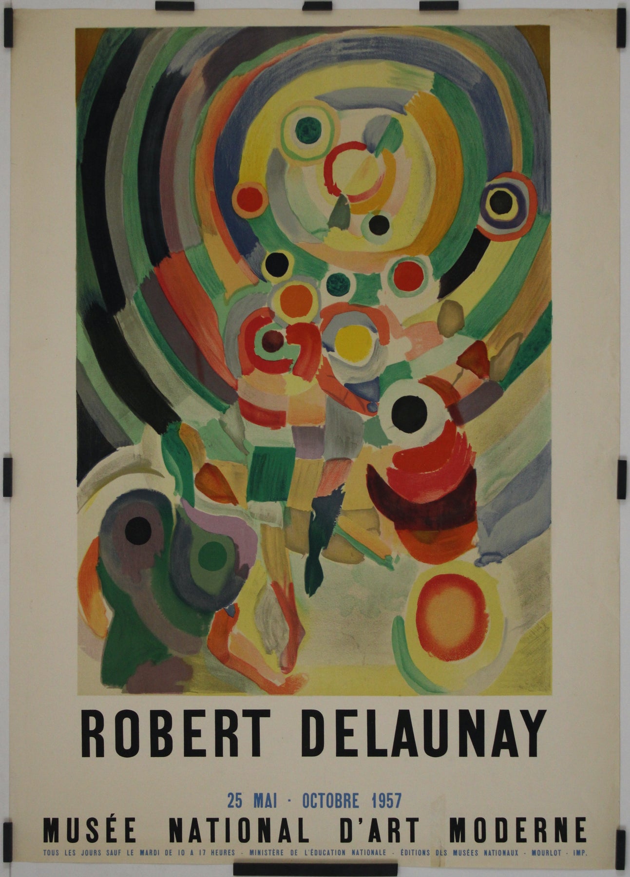 Pièce exceptionnelle du graphisme français d'après-guerre, cette affiche est très recherchée par les amateurs d'art moderne, de peinture abstraite et de documents muséaux. Elle capture l'essence vibrante de l'univers synesthésique de Delaunay, où art, couleur et mouvement convergent dans une abstraction symphonique.