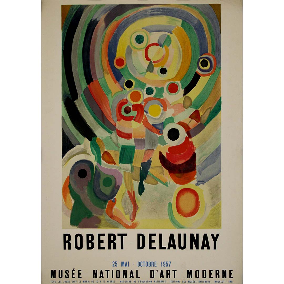 Cette superbe affiche originale de 1957 a été créée pour le Musée National d'Art Moderne de Paris afin de célébrer l'œuvre pionnière de Robert Delaunay, l'une des figures fondatrices de l'orphisme, un mouvement ancré dans l'abstraction et le jeu des couleurs et de la lumière.