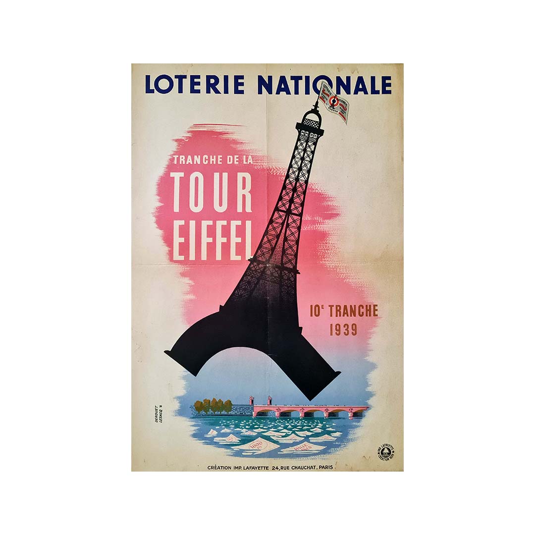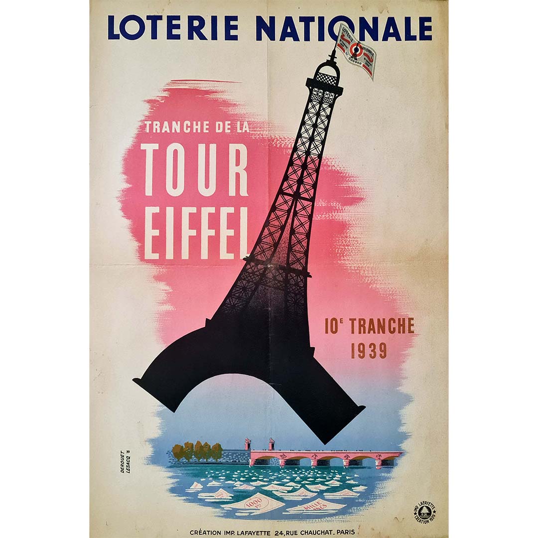 Affiche publicitaire vintage réalisée par Derouet Lesacq en 1939 pour la Loterie Nationale, représentant une partie de la Tour Eiffel.