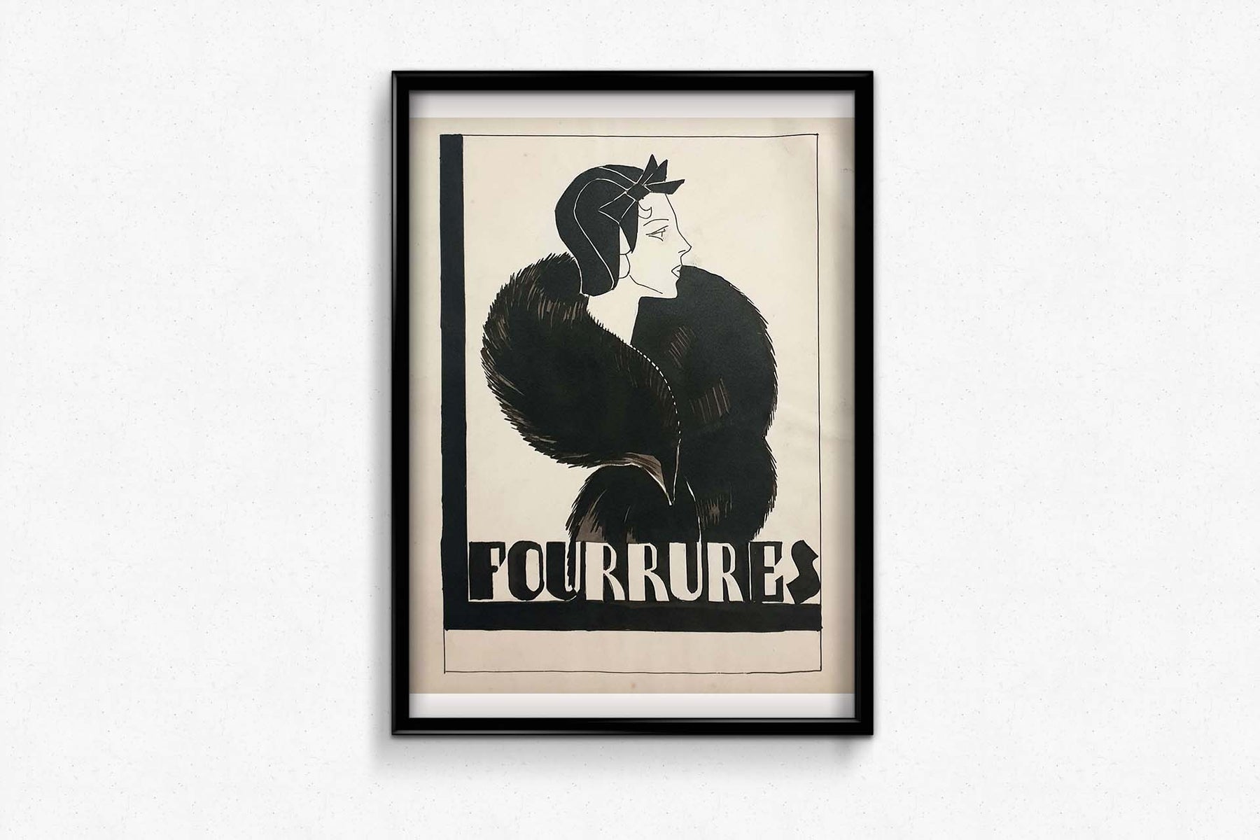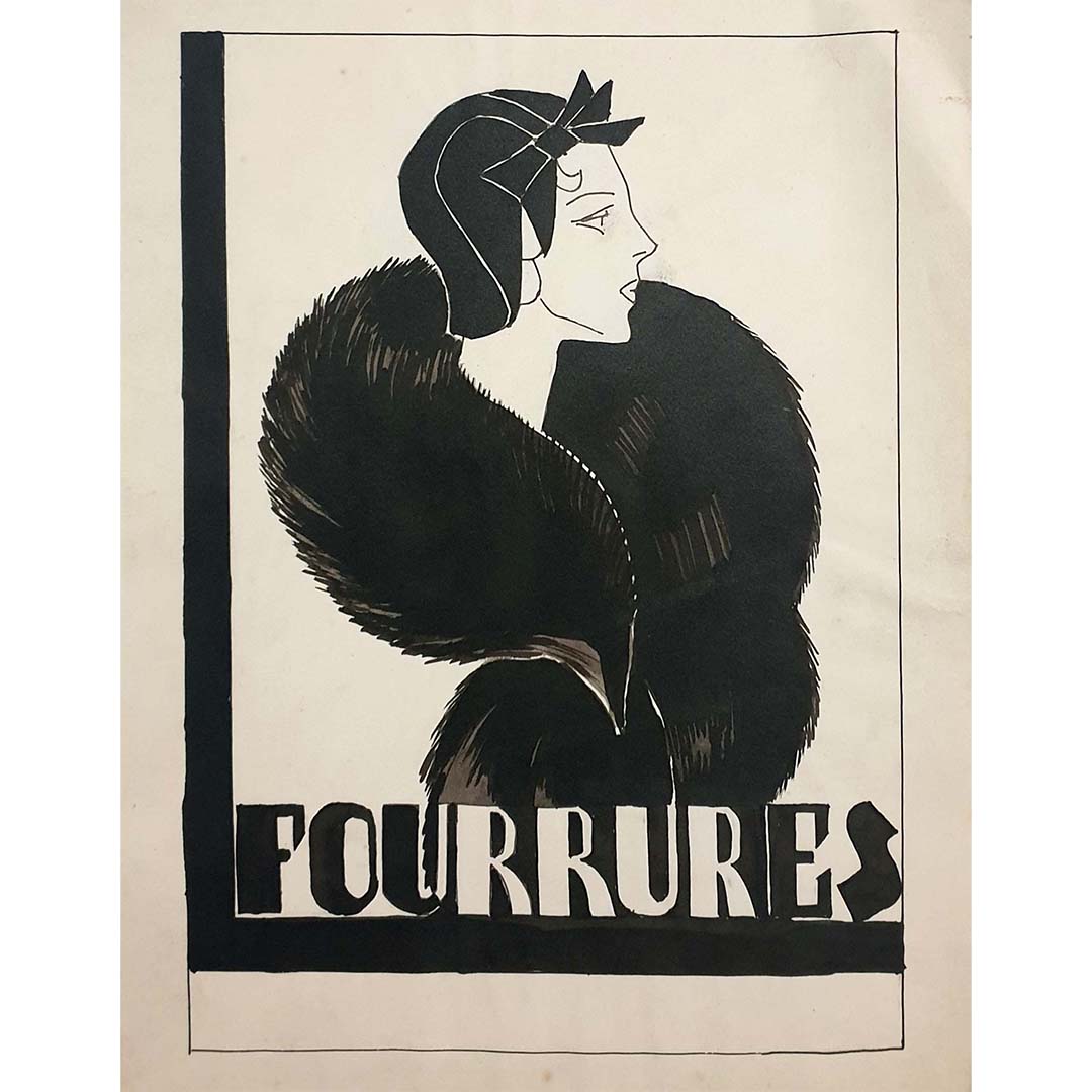 Belle affiche à l'encre des années 1930. Cette magnifique affiche de style Art déco a été créée pour promouvoir la fourrure.