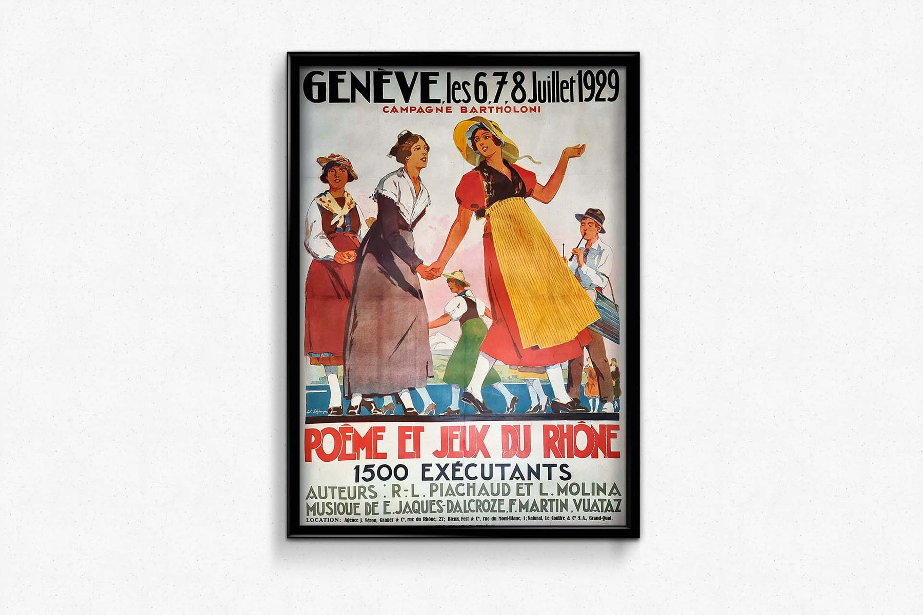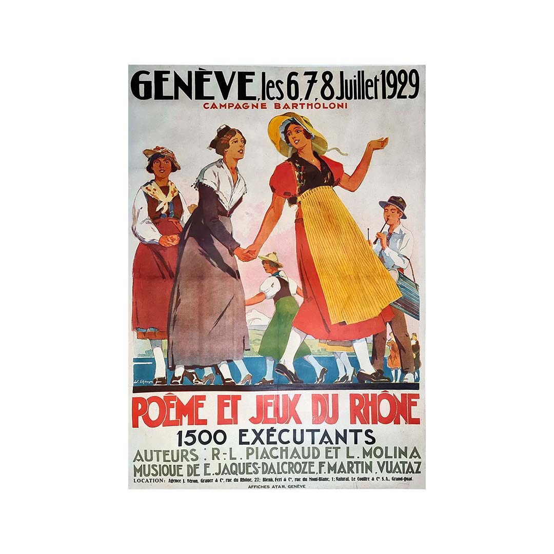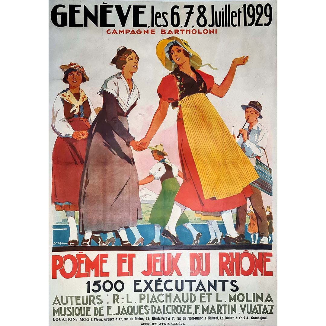 Magnifique affiche de 1929 d'Édouard Elzingre : Poèmes et jeux du Rhône, Genève. Édouard Elzingre, né le 2 juillet 1880 à Neuchâtel et mort le 4 juillet 1966 à Genève, était un peintre, affichiste et illustrateur suisse.