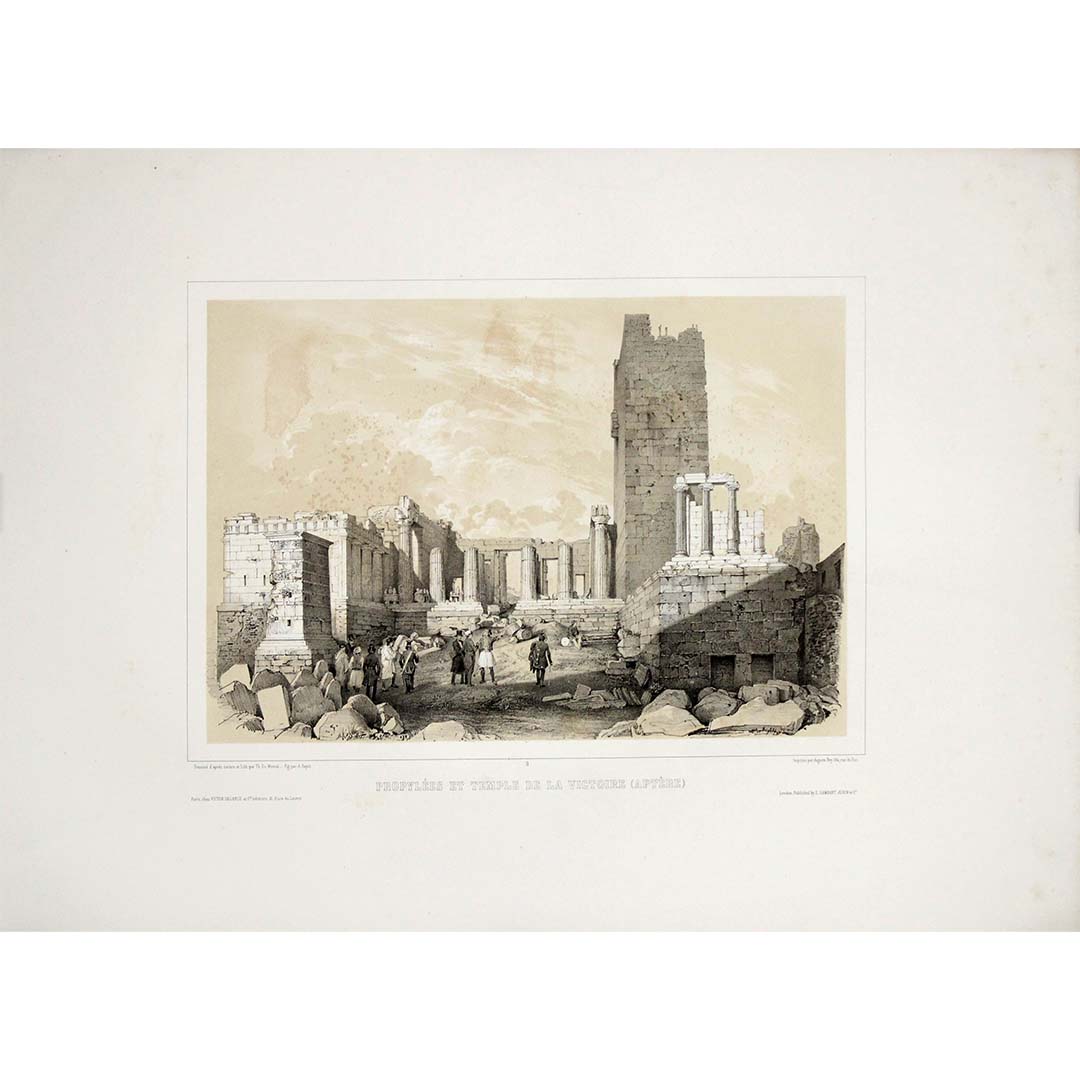 Cette remarquable lithographie de 1846 offre une vue panoramique et richement détaillée des Propylées et du Temple d'Athéna Niké — appelé ici Temple de la Victoire (Aptère) — capturée par Théodore du Moncel d'après un dessin d'A. Bayot, dans le cadre de la célèbre série romantique Athènes monumentale et pittoresque .