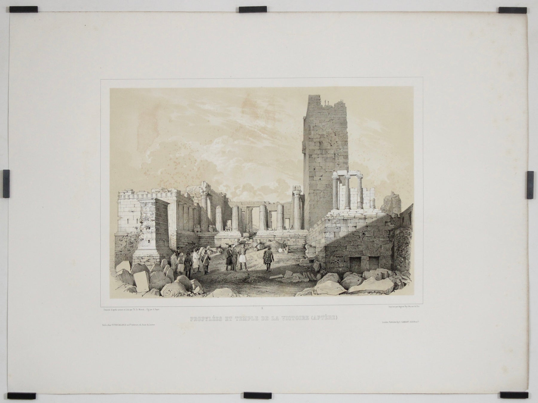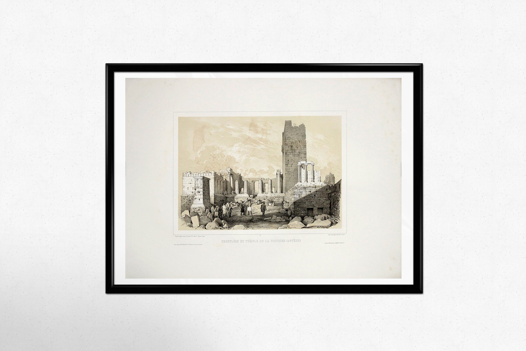 Publiée à Londres par E. Gambart Junin & Cie, acteur majeur du marché international de l'art, cette lithographie allie une grande précision archéologique à une sensibilité artistique raffinée. La monumentalité des Propylées et la grâce délicate du temple d'Athéna Niké sont rendues par un trait méticuleux et des lavis atmosphériques, suscitant à la fois admiration et respect.