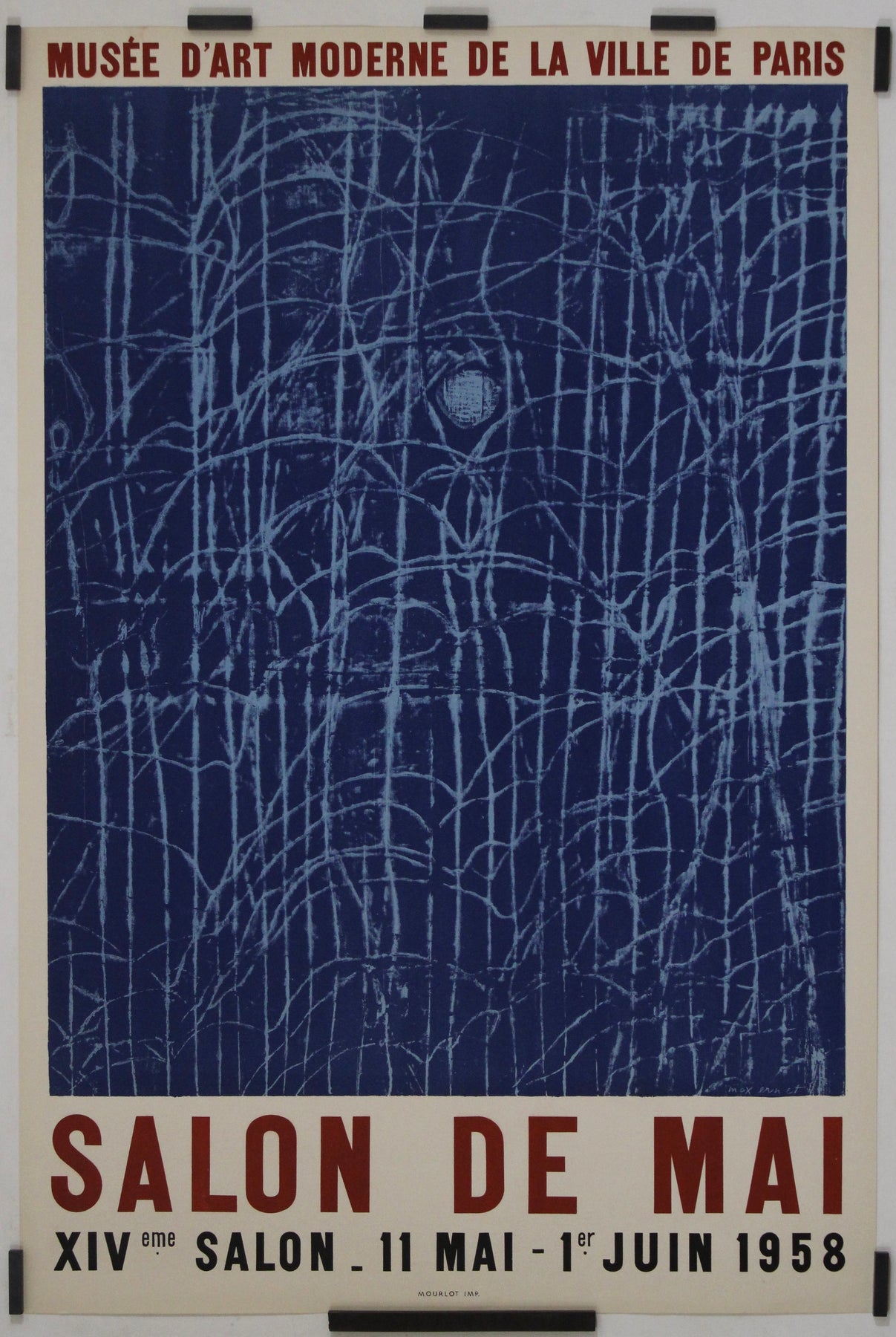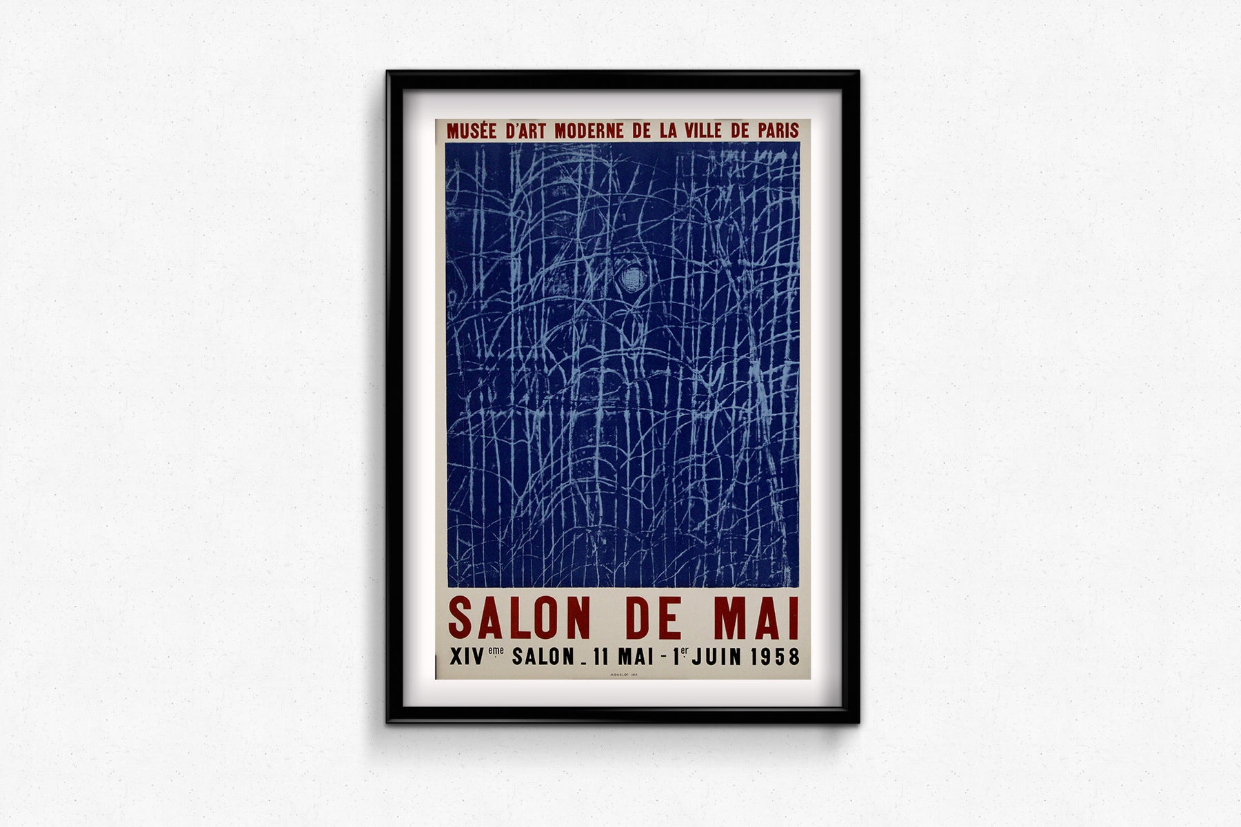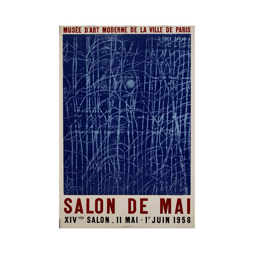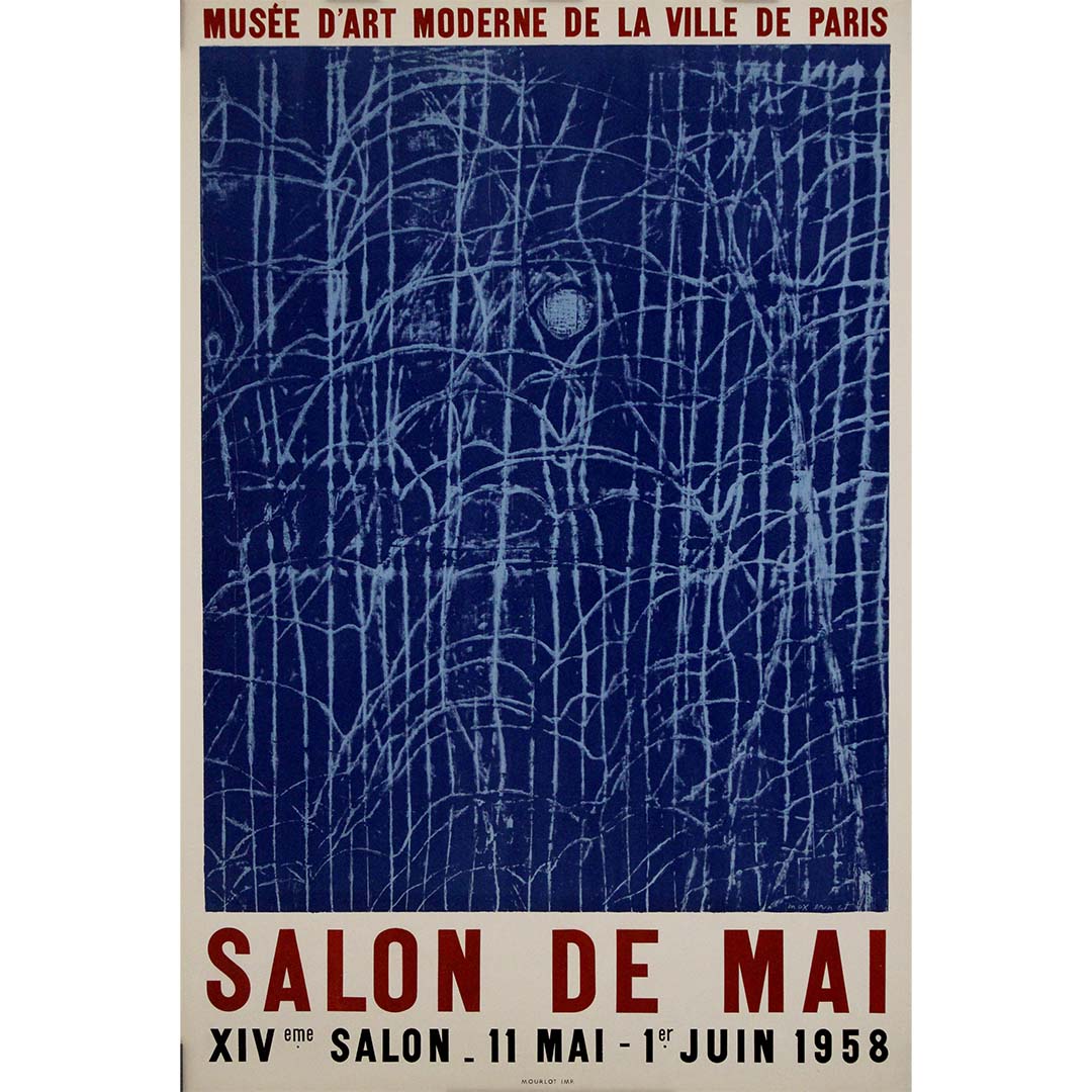La typographie joue un rôle minimaliste mais affirmé dans la conception, avec « Salon de Mai » en grandes lettres capitales rouges qui ancrent l'œuvre. Les dates de l'exposition, du 11 mai au 1er juin 1958, sont présentées dans une mise en page structurée, contrebalançant la beauté chaotique de l'œuvre d'art située au-dessus.