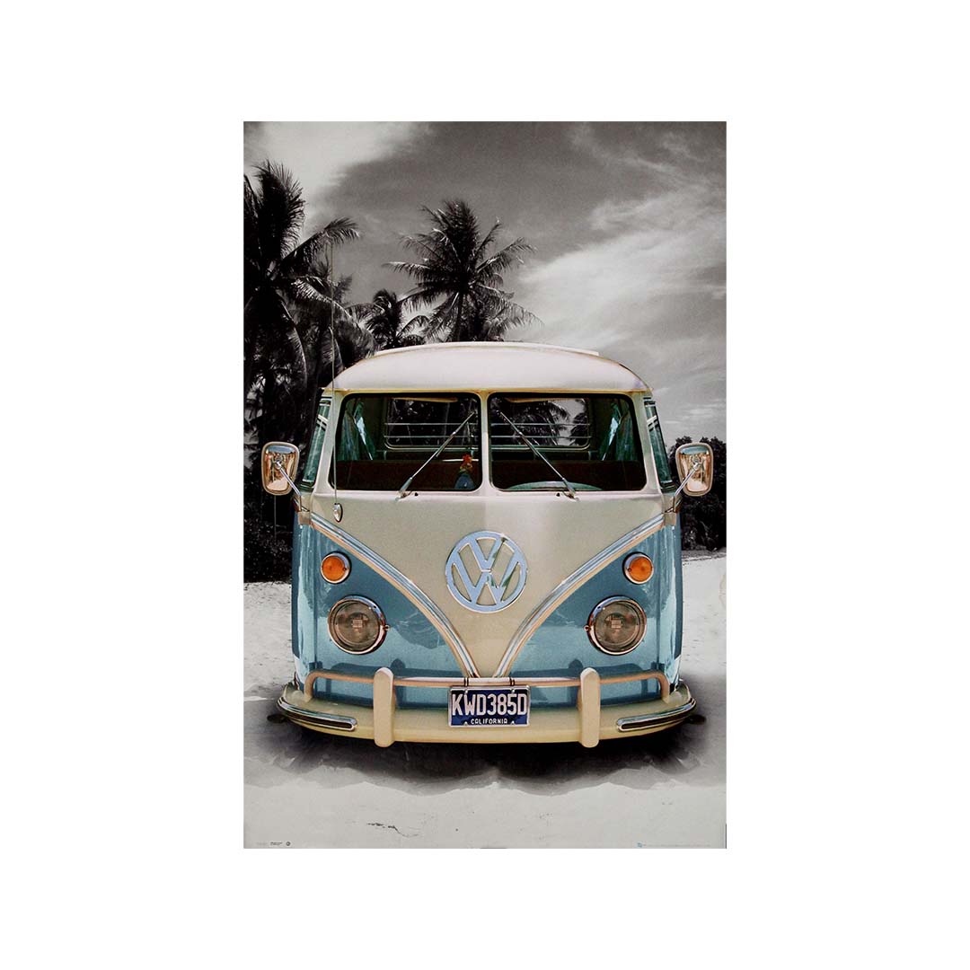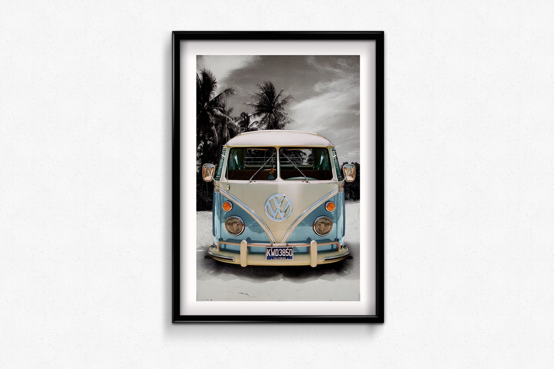 Tout au long des années 1970, le Combi a conquis une génération en quête d'aventure et d'authenticité. Sa forme unique et son design pratique en ont fait un véhicule de prédilection pour les surfeurs, les campeurs, les artistes et les idéalistes. Cette affiche reflète ce moment culturel et capture l'esprit d'une époque marquée par l'exploration et l'expression personnelle.