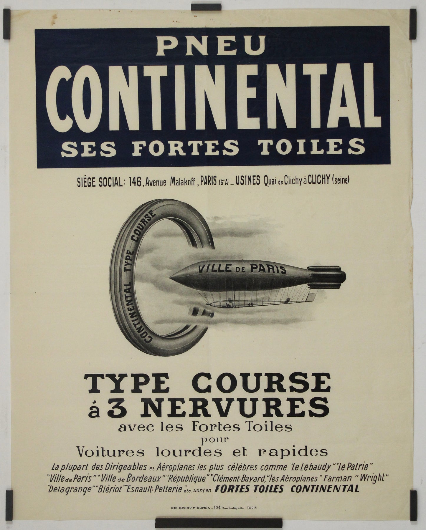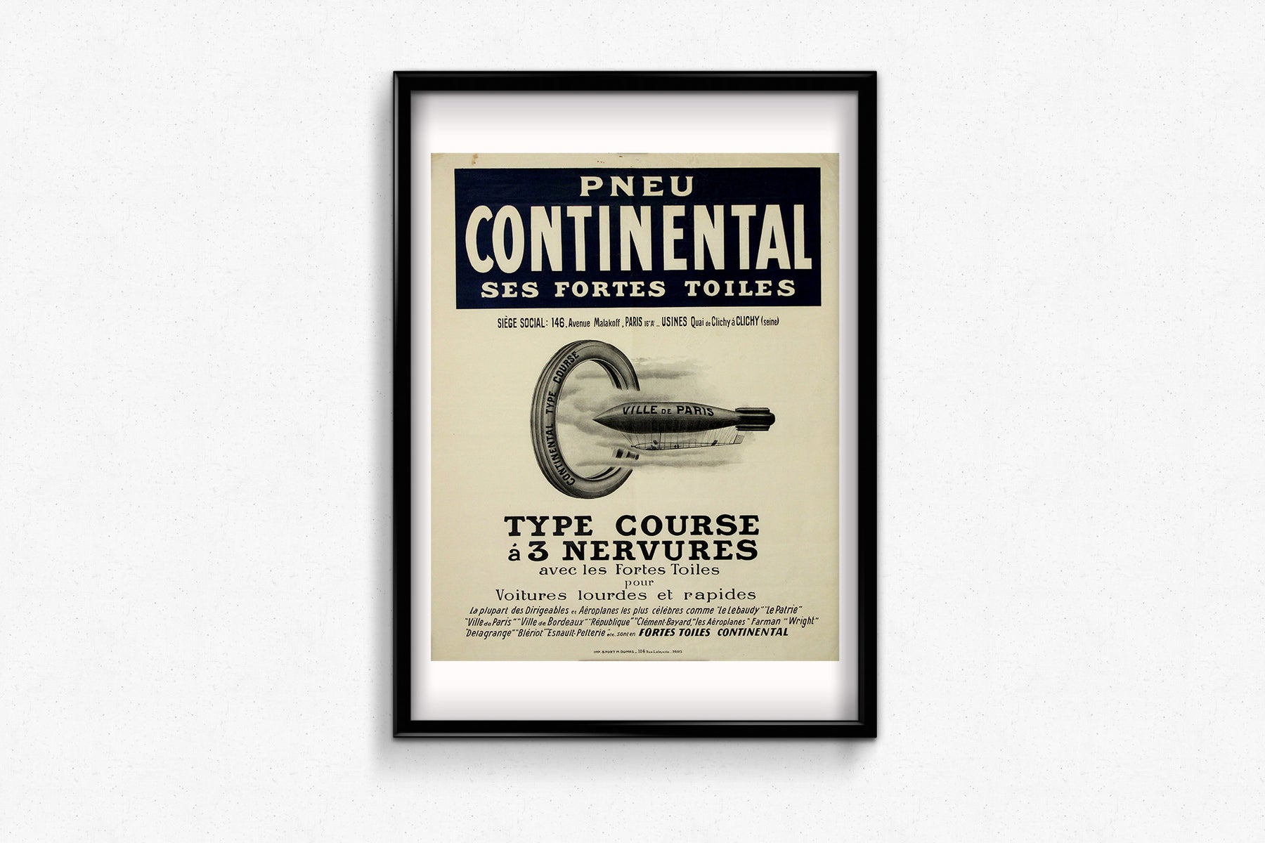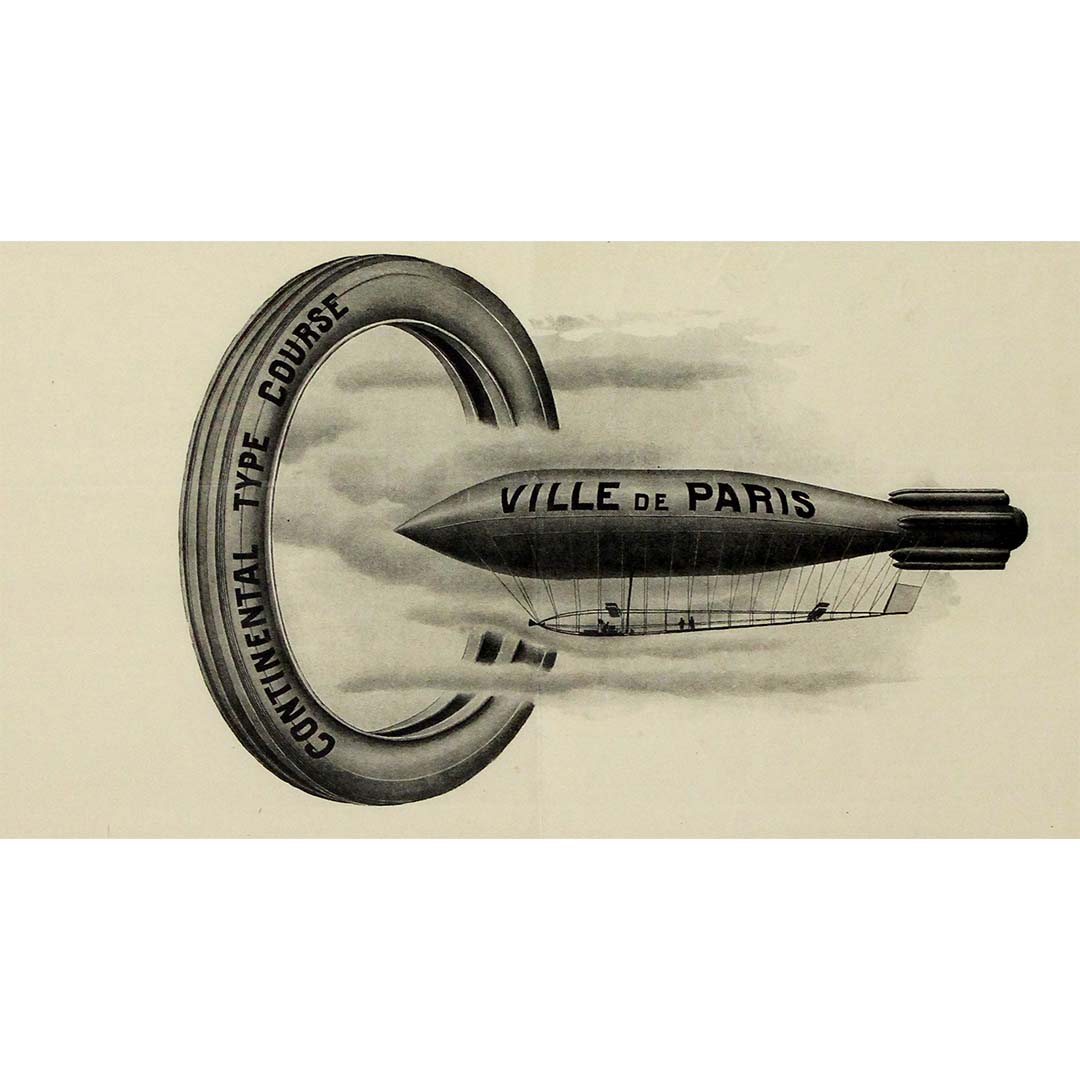 Cette affiche date probablement du début du XXe siècle, à une époque où les dirigeables et les automobiles symbolisaient la modernité et le progrès industriel. Continental, fondée en Allemagne en 1871, s'était déjà forgée une réputation grâce à la fiabilité de ses pneumatiques et matériaux en caoutchouc. Cette publicité met en avant son innovation technique : les pneumatiques « fortes toiles » étaient conçus pour résister aux contraintes des véhicules lourds et rapides, alors de plus en plus répandus. Les dirigeables comme le « Ville de Paris » et d'autres mentionnés en bas de l'affiche symbolisent les prouesses pionnières en matière de transport, en écho aux valeurs de durabilité et de technologie de pointe chères à Continental.
