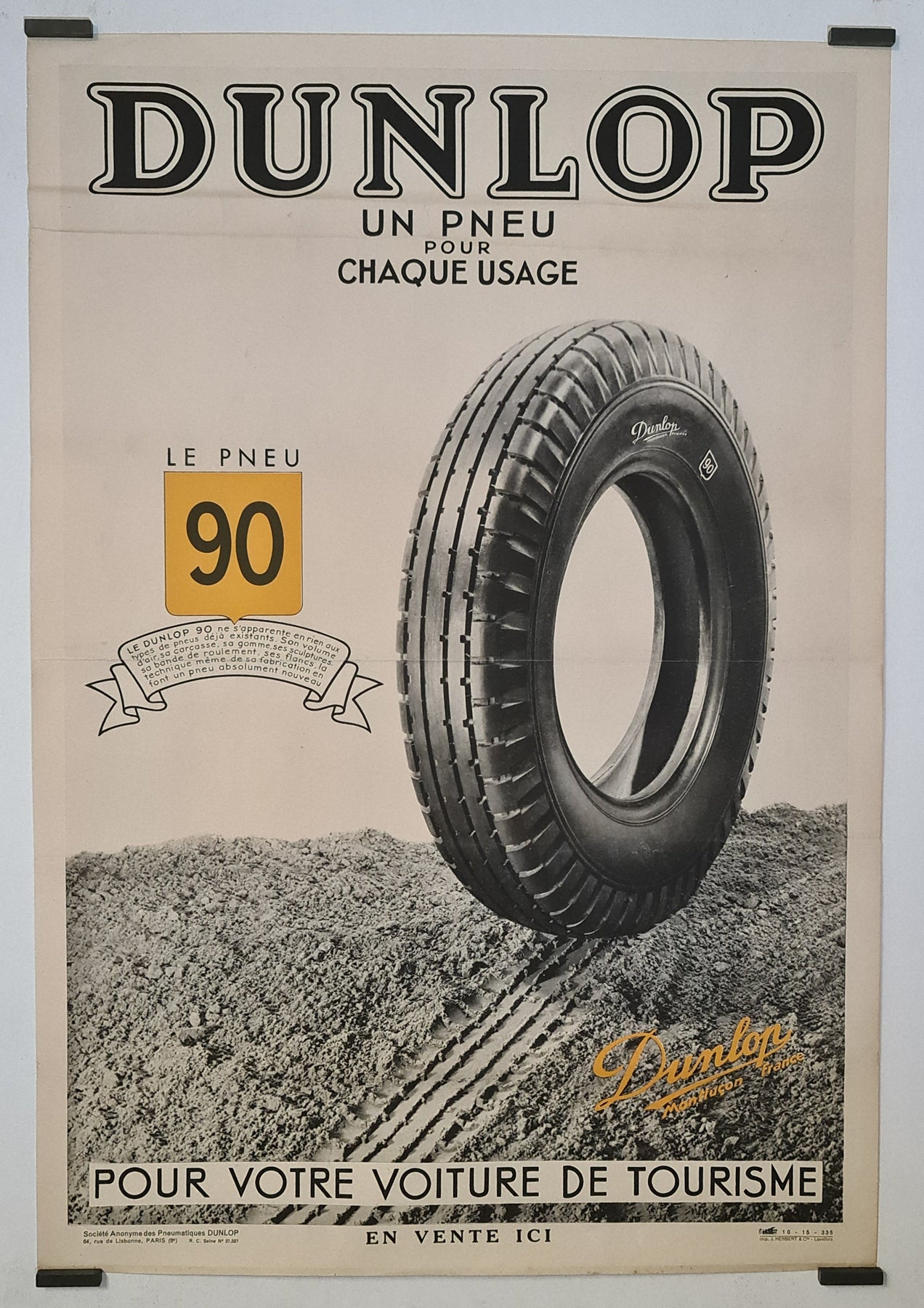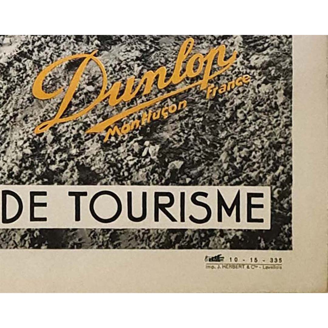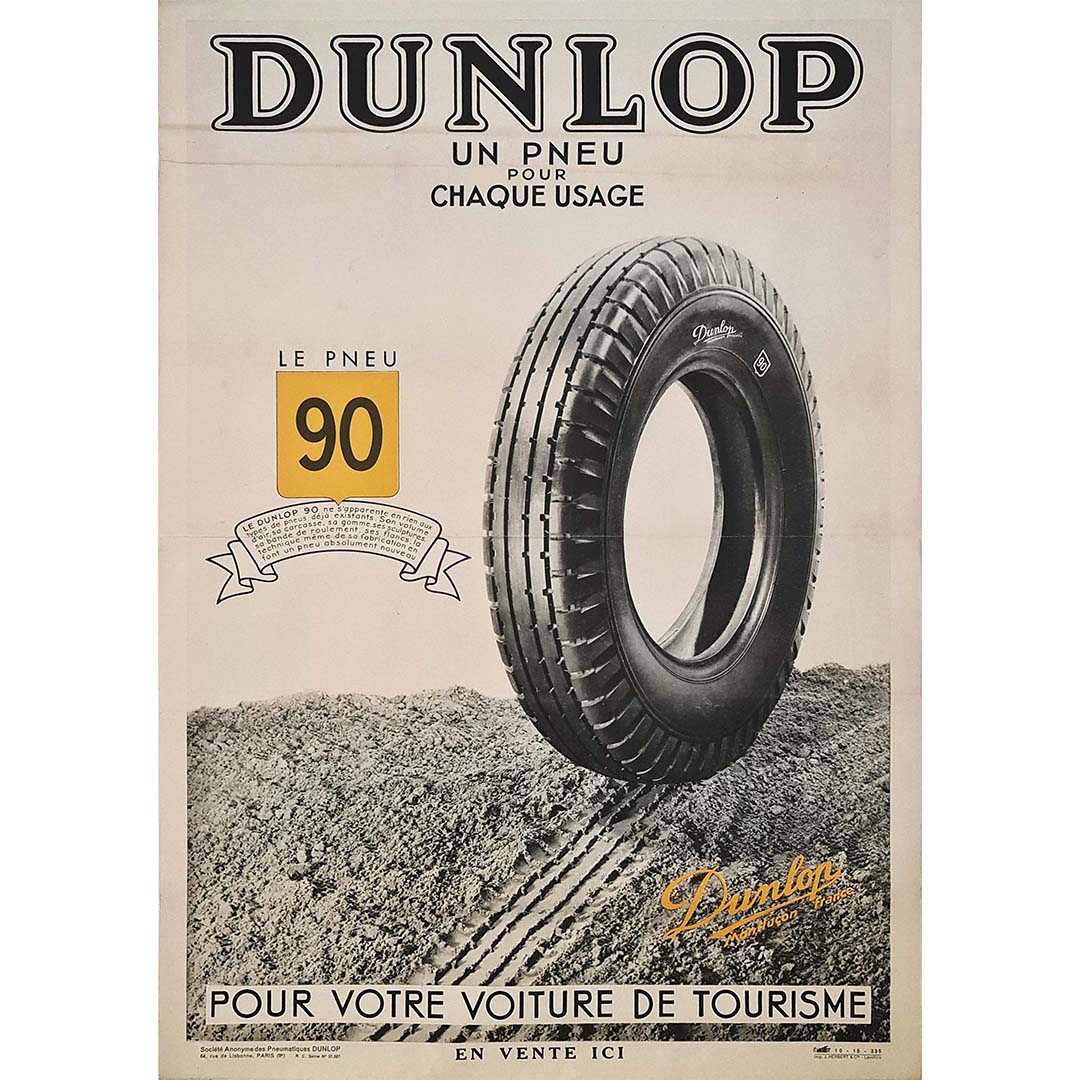 L'affiche publicitaire originale de 1935 pour Dunlop présente le pneu 90, conçu pour répondre à tous les besoins de conduite. Réalisée par J. Herbert & Cie à Levallois, cette affiche illustre parfaitement la quête incessante d'excellence de Dunlop dans l'industrie automobile.