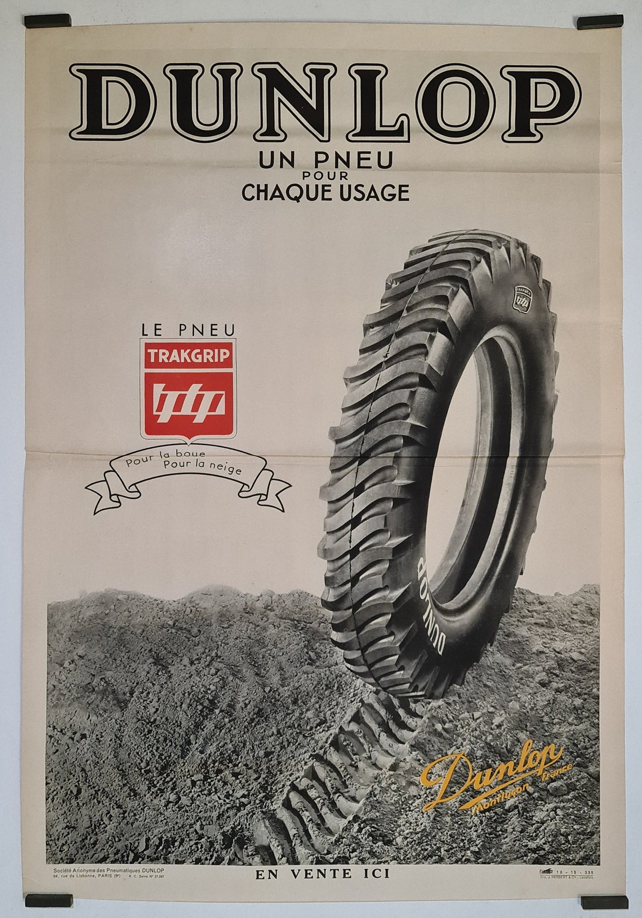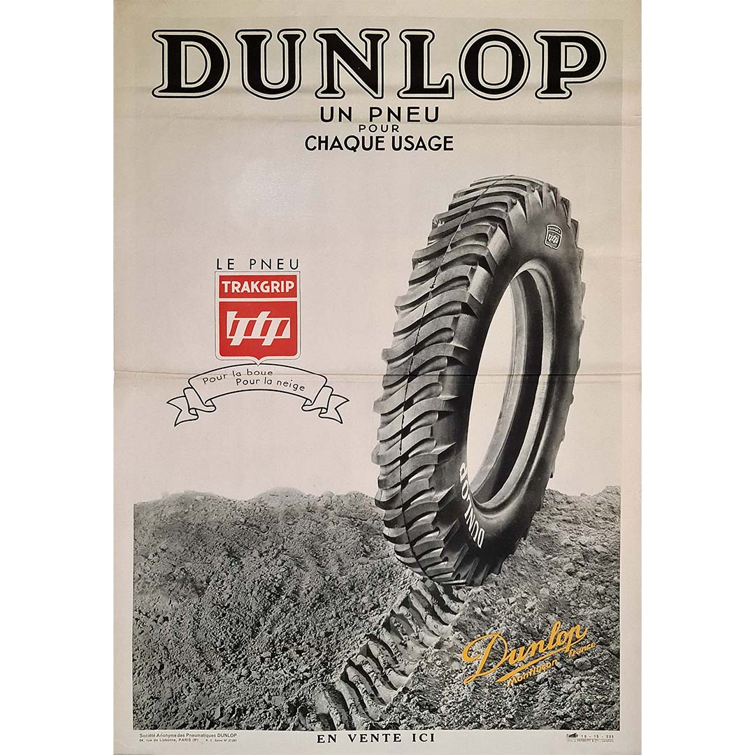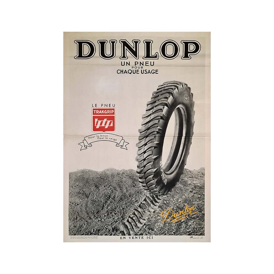L'affiche publicitaire originale de 1935 pour Dunlop présente au public le pneu innovant Trakgrip, une innovation majeure conçue pour répondre aux besoins variés des conducteurs. Imprimée par J. Herbert & Cie à Levallois, cette affiche témoigne de l'engagement de Dunlop envers la qualité et la performance dans l'industrie automobile.