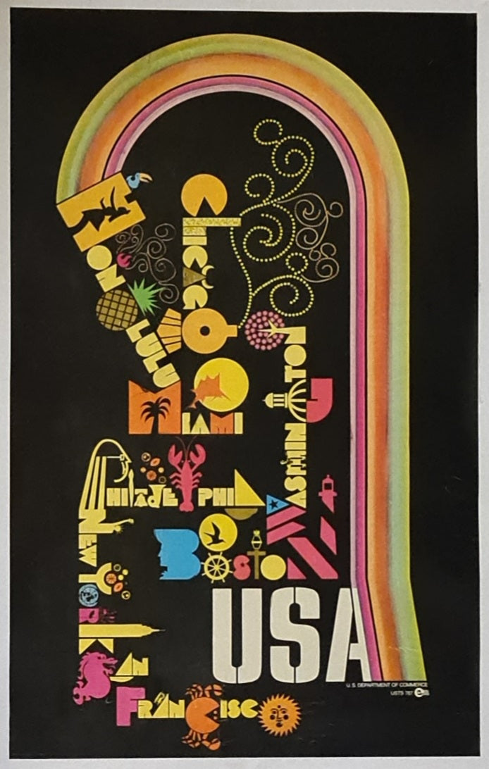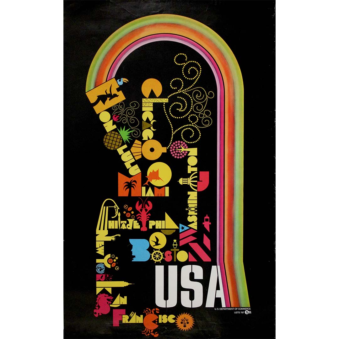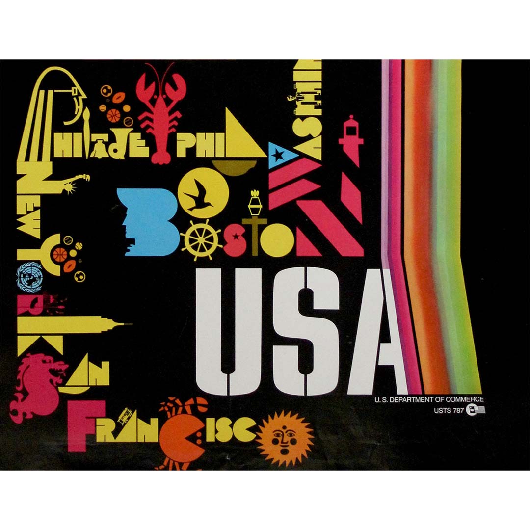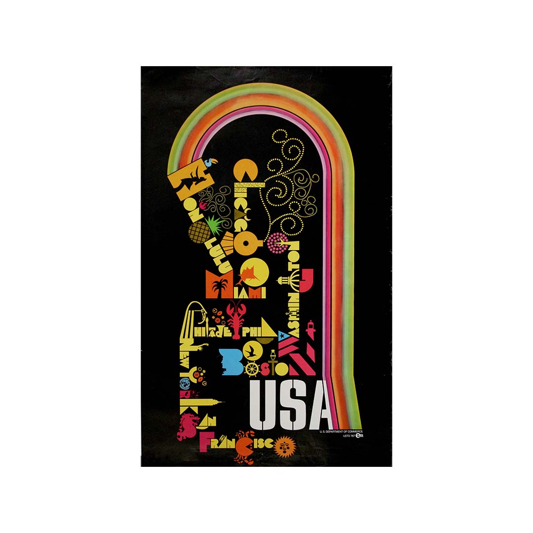 Cette affiche de voyage dynamique des années 1970, éditée par le Département du Commerce des États-Unis, célèbre avec audace et enthousiasme les villes les plus emblématiques des États-Unis, à travers le prisme coloré du graphisme moderne du milieu du XXe siècle. Sur un fond noir profond, une arche arc-en-ciel rayonnante encadre une mosaïque typographique éclectique de destinations, chacune représentée dans une police de caractères ludique et symbolique qui fusionne lettres et icônes locales.
