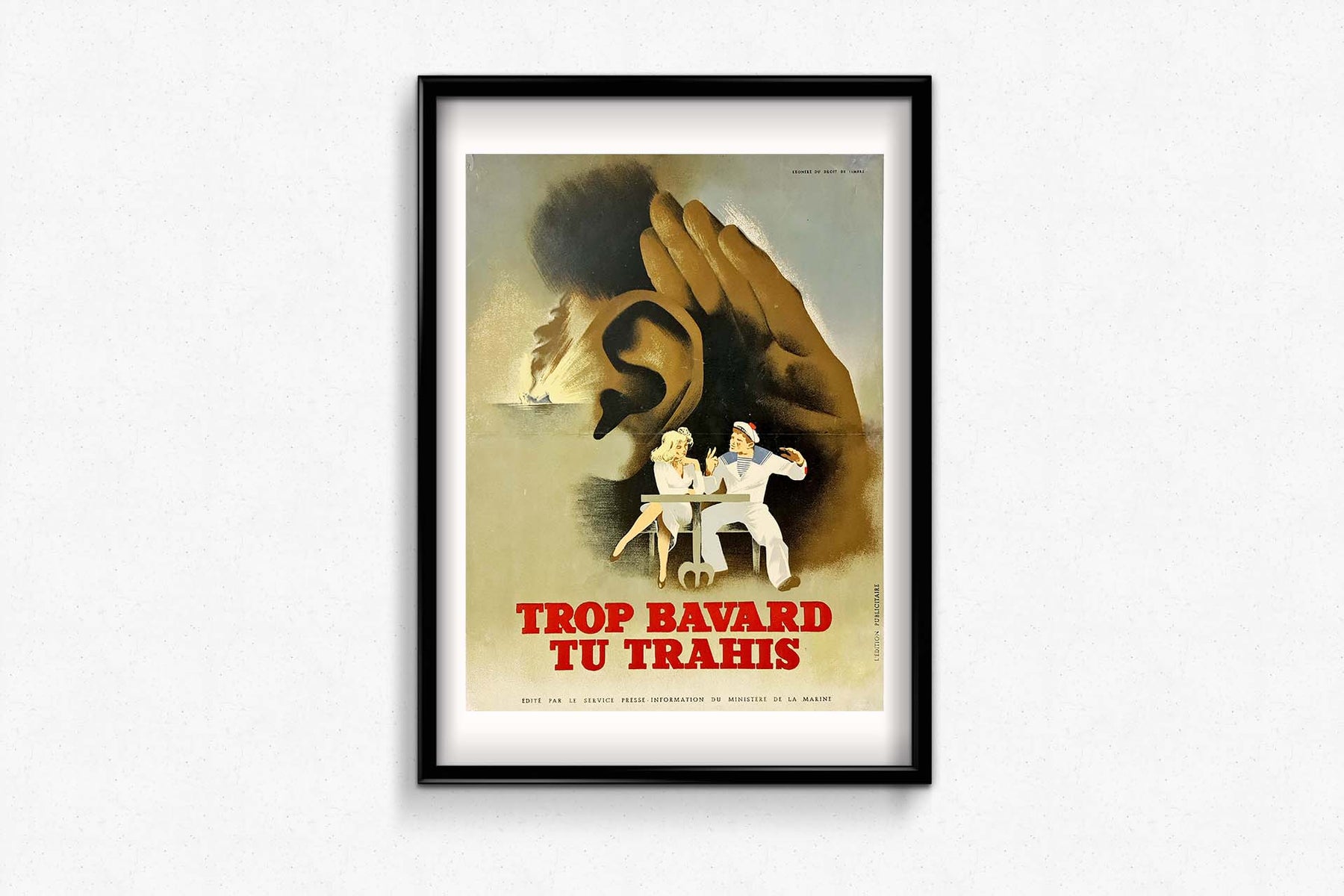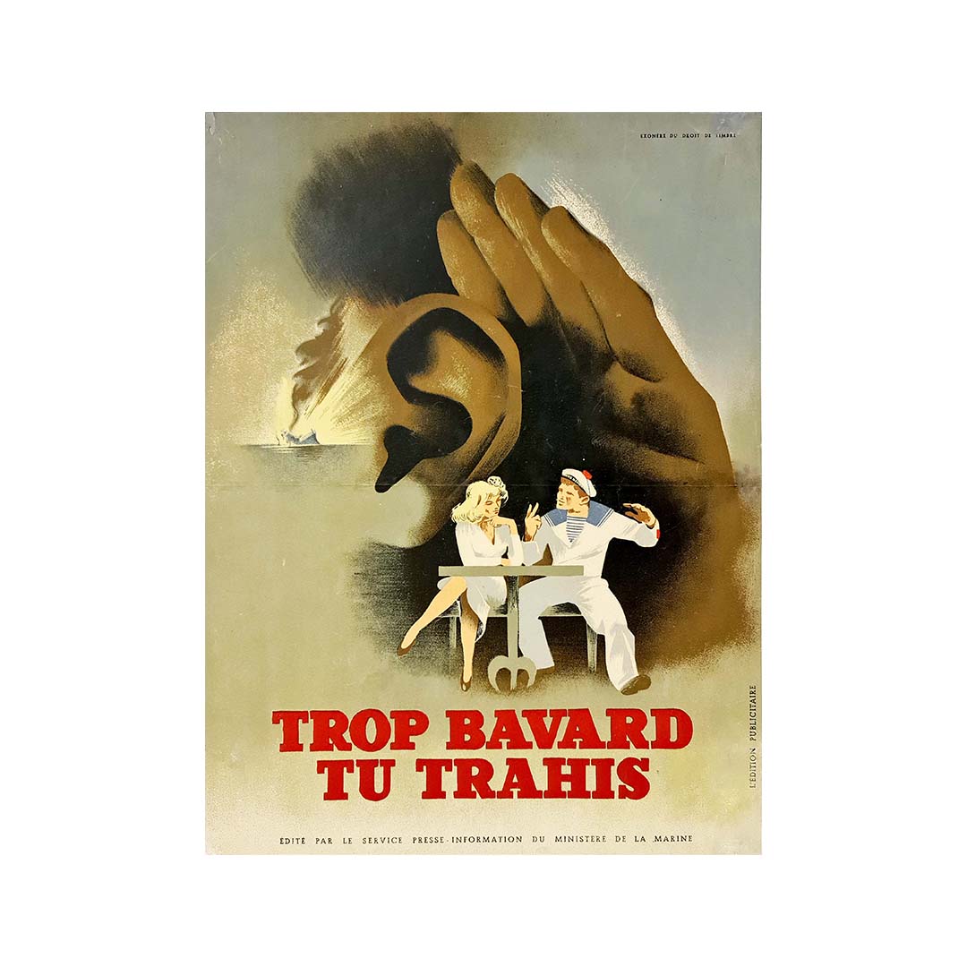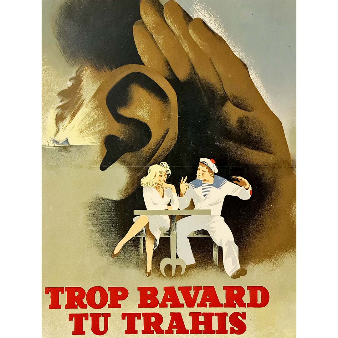 Affiche originale publiée par le service de presse et d'information du ministère de la Marine, qui avertit : trop bavard, vous trahissez.