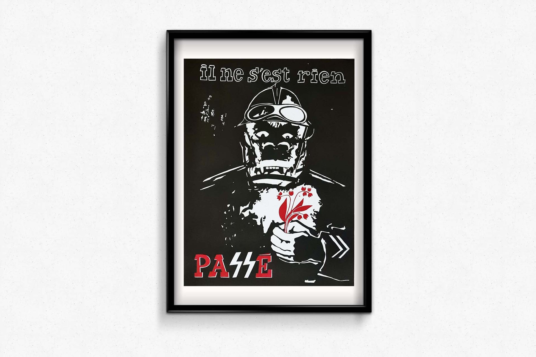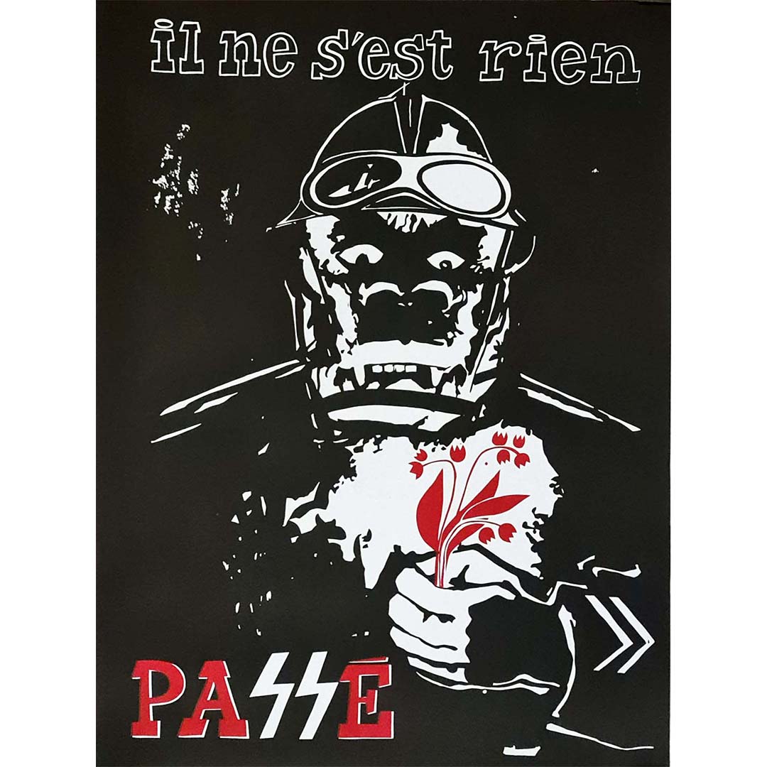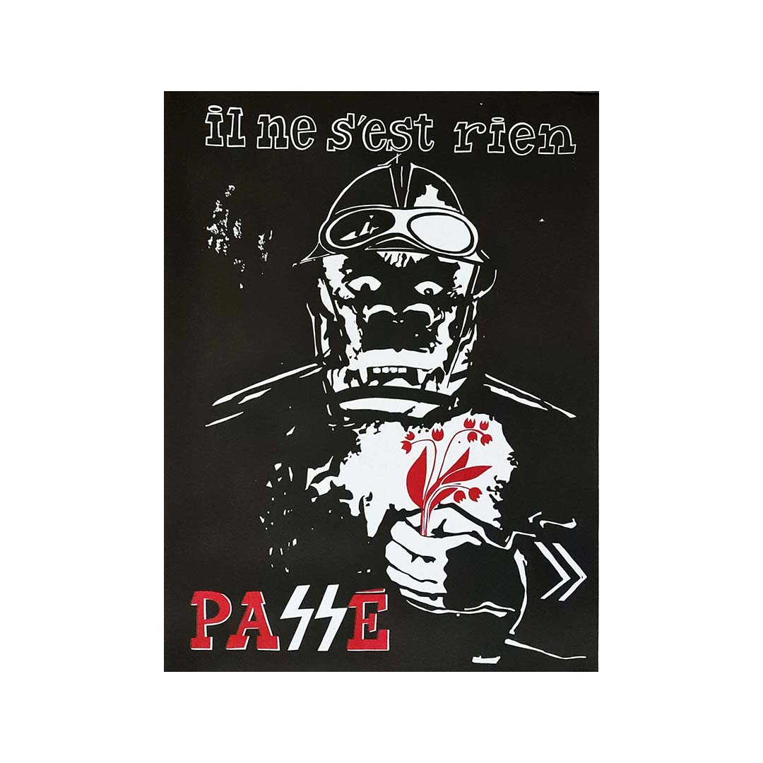 Belle affiche originale de mai 68, rien ne s'est passé (un CRS au visage bestial tient un brin de muguet. Référence typographique aux SS).