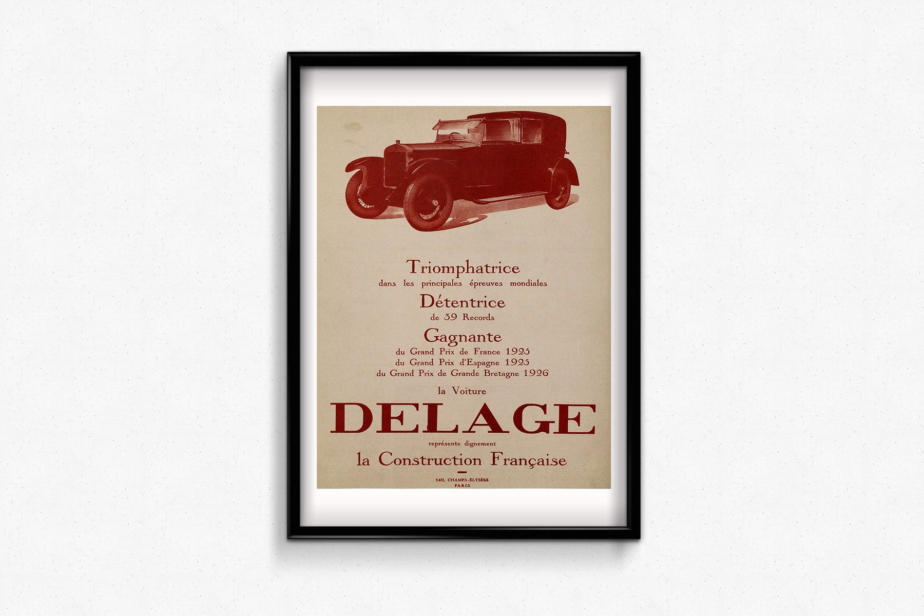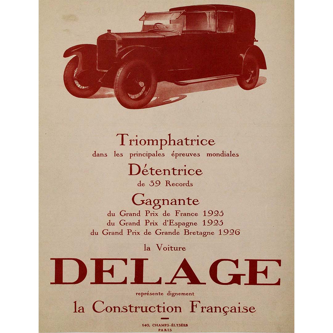 La publicité de cette époque mettait souvent l'accent sur le luxe, la vitesse et la sophistication technique, reflétant ainsi l'évolution de la société d'après-guerre vers la modernité et la société de consommation. Le design élégant et raffiné des voitures Delage exprimait l'excellence esthétique et fonctionnelle de la marque, la positionnant comme leader sur le marché automobile de luxe. En associant la marque à la « construction française », l'affiche ne se contente pas de promouvoir la voiture, elle évoque également un sentiment de fierté nationale et de réussite technologique.