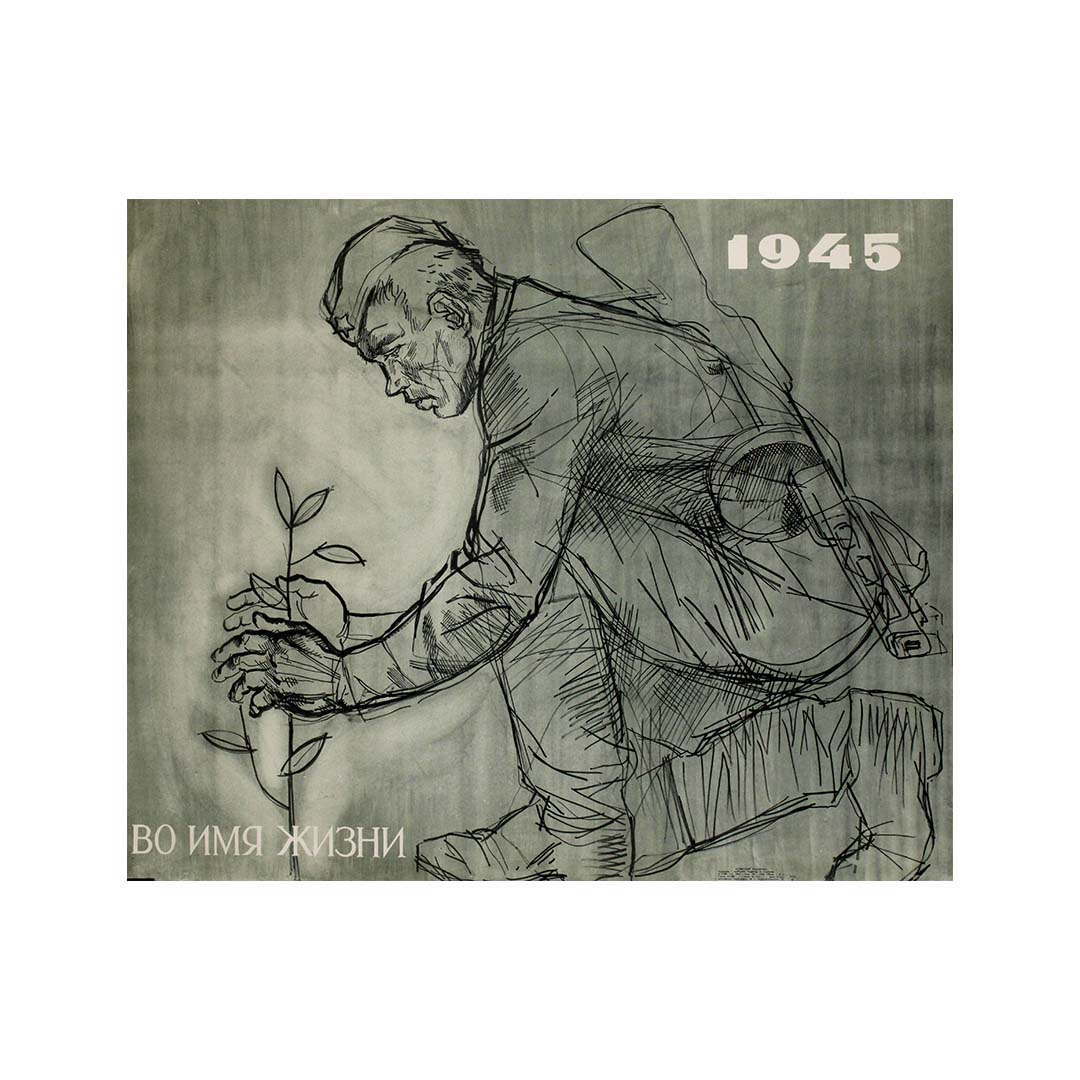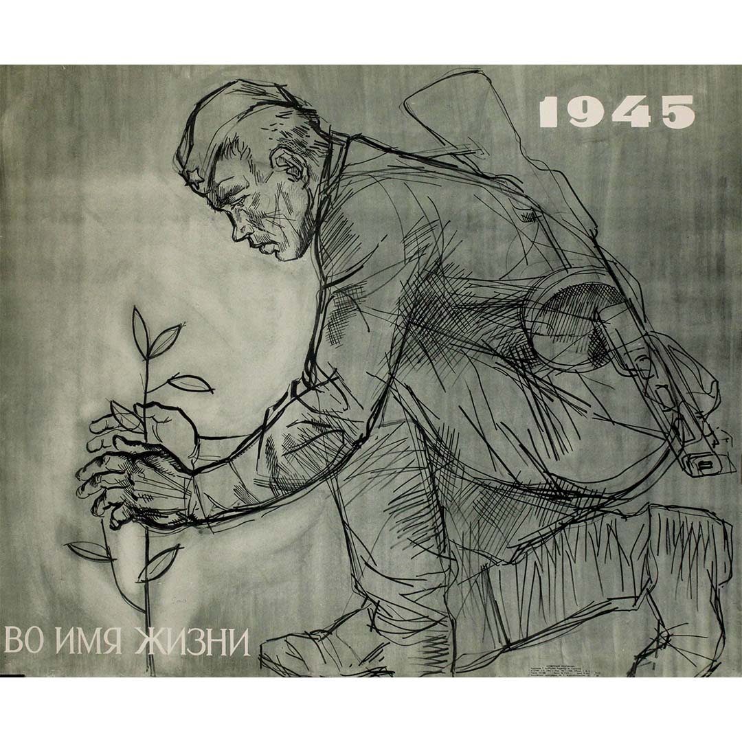 Cette affiche soviétique originale de 1965 est une représentation profondément émouvante de la résilience et du renouveau de l'après-guerre. L'illustration monochrome, aux allures d'esquisse, représente un soldat soviétique, las mais déterminé, plantant un jeune arbre – un symbole poignant de renaissance et d'espoir après les ravages de la Seconde Guerre mondiale. Son visage, marqué par l'âge et les épreuves, témoigne des sacrifices consentis, tandis que le fusil en bandoulière rappelle la guerre à laquelle il vient de survivre.