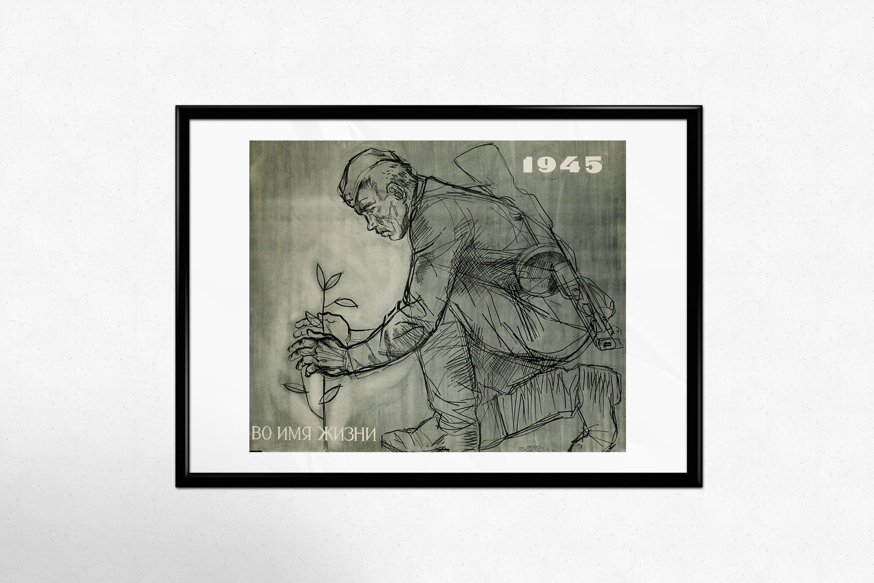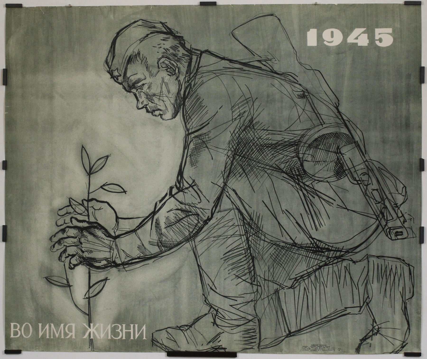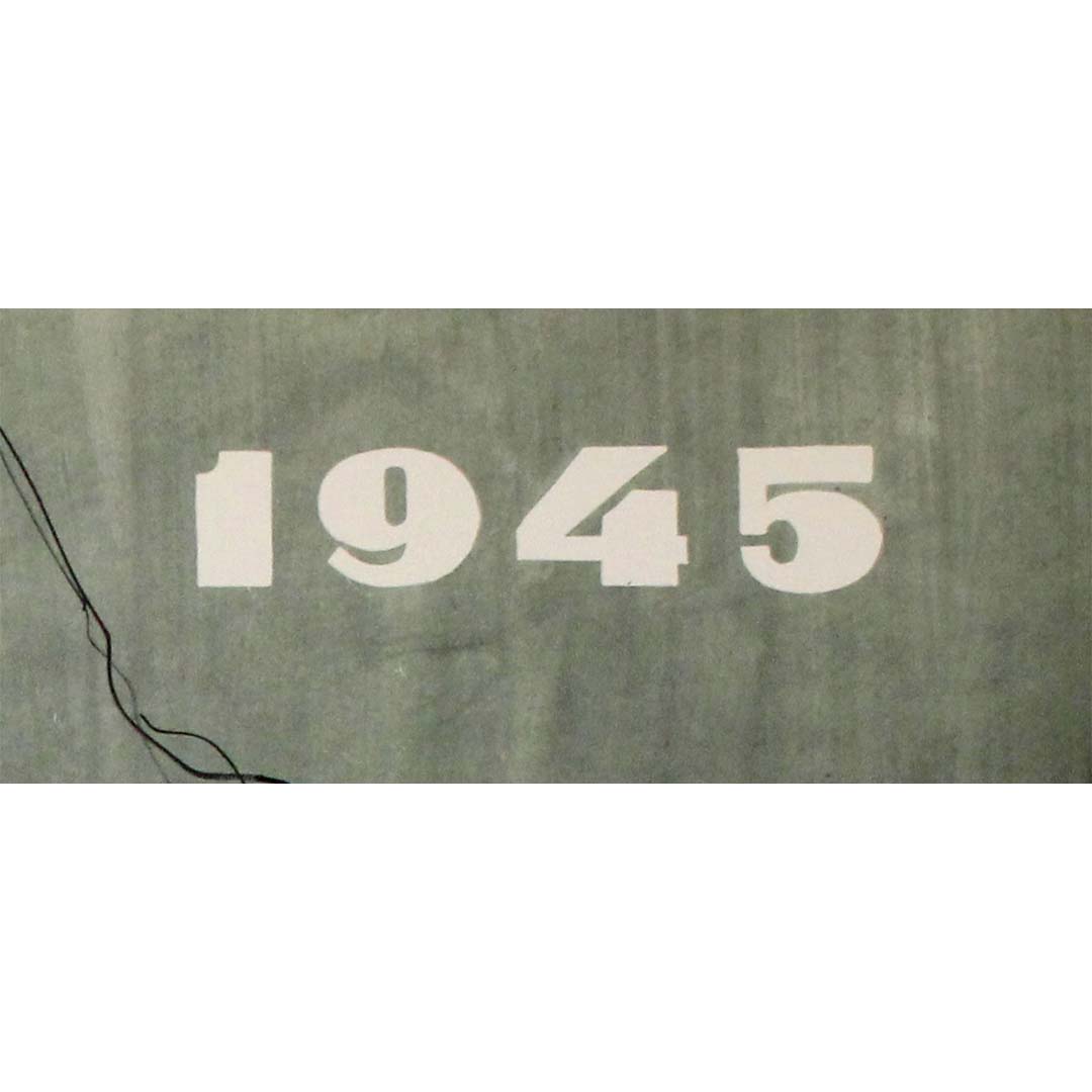 L'année « 1945 » en gras marque la fin de la guerre et le début de la reconstruction. Contrairement à la propagande soviétique habituelle qui glorifie la force et la victoire, cette affiche adopte une approche plus introspective et humaniste, mettant l'accent sur le rôle du soldat dans la reconstruction plutôt que dans la destruction.