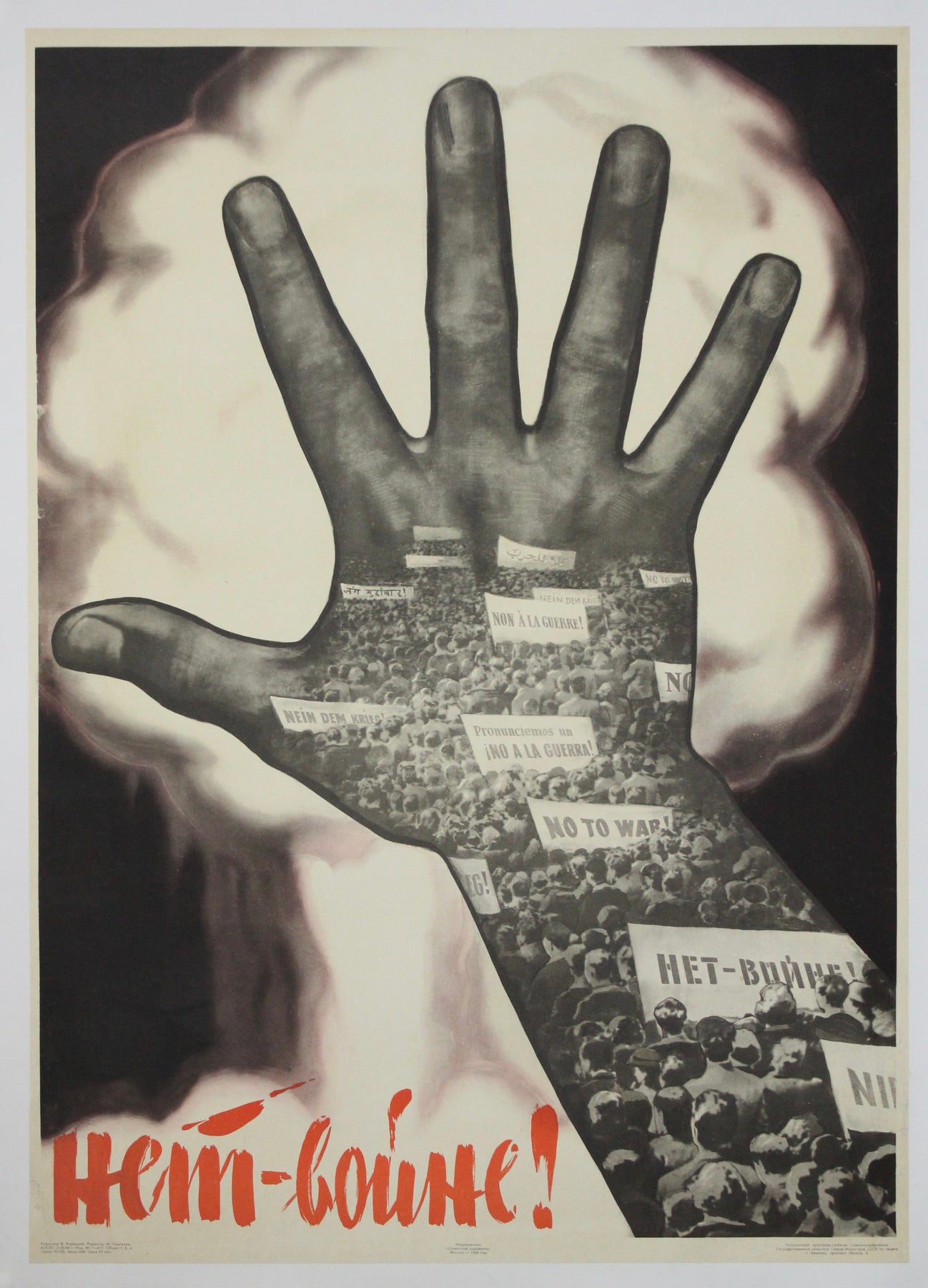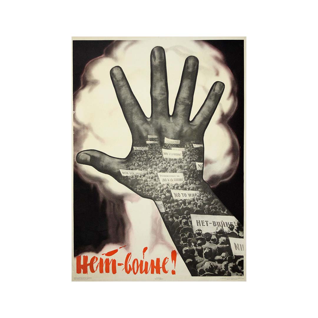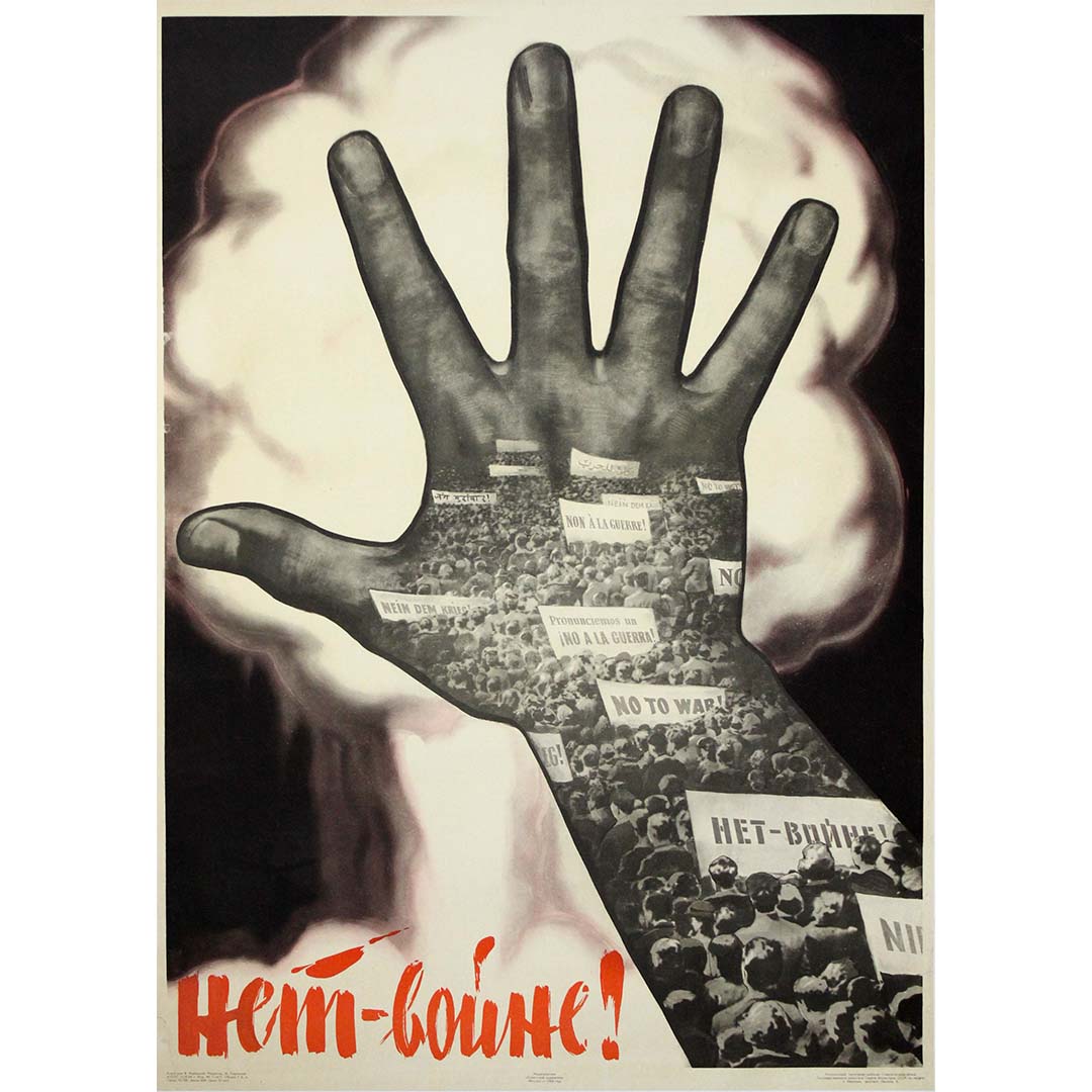 Image saisissante et inoubliable de l'époque de la Guerre froide, cette affiche soviétique originale de 1964 délivre un message fort et universel : Нет войне ! — Non à la guerre ! Une main monumentale, levée en signe de défi, domine la composition, ses doigts tendus faisant office de bouclier contre la lueur menaçante d'une explosion nucléaire en arrière-plan. Mais il ne s'agit pas d'une main ordinaire : à l'intérieur de sa forme, un photomontage de manifestants brandissant des pancartes multilingues exprime un cri mondial uni pour la paix.