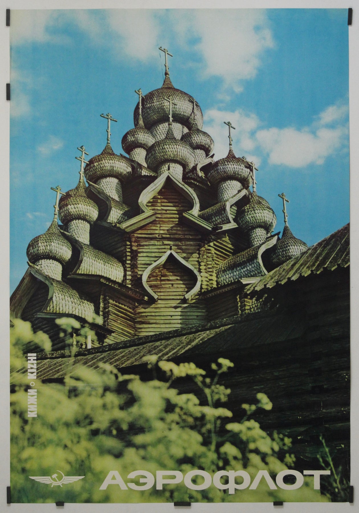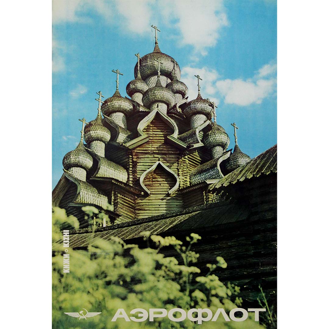 Sous l'image, le logo d'Aeroflot et son nom en cyrillique apparaissent en gras, soulignant le rôle de la compagnie aérienne comme porte d'entrée vers les vastes et riches paysages de l'Union soviétique. Le texte vertical à gauche – « КИЖИ » (Kizhi) – situe l'endroit, invitant le spectateur à un voyage dans le passé à travers le prisme du transport aérien moderne.