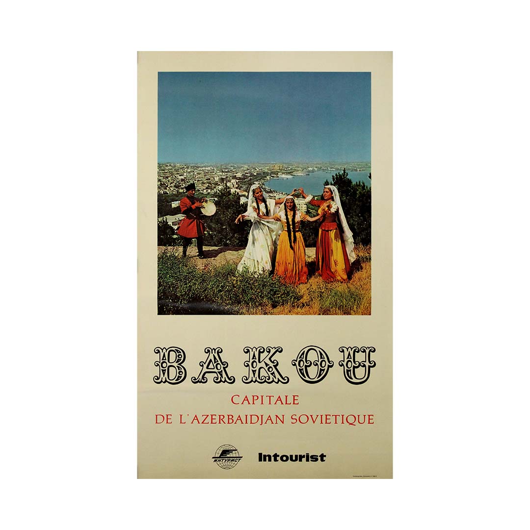 Cette affiche touristique soviétique originale et colorée, éditée par Intourist, l'agence officielle du tourisme de l'URSS, invite les voyageurs francophones à découvrir Bakou, la capitale dynamique de l'Azerbaïdjan soviétique. Rayonnante de fierté culturelle et d'unité, l'affiche offre un aperçu captivant des riches traditions azerbaïdjanaises, avec la mer Caspienne en toile de fond.