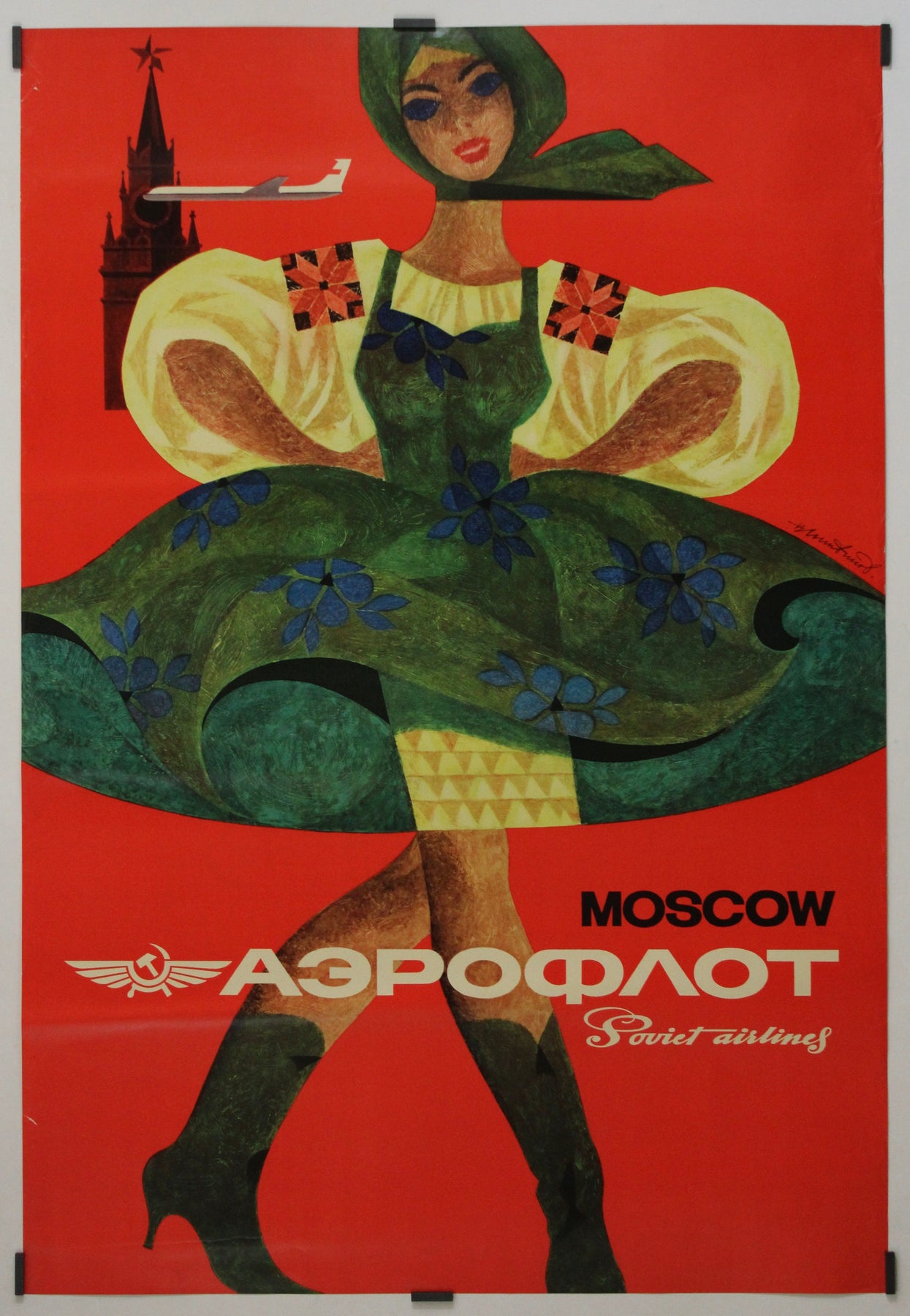 Au centre de l'affiche figure une femme stylisée en costume traditionnel russe, aux formes amples et aux couleurs vives. Son allure dynamique et son assurance suggèrent une présence à la fois accueillante et puissante, mêlant folklore et modernité. Au-dessus de son épaule, un avion Aeroflot aux lignes épurées survole la tour Spasskaïa du Kremlin, symbolisant l'union de la tradition et du progrès technologique. Le fond rouge éclatant souligne l'identité et le dynamisme nationaux, dans un langage visuel puisant ses racines dans le réalisme socialiste et l'esthétique des années 1960.