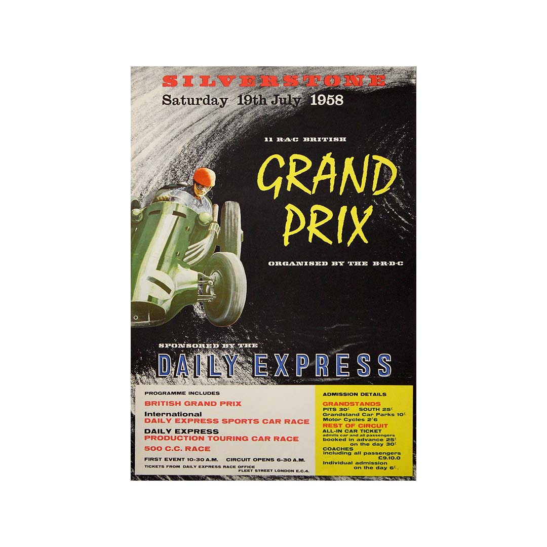 This striking 1958 original poster for the British Grand Prix at Silverstone captures the speed, danger, and glamour of post-war motor racing at the dawn of Formula One’s golden age. Announcing the race of Saturday, 19 July 1958, organized by the British Racing Drivers’ Club (BRDC) and sponsored by the Daily Express, the poster is both a sporting document and a powerful example of mid-century graphic advertising.