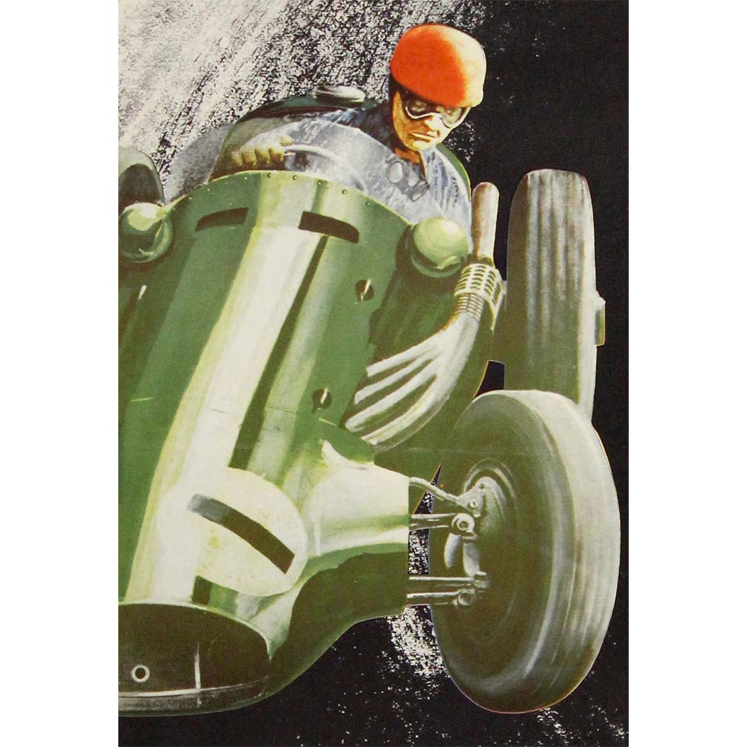 The hand-painted typography of “GRAND PRIX,” rendered in electric yellow, reinforces the sense of urgency and spectacle, while the detailed lower section listing race categories, admission prices, and schedules grounds the image firmly in its historical moment. Such posters were not only promotional tools, but essential components of racing culture, announcing events to a broad public at a time when motorsport was becoming a mass phenomenon.