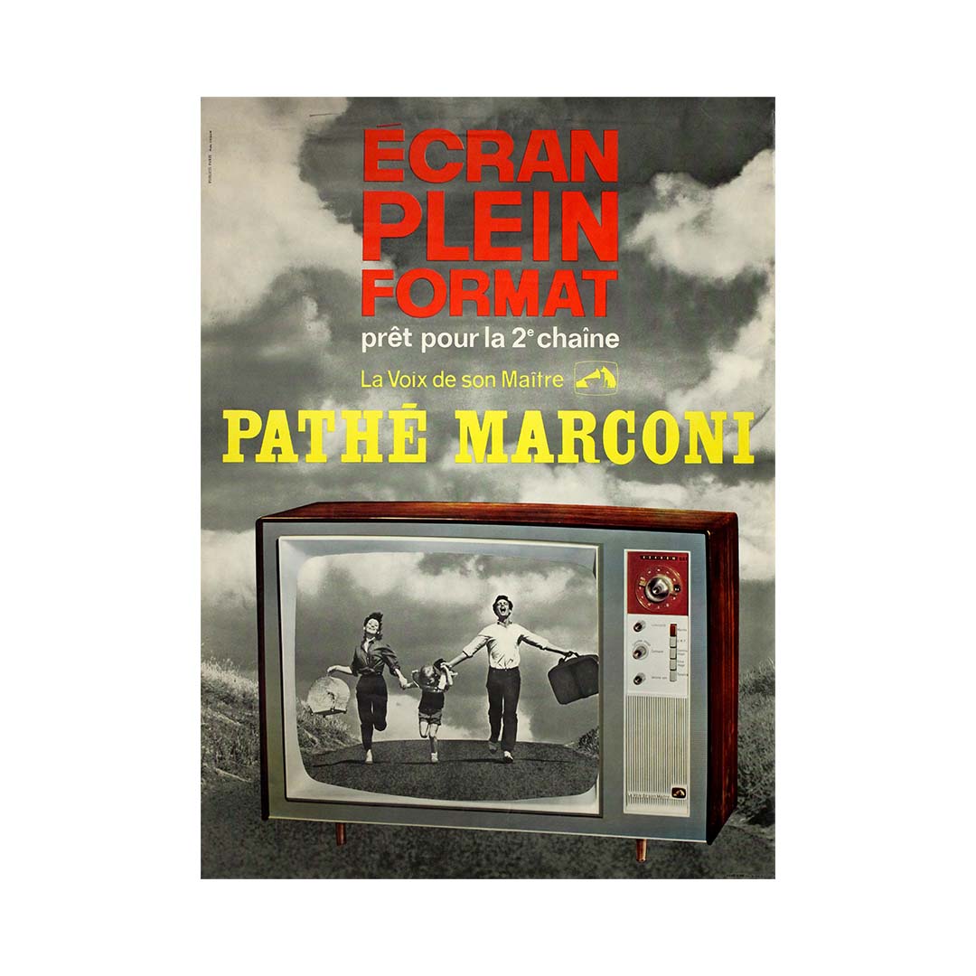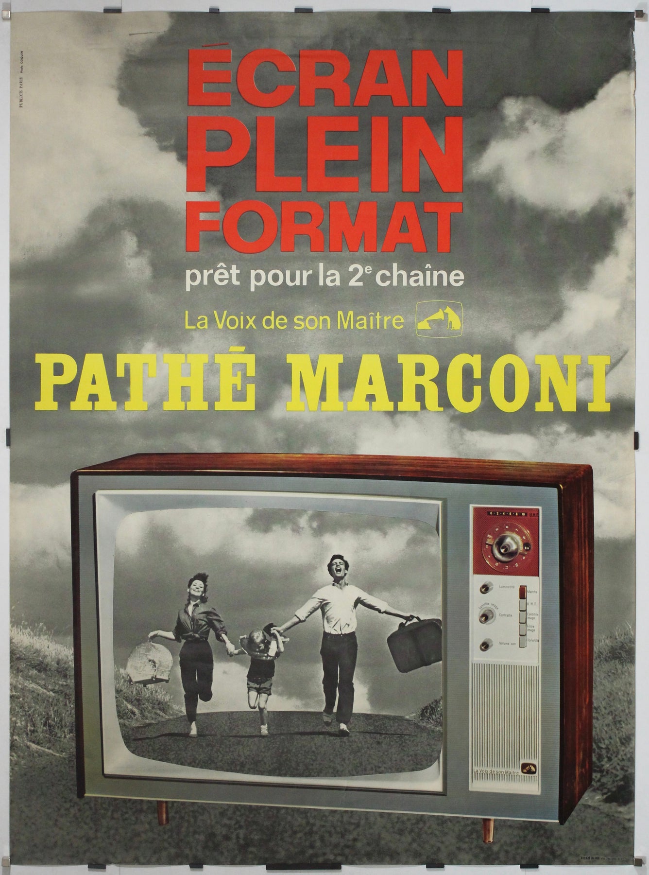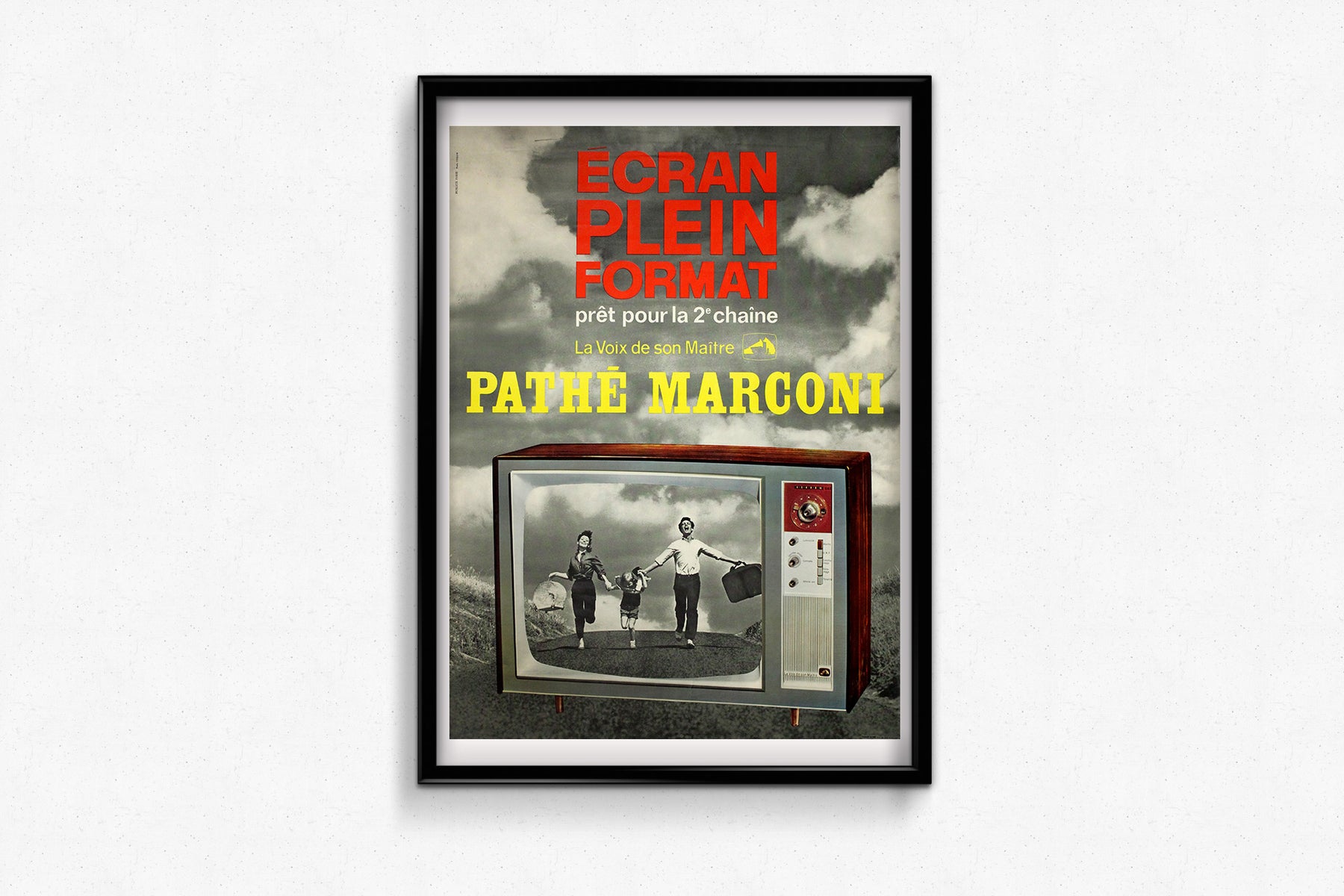 Cette superbe affiche vintage du début des années 1970 — probablement vers 1971 — fait la promotion du téléviseur « Écran Plein Format » de Pathé Marconi , un nom majeur de l'innovation audiovisuelle française d'après-guerre et un partenaire clé de La Voix de Son Maître .