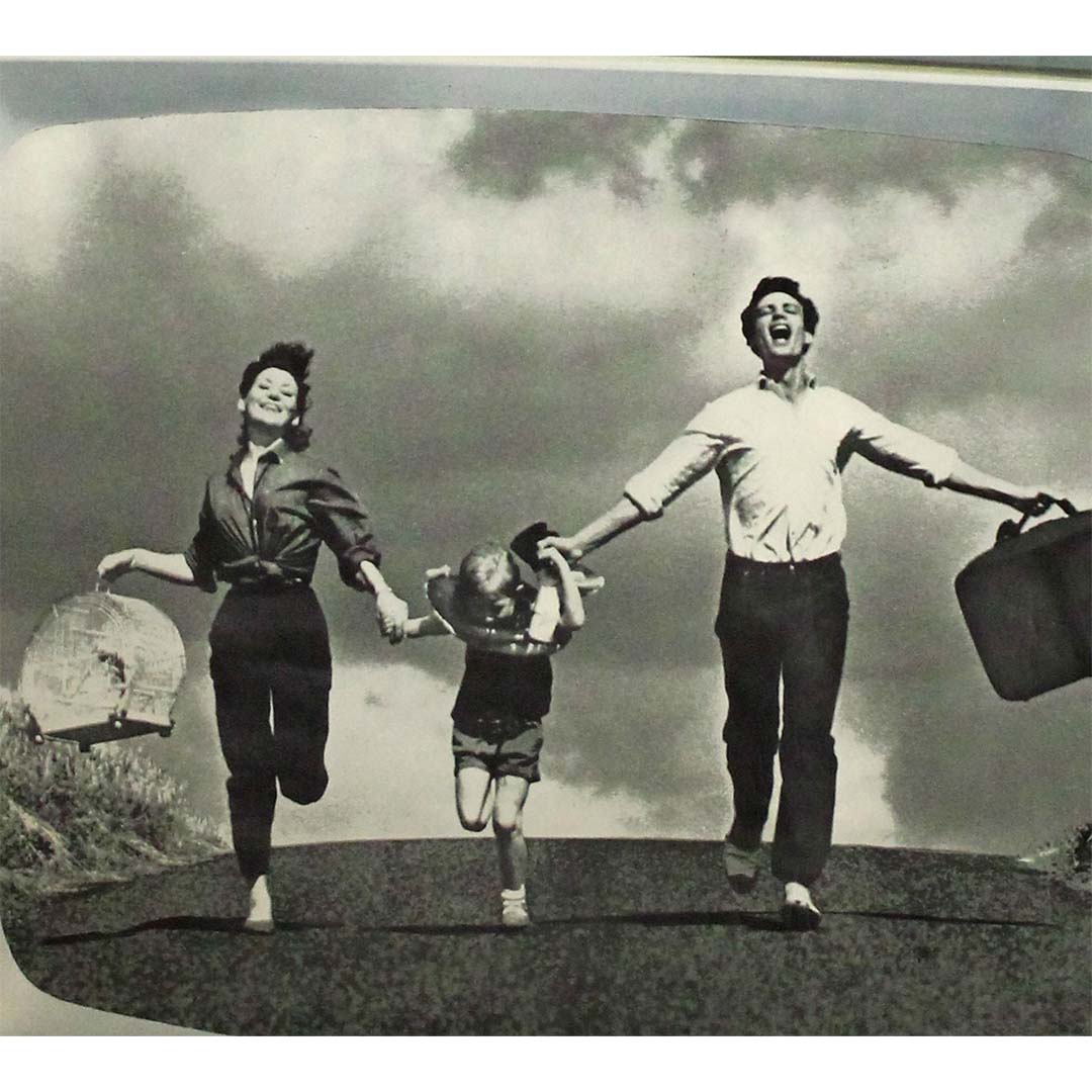 Sur un ciel dramatique aux nuages stylisés, l'affiche annonce avec audace l'arrivée d'un téléviseur prêt pour la deuxième chaîne de télévision française – un événement culturel majeur dans le paysage audiovisuel de l'époque. Au centre, un téléviseur vintage à cadre en bois et finitions chromées diffuse une joyeuse image en noir et blanc d'une famille courant main dans la main – symbole de liberté, de progrès et de bonheur domestique moderne.