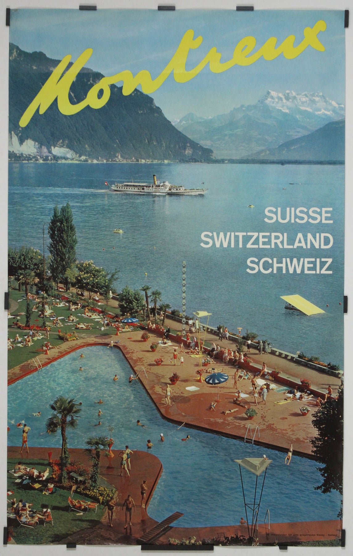 Au cœur de la composition se trouve une saisissante photographie en couleurs : une vue panoramique animée de la piscine du lac Léman de Montreux, où baigneurs et amateurs de soleil se prélassent sur des terrasses carrelées, ombragées par des parasols et des palmiers. La scène est encadrée par les eaux bleues et tranquilles du lac Léman, un bateau à aubes historique glissant sur sa surface, et les majestueuses Alpes enneigées à l’horizon. C’est une juxtaposition saisissante des plaisirs estivaux et de la glace éternelle.