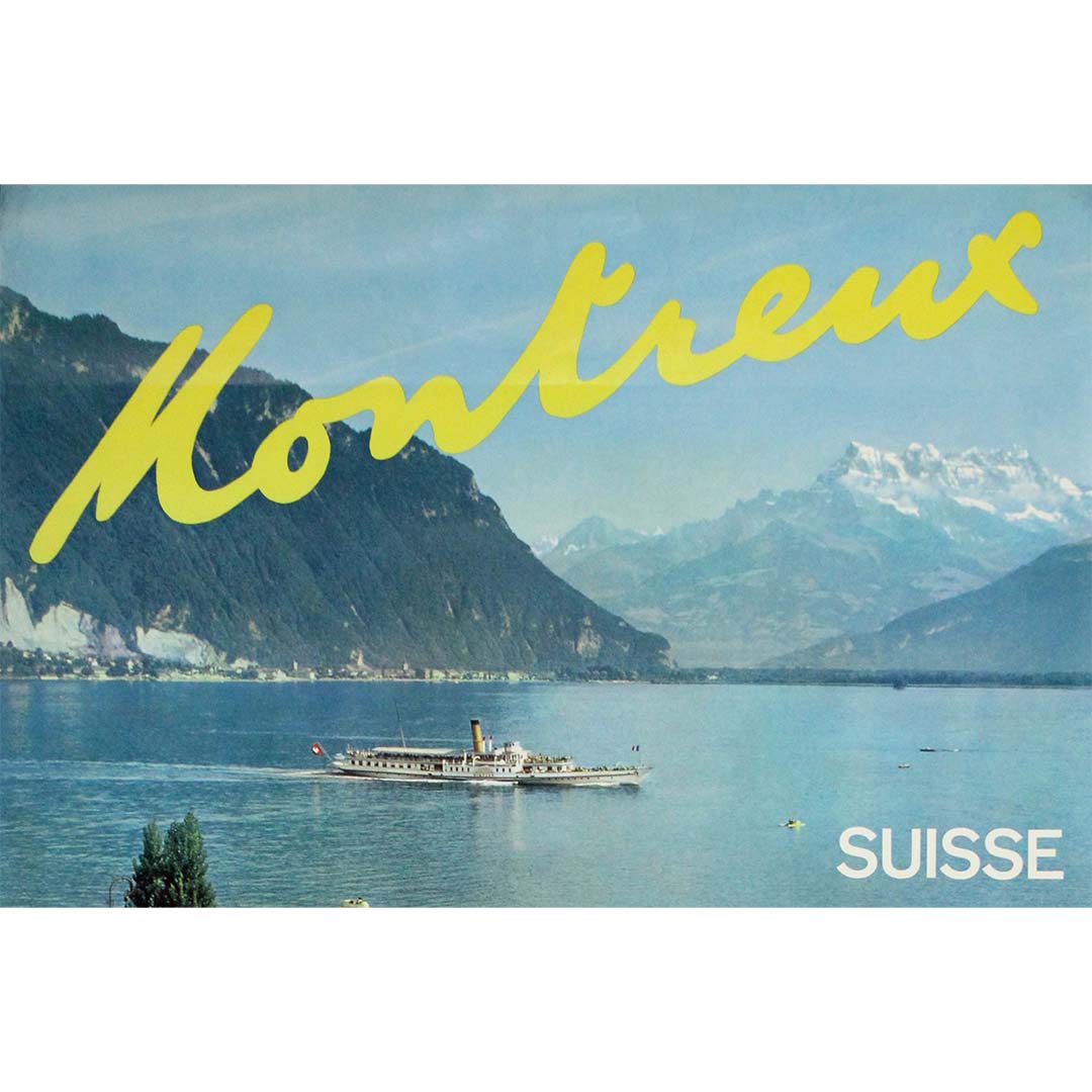 Cette affiche de voyage originale et colorée des années 1960 capture l'atmosphère ensoleillée et décontractée de Montreux, ville emblématique de la Riviera suisse, nichée entre les Alpes et les rives du lac Léman. Conçue dans le cadre des campagnes promotionnelles d'après-guerre de l'Office national suisse du tourisme, elle reflète une époque où le tourisme était en plein essor et où la Suisse se positionnait comme une destination synonyme de santé, de beauté et de glamour moderne.