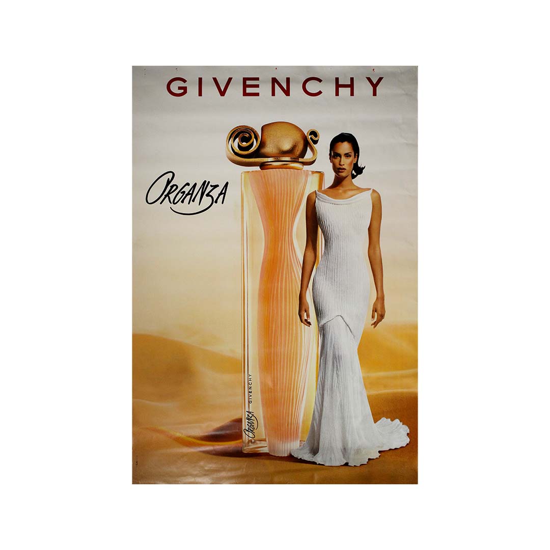 Lancé en 1996, Organza, créé par la parfumeuse Sophie Labbé, est rapidement devenu le parfum emblématique de Givenchy, réputé pour son riche mélange de fleurs blanches, d'ambre et de notes boisées. La campagne de 1997, dont est issue cette affiche, a définitivement ancré la fragrance comme un symbole de féminité raffinée et de luxe.