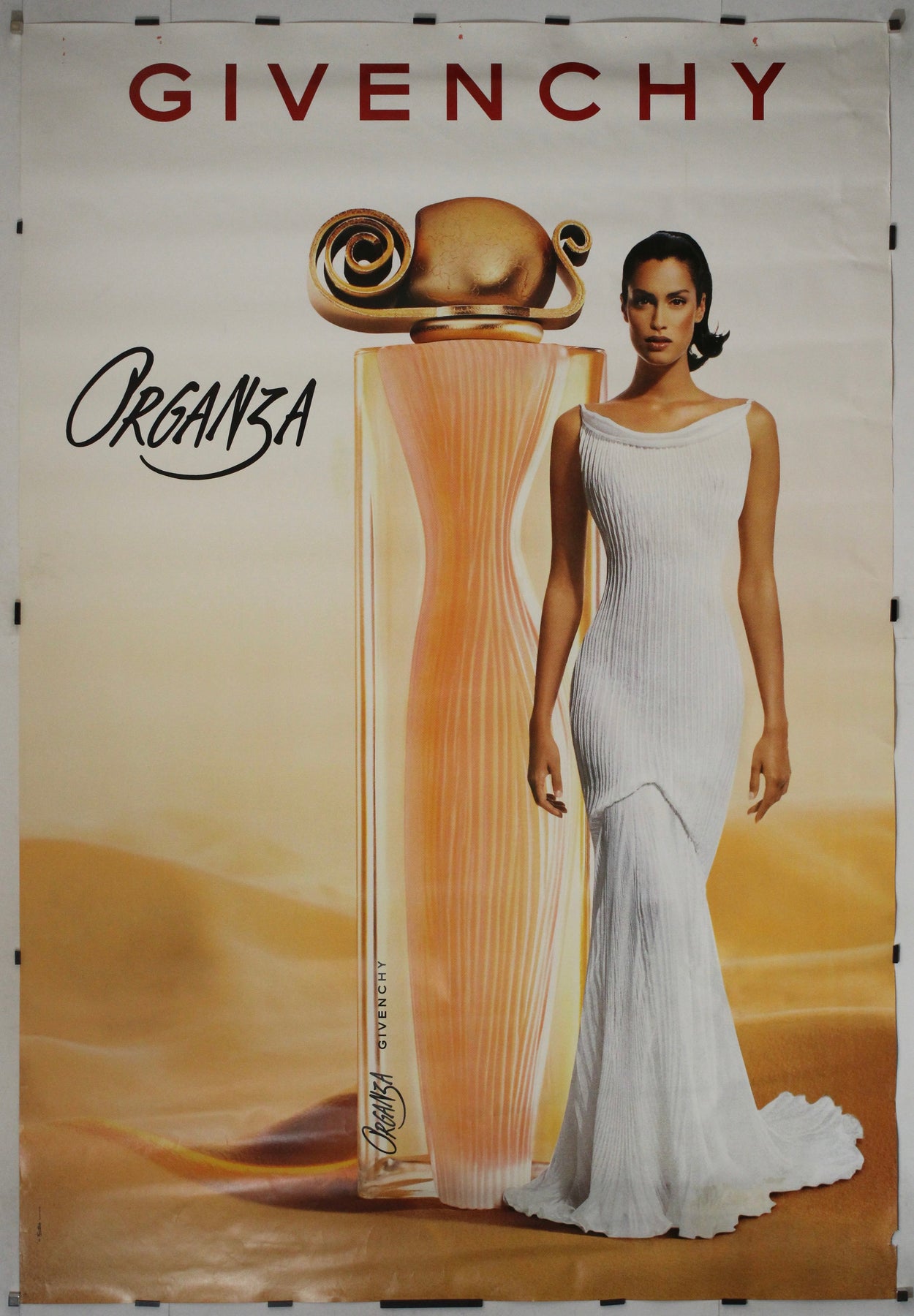 Incarnation saisissante de l'élégance et du raffinement de la fin des années 1990, cette affiche publicitaire originale de 1997 pour le parfum iconique « Organza » de Givenchy capture l'essence d'une féminité intemporelle. Sur un fond doux et ensoleillé évoquant chaleur et sensualité, la composition attire immédiatement le regard vers le flacon sculptural – dessiné par le légendaire Serge Mansau – un chef-d'œuvre en soi, inspiré par la silhouette féminine.
