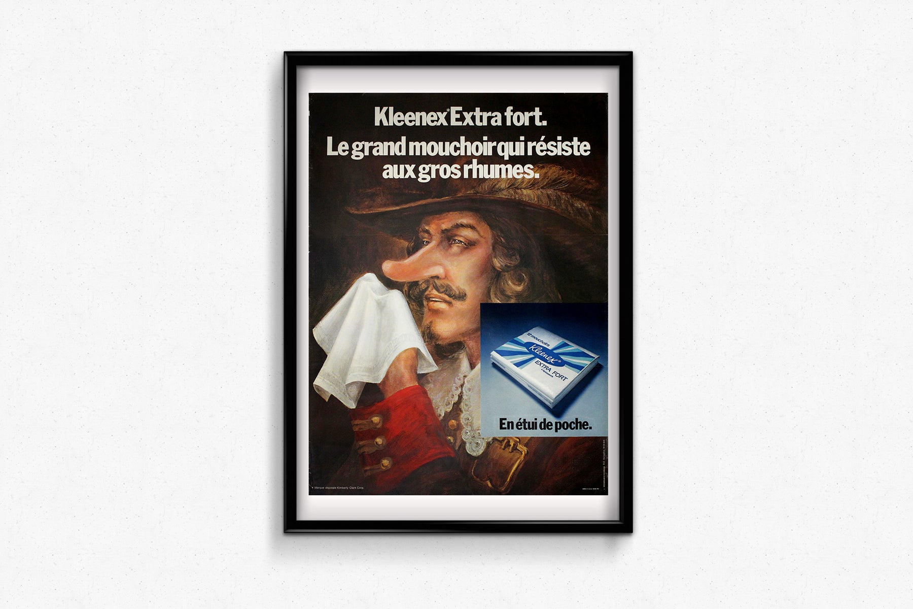 Spirituelle, audacieuse et typiquement française dans son humour, cette affiche publicitaire originale des années 1990 pour Kleenex Extra Fort offre un mélange magistral de jeu visuel et de slogan percutant. Au centre, un personnage illustré rappelle indéniablement Cyrano de Bergerac – célèbre pour son esprit poétique et son nez légendaire – ici représenté avec une emphase théâtrale, vêtu d'un costume du XVIIe siècle. Un grand mouchoir Kleenex est posé sur son nez, soulignant le slogan : « Le grand mouchoir qui résiste aux gros rhumes ».