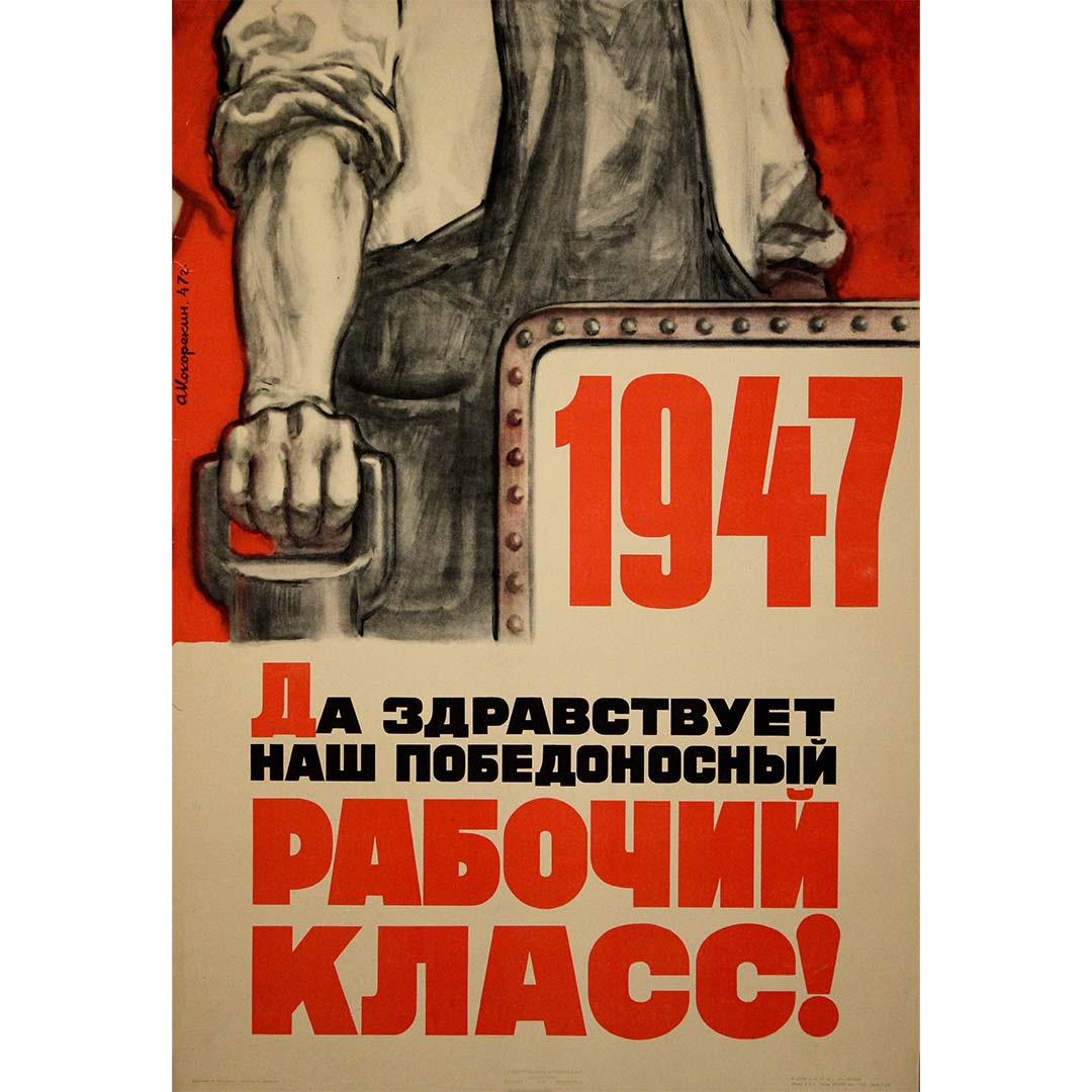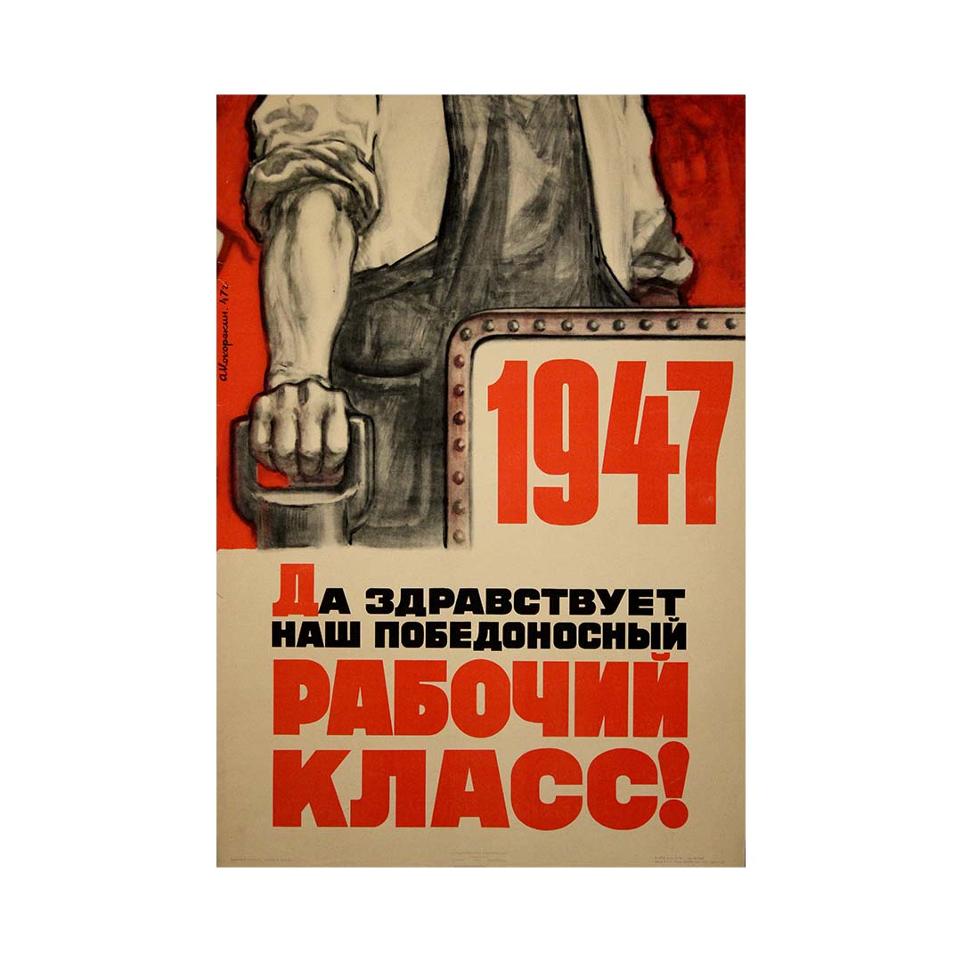 Beyond its striking graphic impact, this poster stands as a historical document of a pivotal moment. It captures the transition from wartime mobilisation to peacetime reconstruction, when imagery was used to foster pride, unity, and unwavering faith in labour as the foundation of society. Today, it remains a compelling example of mid-20th-century Soviet poster art—at once political, symbolic, and visually commanding.