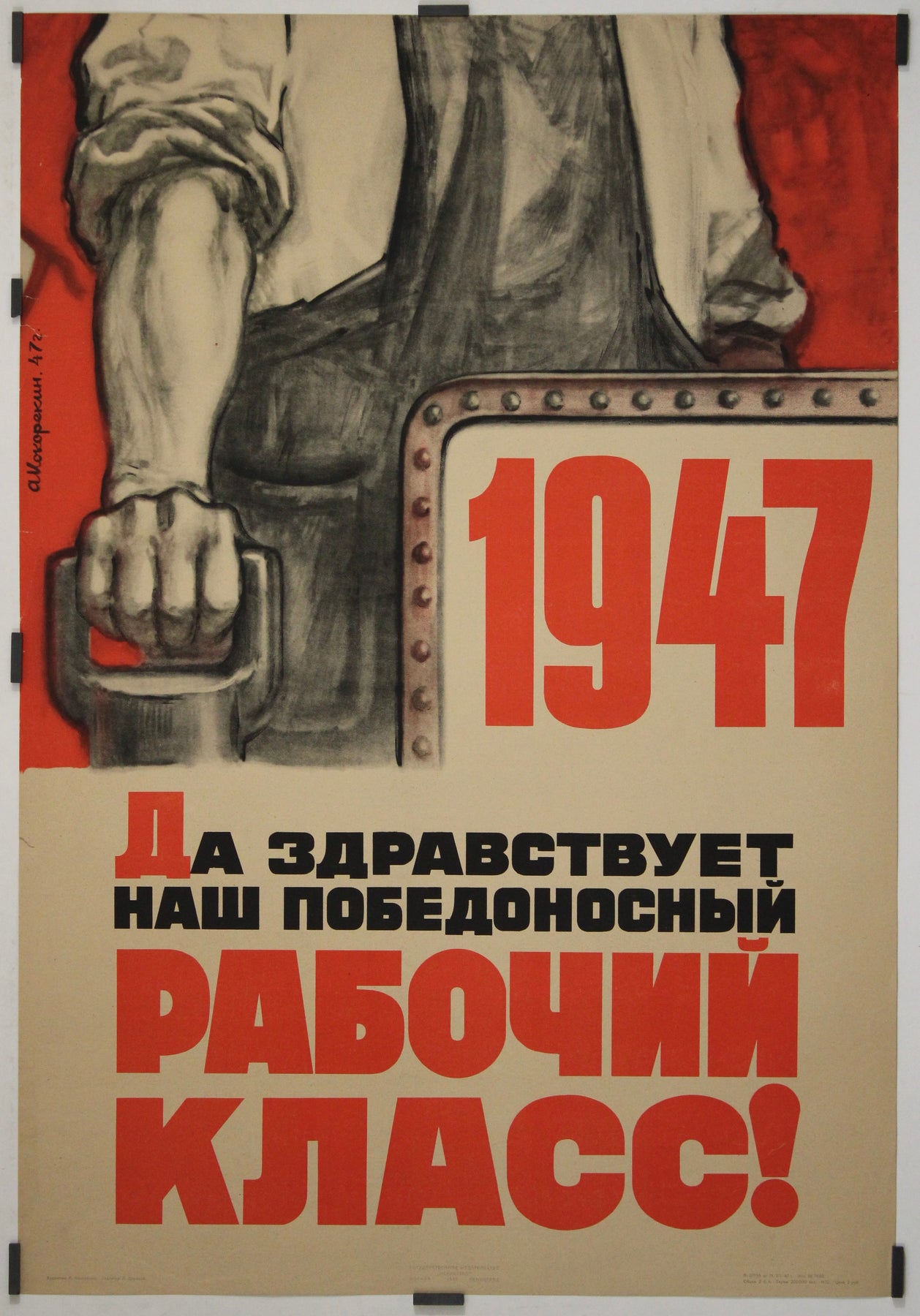 Created during the early post-war period, the poster reflects the visual language of late Stalinist propaganda: bold typography, dramatic close-up framing, and a limited palette dominated by red, black, and white. Rather than depicting a specific individual, the worker is presented as an archetype—the embodiment of the victorious proletariat. The emphasis on strength, resolve, and industrial power underscores the ideological message that it was the working class who had not only defended the country, but who would now forge its future.