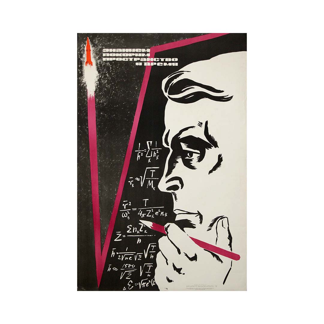 This striking 1965 Soviet poster embodies the intellectual and cosmic ambition that defined the USSR during the height of the Space Age. Combining portraiture, abstraction, and scientific symbolism, the composition presents science itself as the engine of progress and the key to mastering the universe.