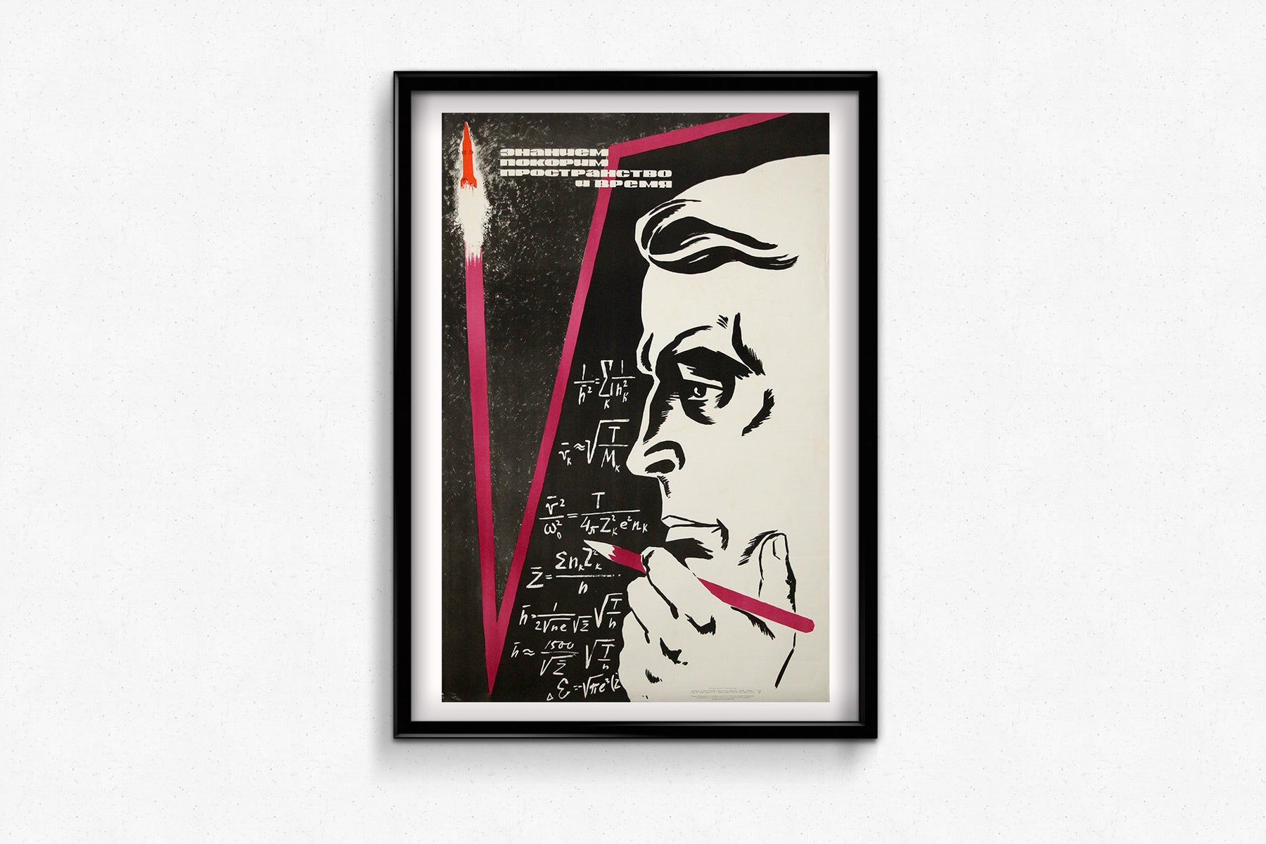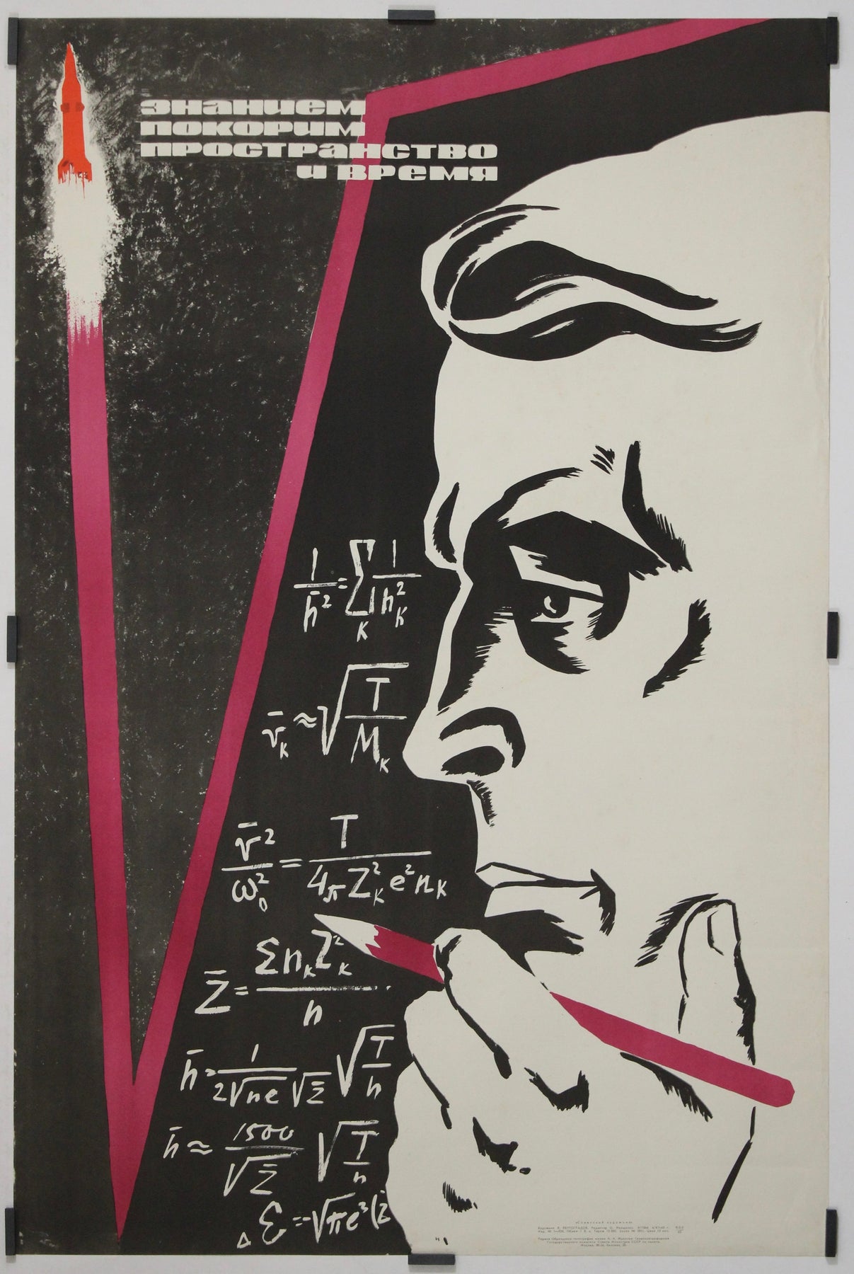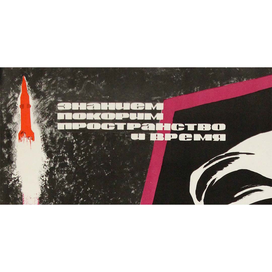 At left, a rocket ascends vertically, cutting through darkness in a blaze of light. A bold magenta diagonal slashes across the composition, injecting energy and movement while guiding the eye between intellect and technology. The restricted palette—black, white, red, and magenta—heightens contrast and drama, a hallmark of late Soviet modernist poster design.