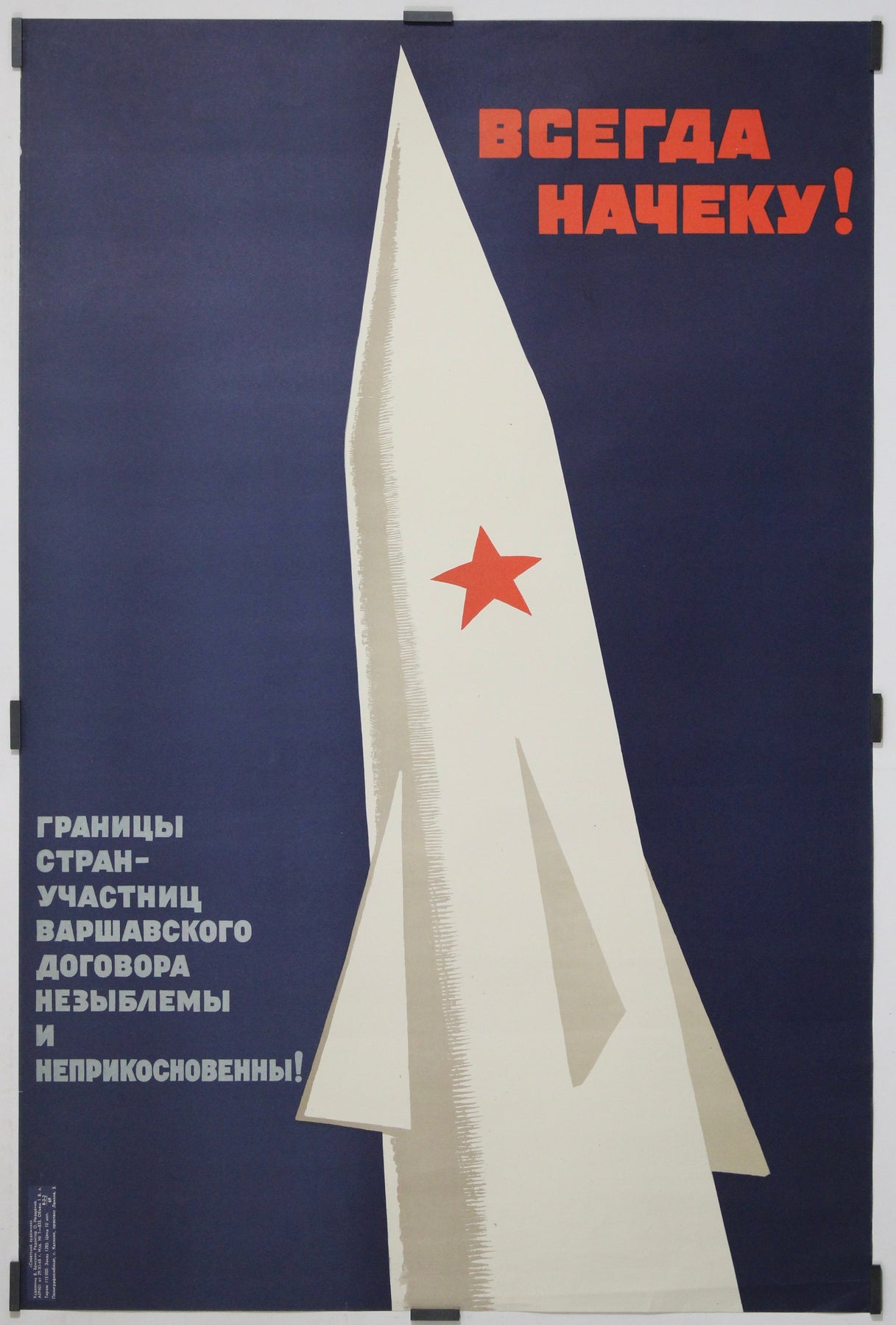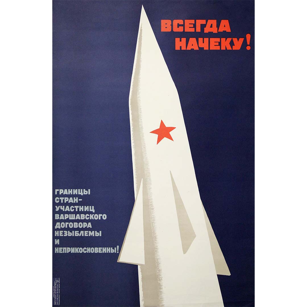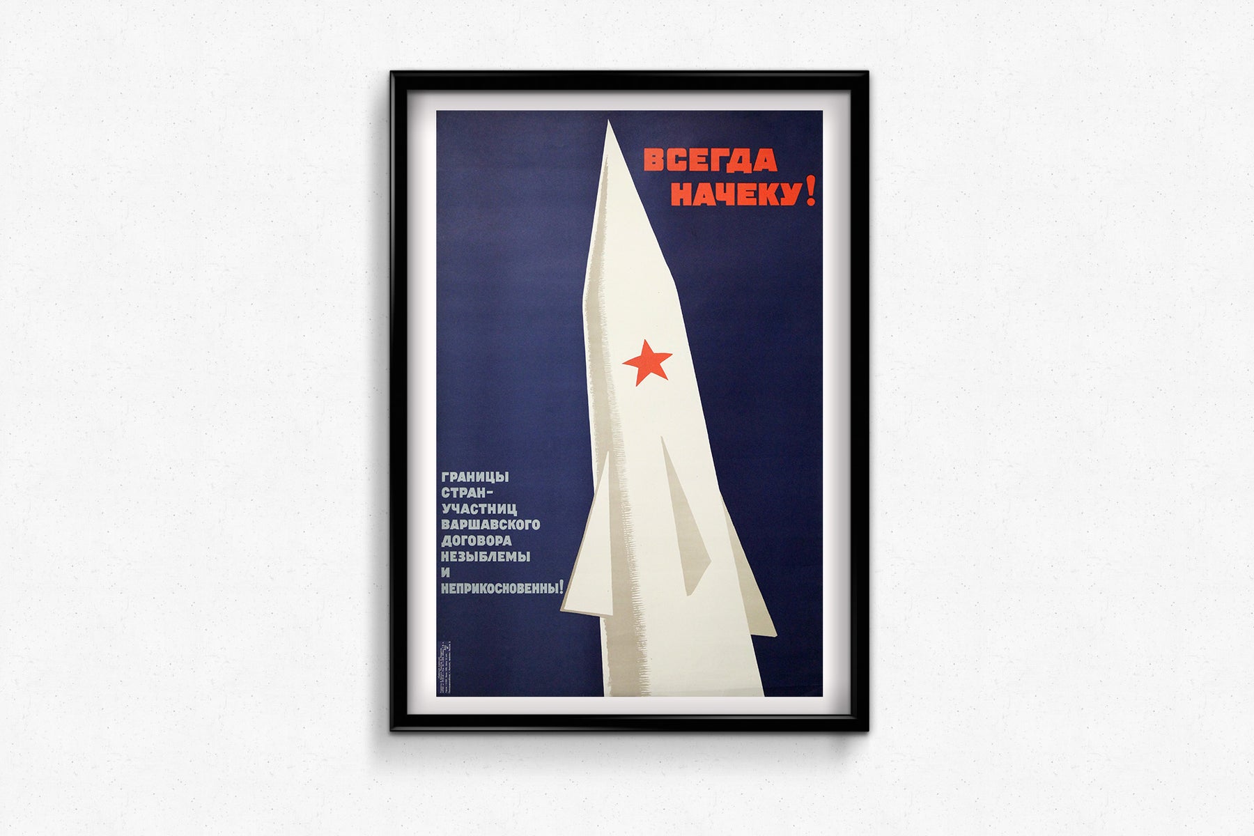 Produced shortly after major events such as the Prague Spring and its suppression in 1968, the poster belongs to a moment when the Soviet Union reaffirmed control over its sphere of influence. The imagery of a missile — more abstract than realistic — evokes both space-age modernity and nuclear deterrence, merging technological progress with military ideology.
