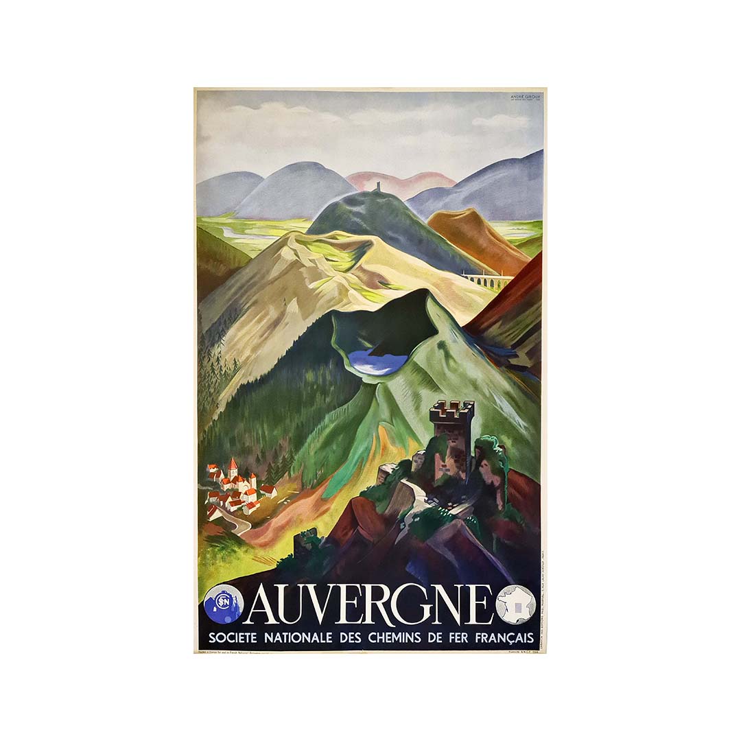 Belle affiche originale de l'illustrateur André Giroux peintre et pionnier de la photographie, pour la région Auvergne par la Société Nationale des Chemins de Fer Français en 1938.