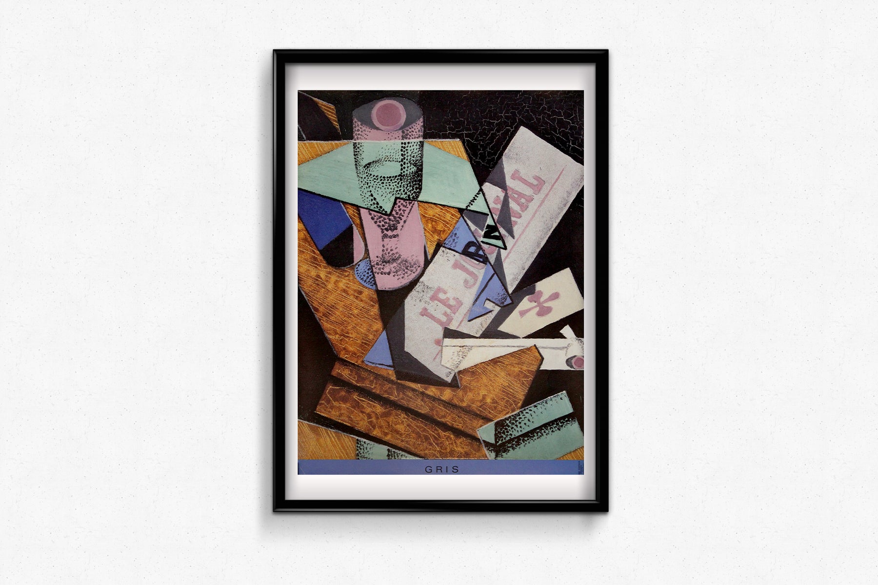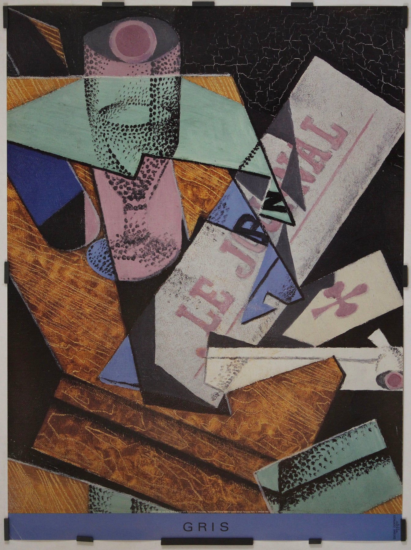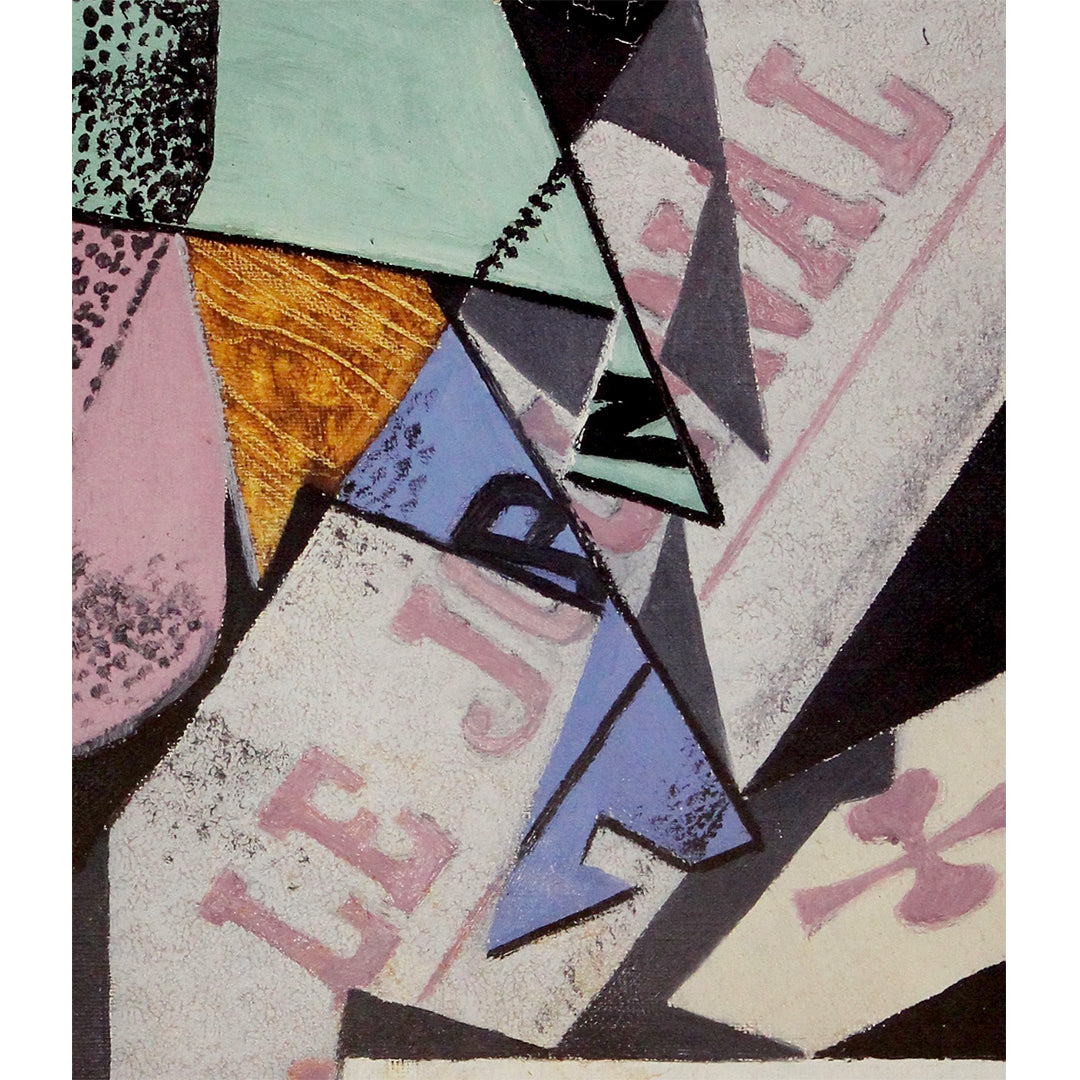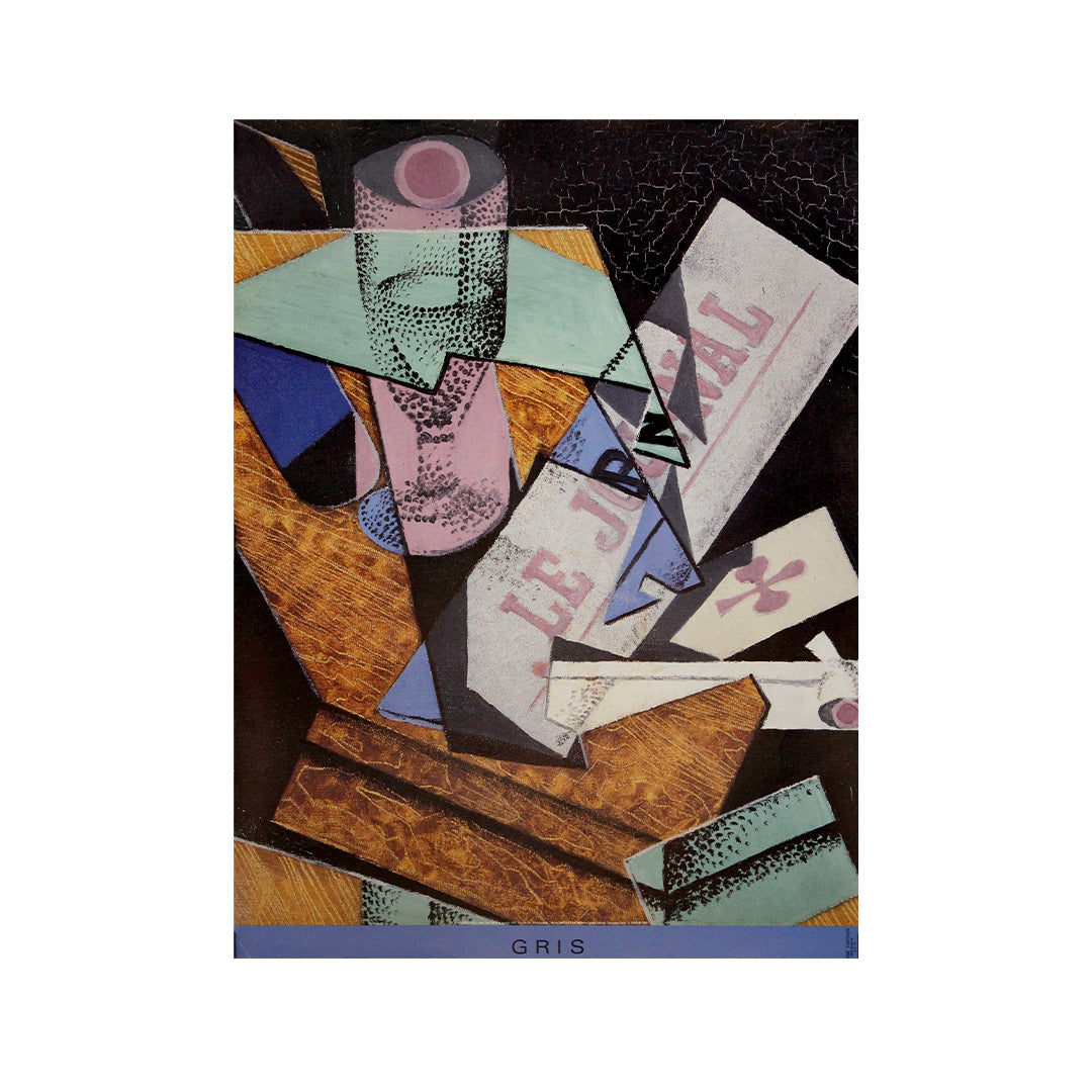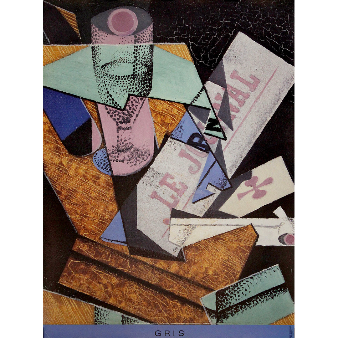 L'affiche reproduit sa nature morte cubiste, avec des plans superposés de textures de bois, une typographie fragmentée où l'on peut lire « Le Journal » , et des aplats de couleurs simplifiés : rose, turquoise, ocre et noir profond. Elle évoque la vision à la fois analytique et poétique qui caractérisait l'œuvre de Gris, où les objets du quotidien sont réassemblés en compositions abstraites harmonieuses.