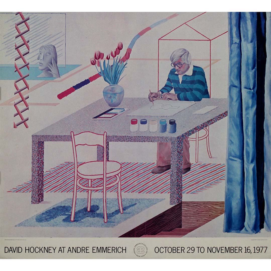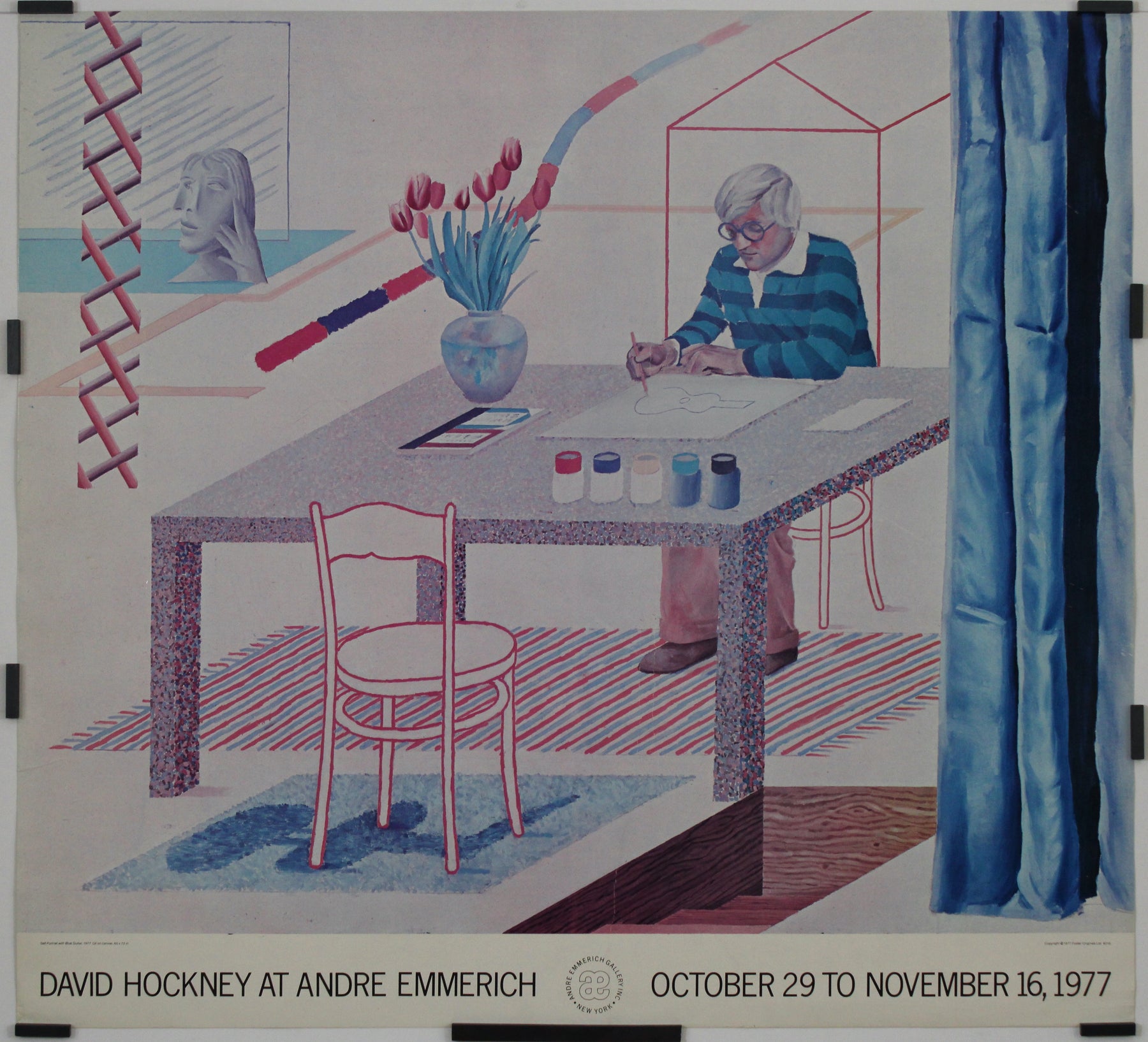 L'affiche originale de l'exposition de 1977 présentant « Autoportrait à la guitare bleue » de David Hockney à la galerie André Emmerich de New York est une œuvre captivante qui résume à merveille le talent artistique et le style distinctif de Hockney.